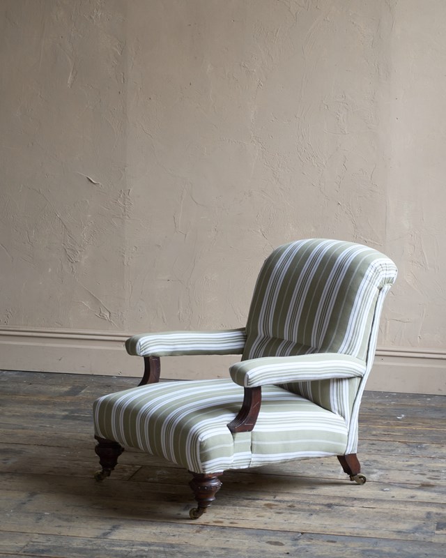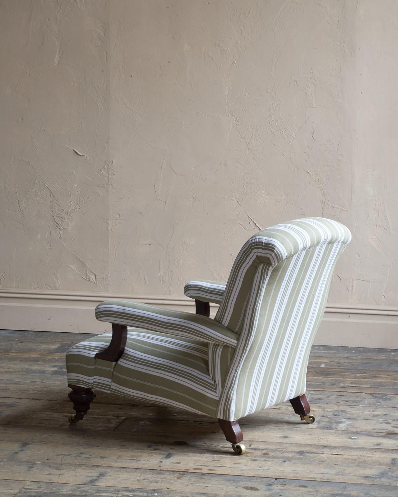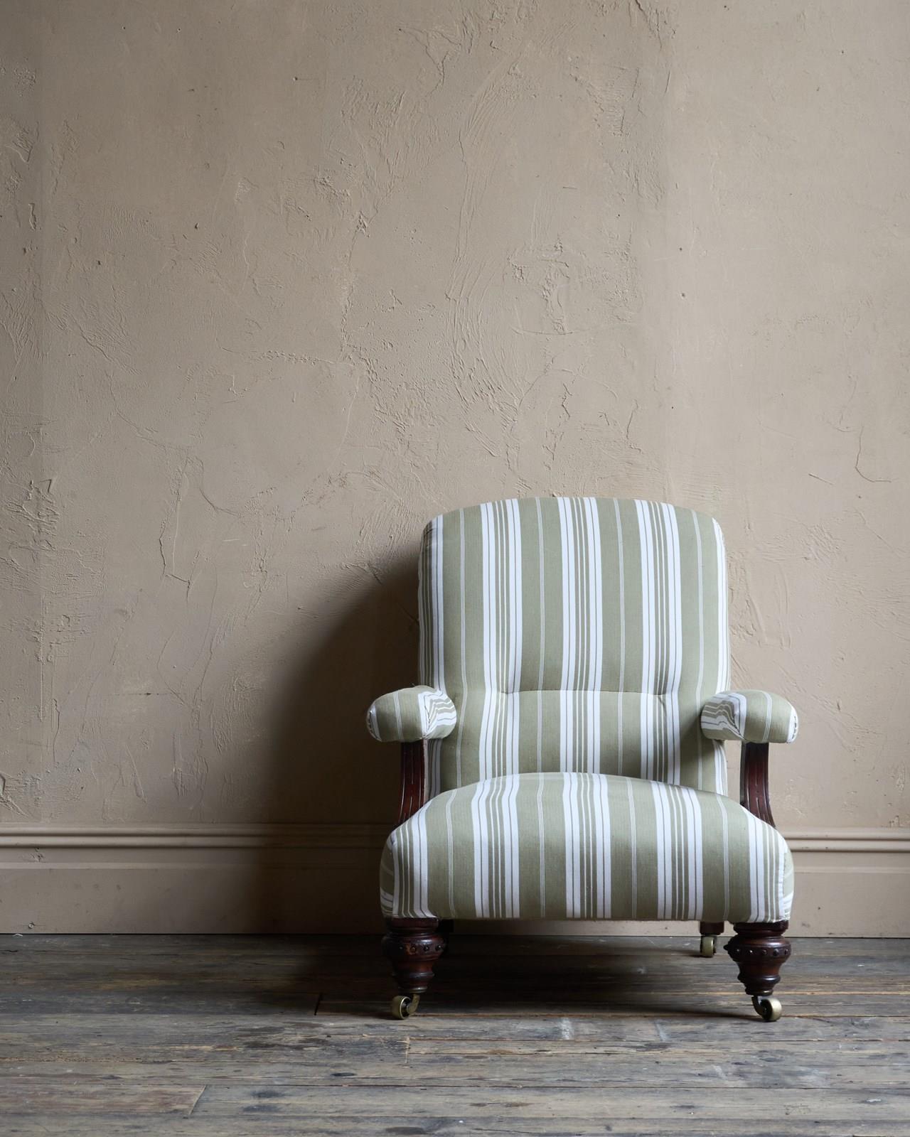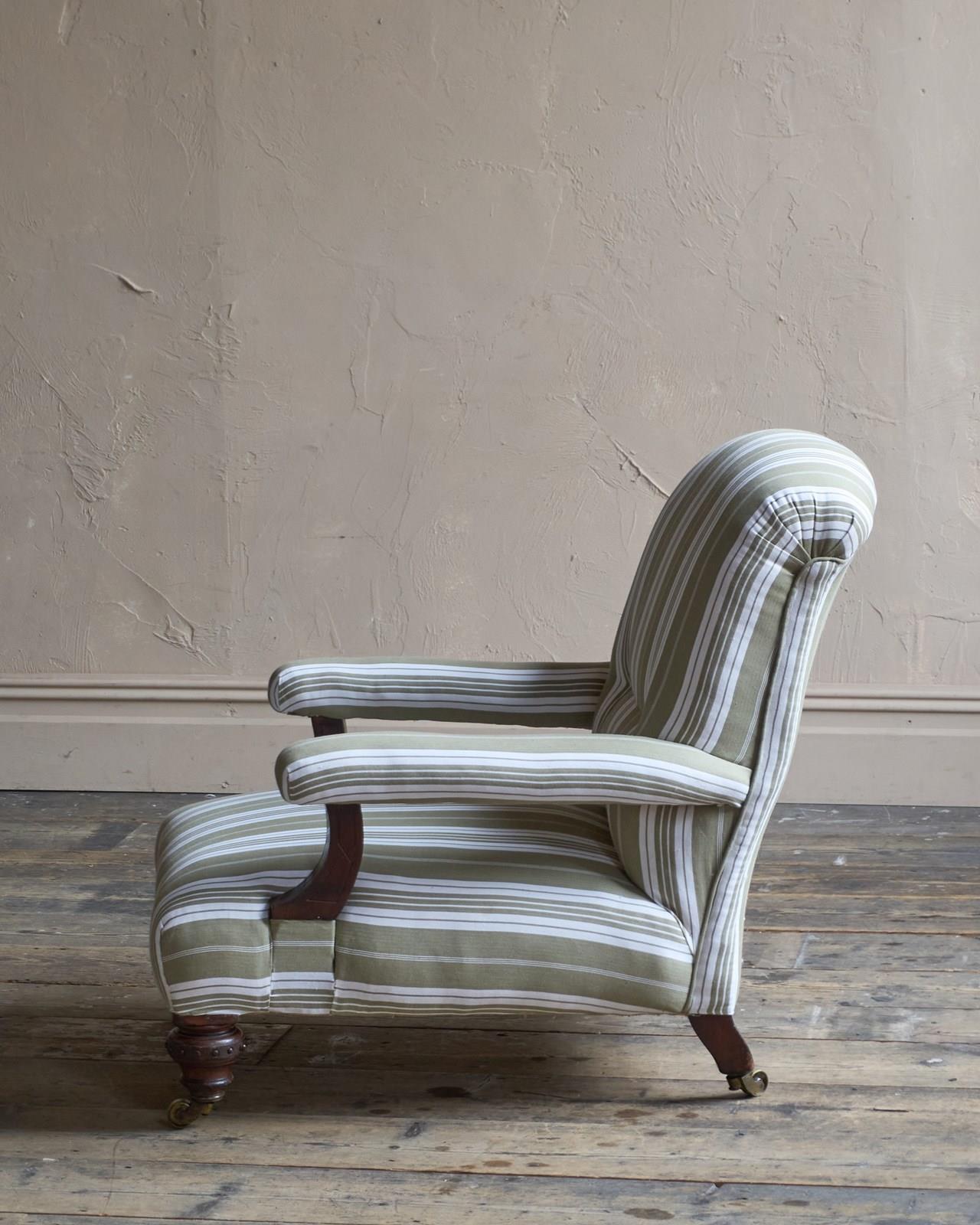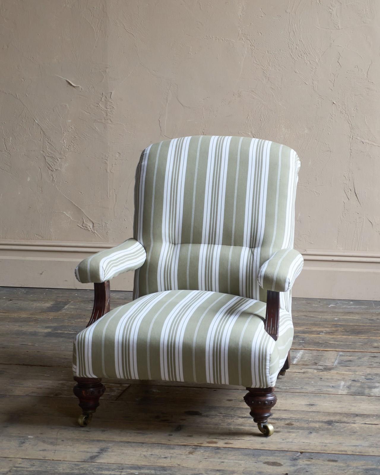 The chair has been lined with a browny-green striped linen ticking, making it ready for an uncomplicated upholstery job.