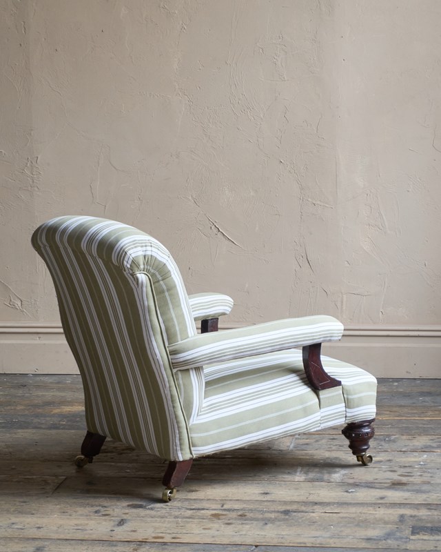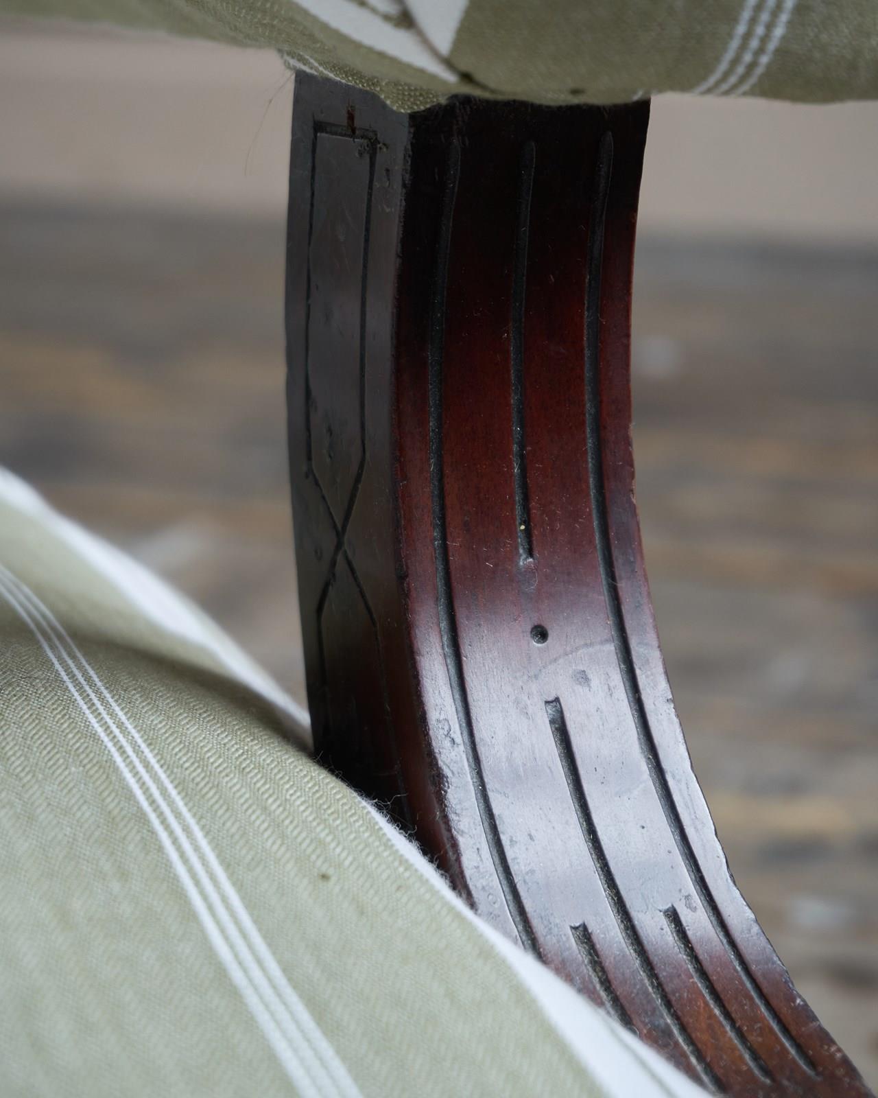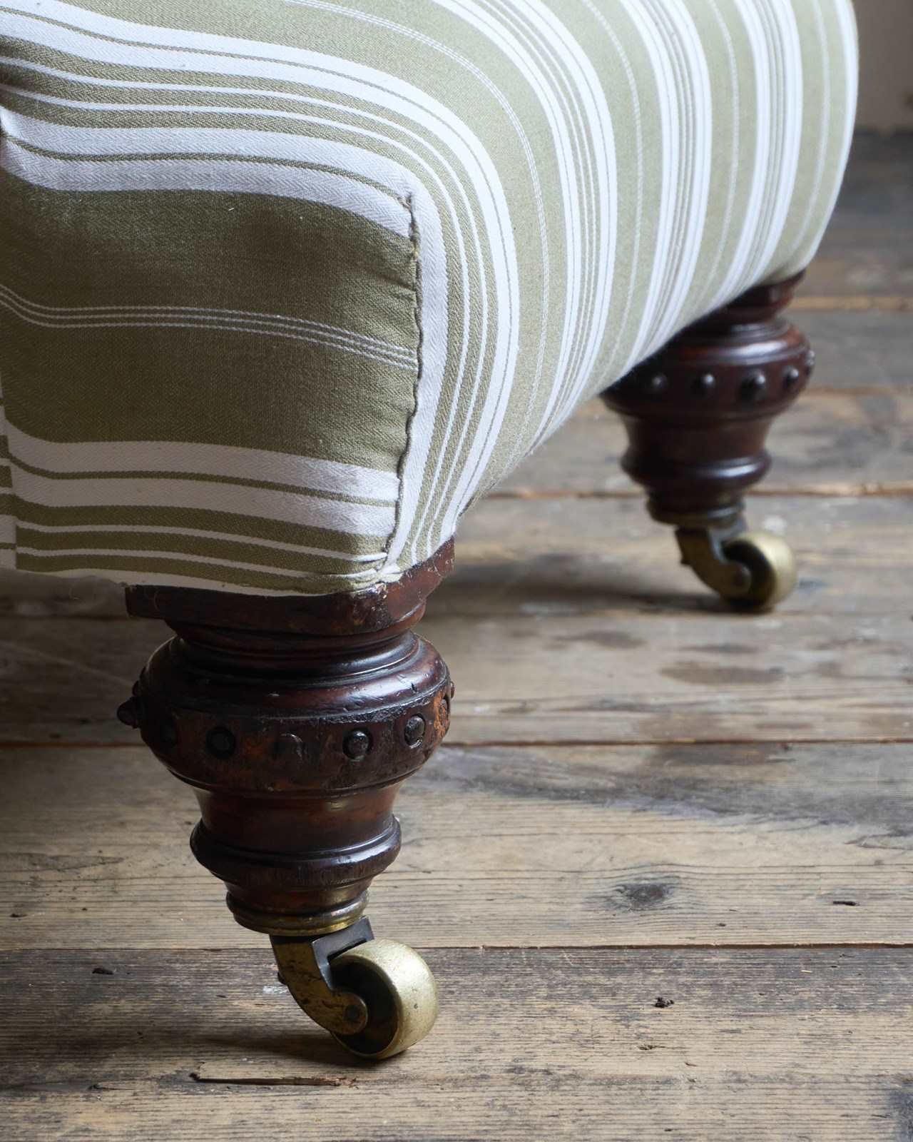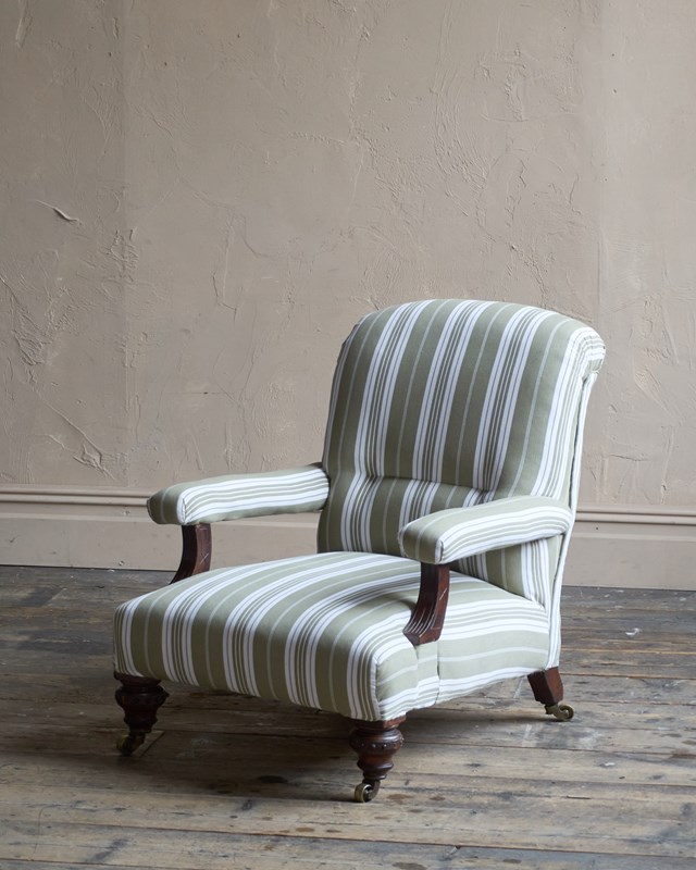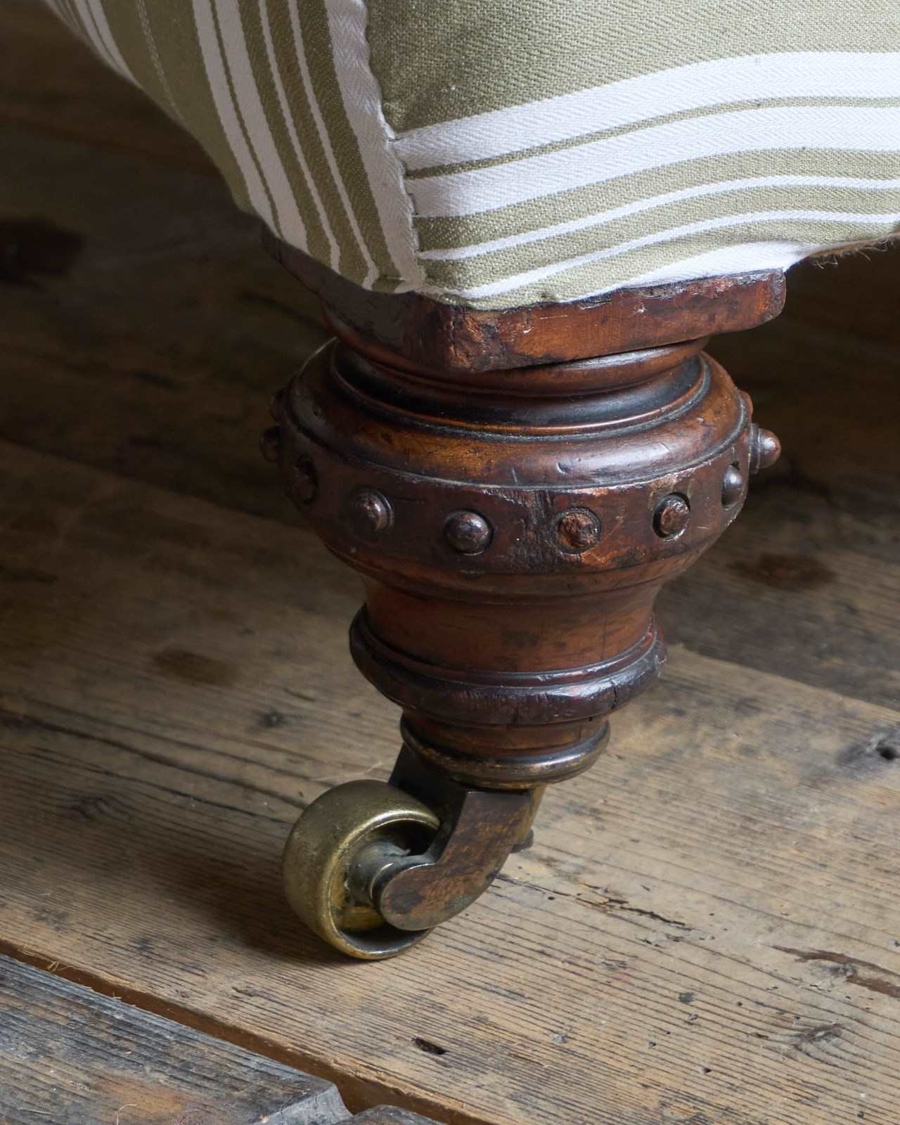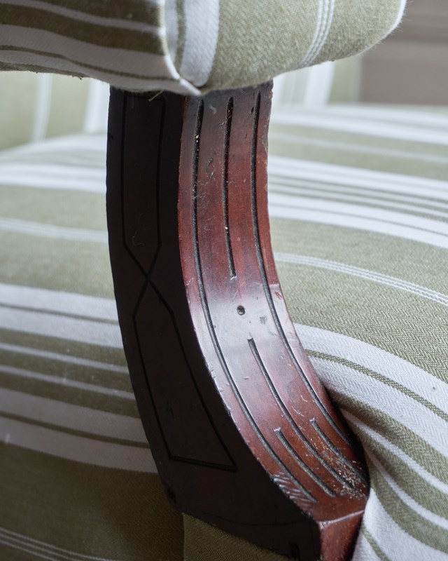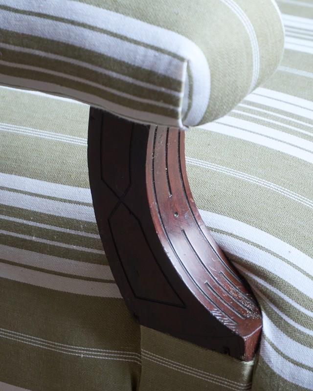 The chair has been lined with a browny-green striped linen ticking, making it ready for an uncomplicated upholstery job.