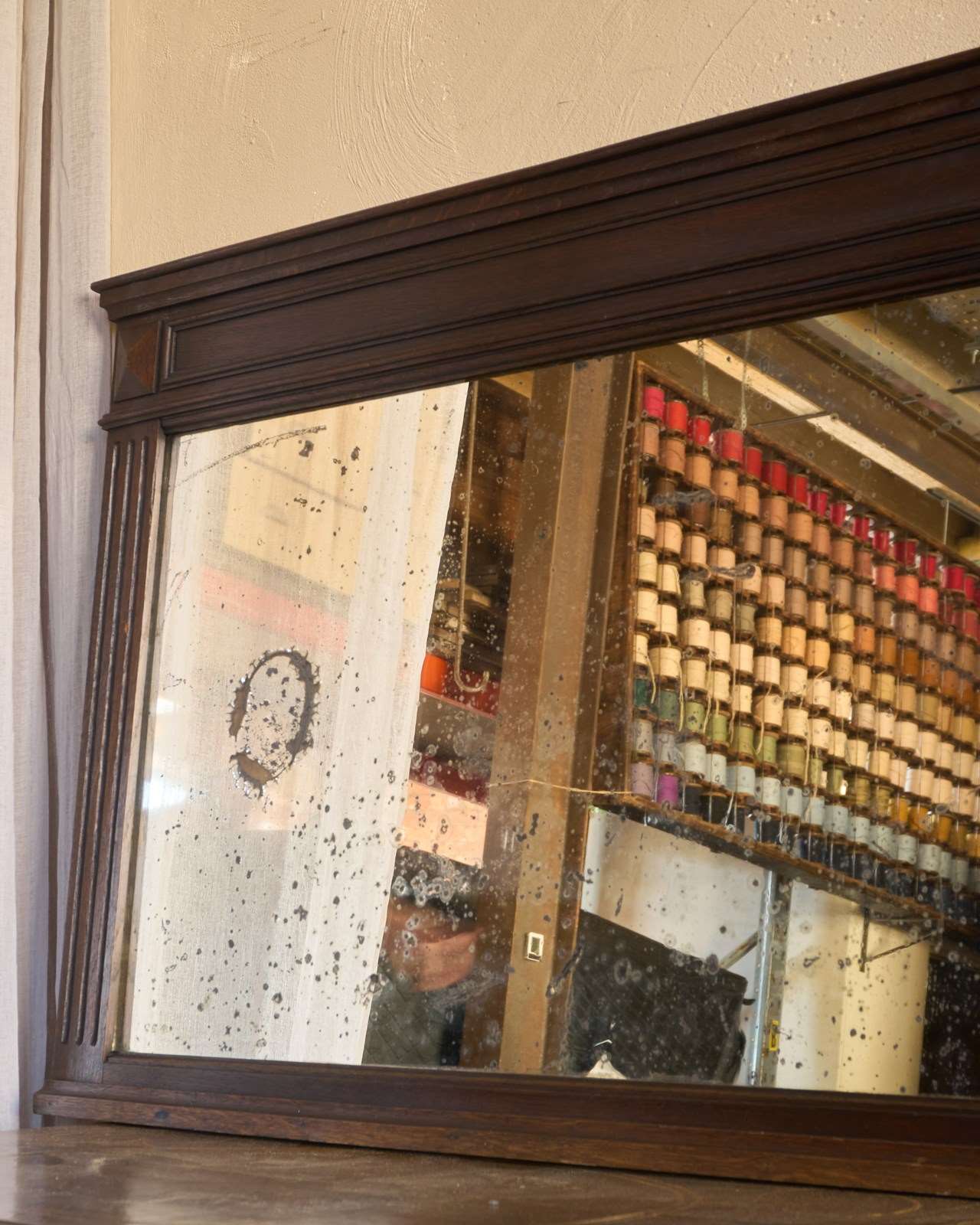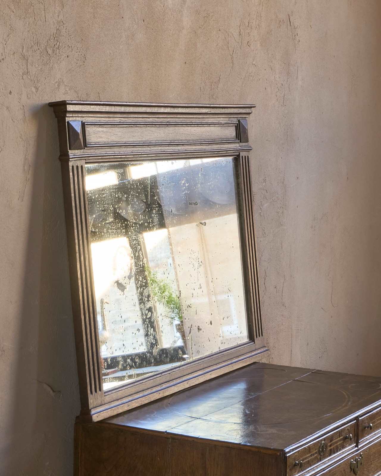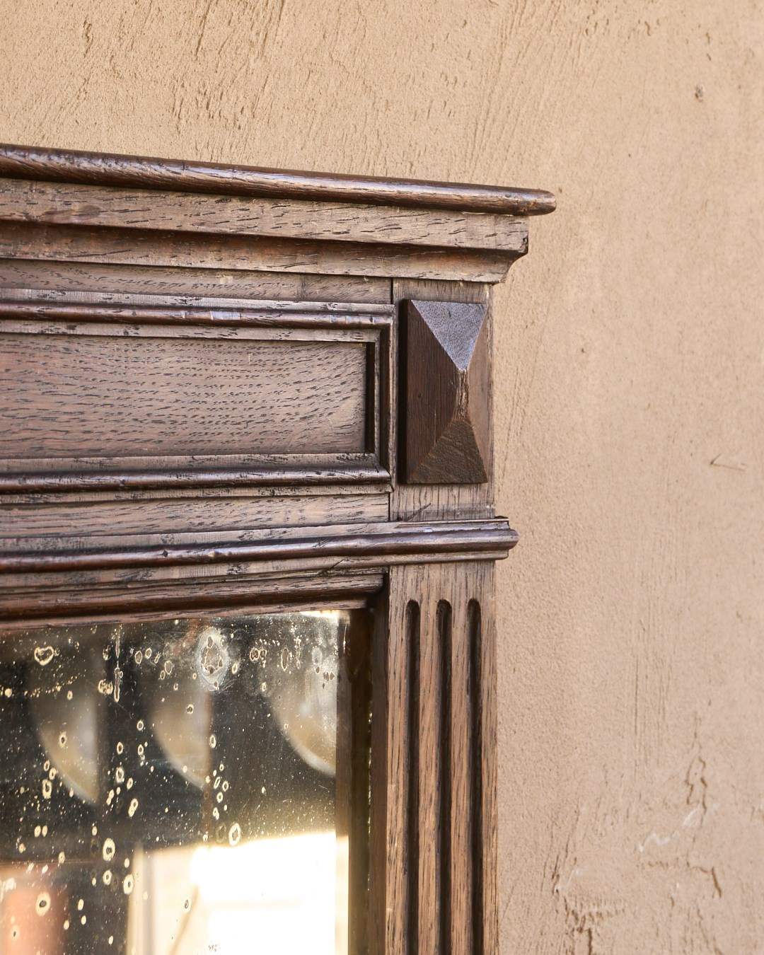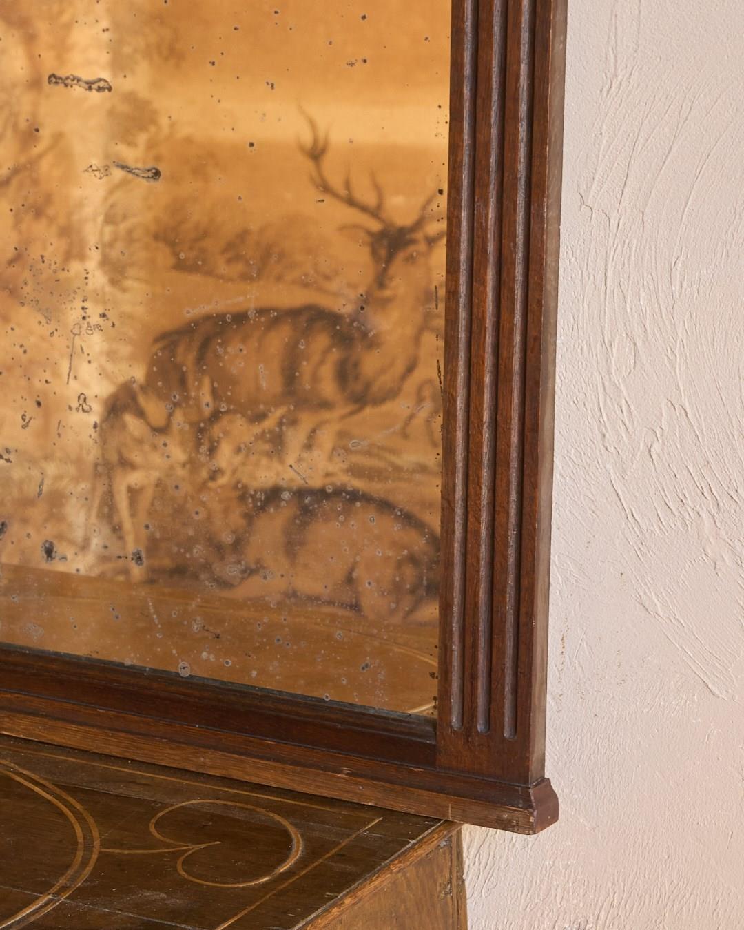 A French oak mantle mirror with foxing.