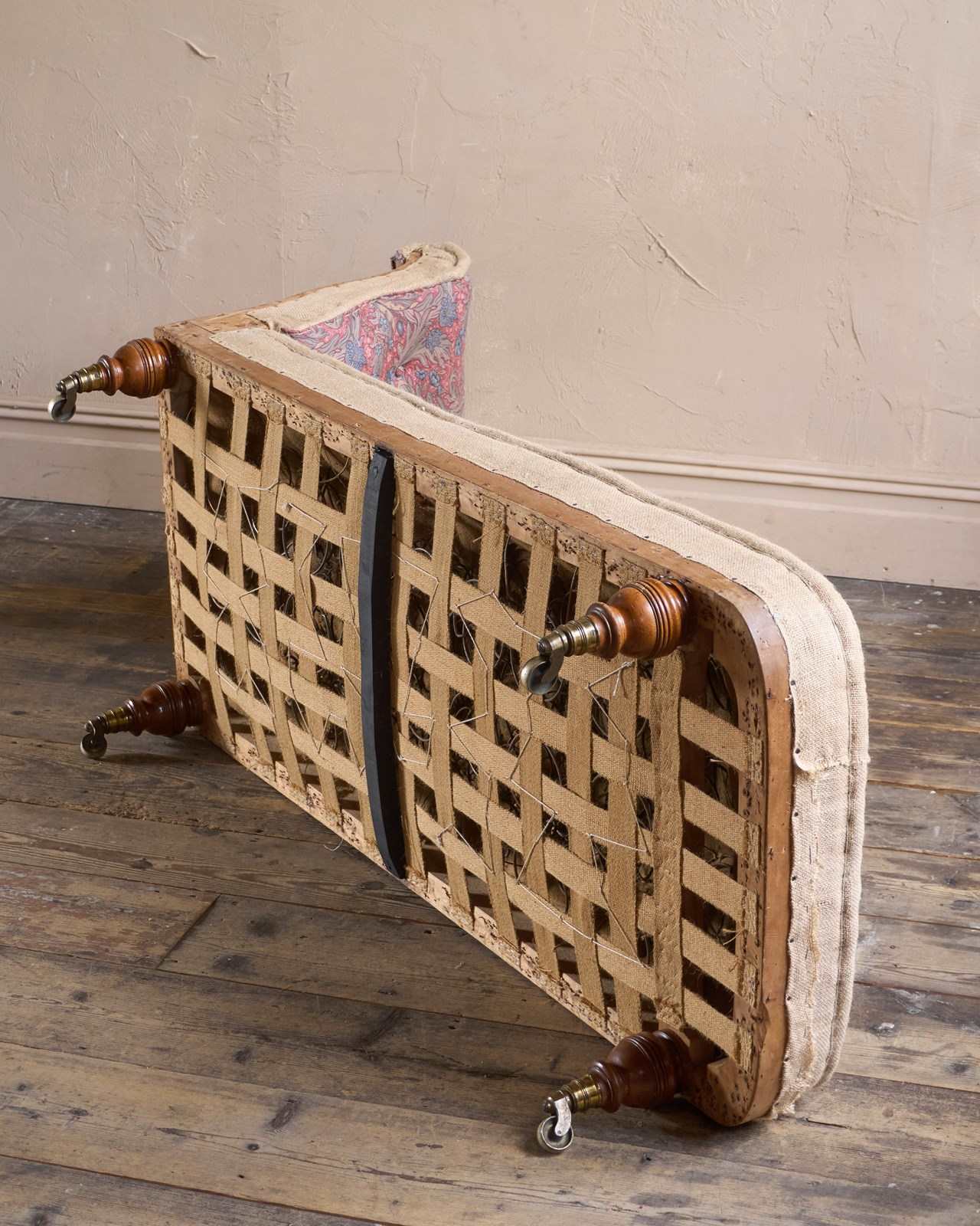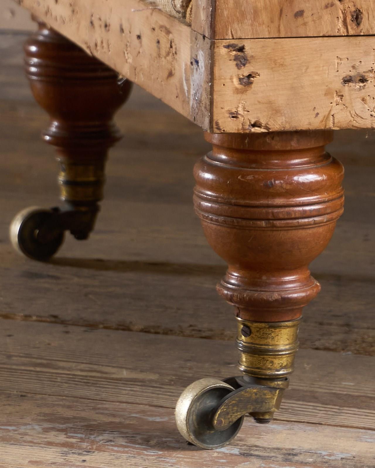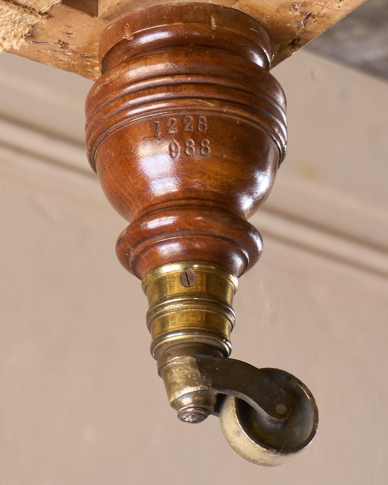 Solid hardwood frame and solid mahogany legs which are ring turned and with the original ring turned gilt brass cup castors to all legs.