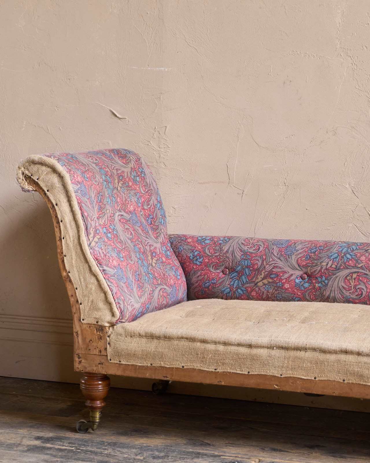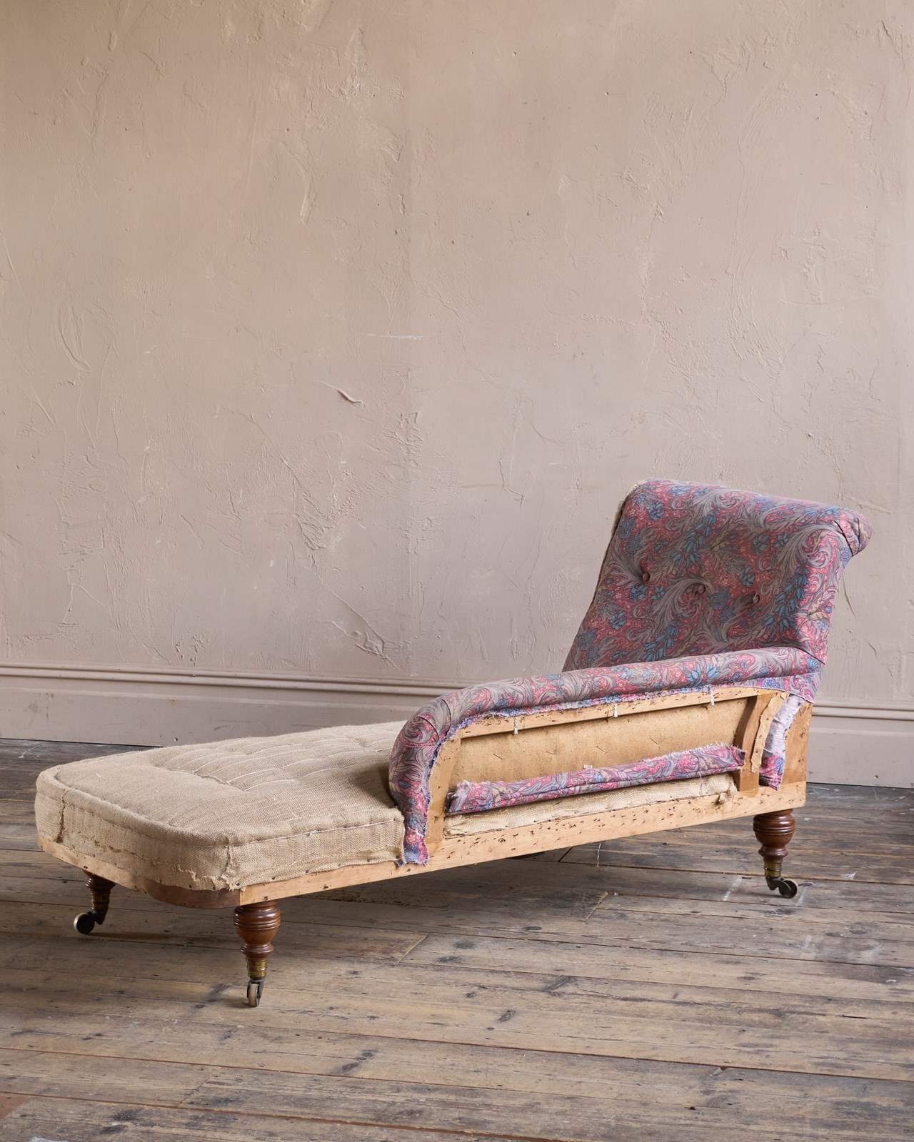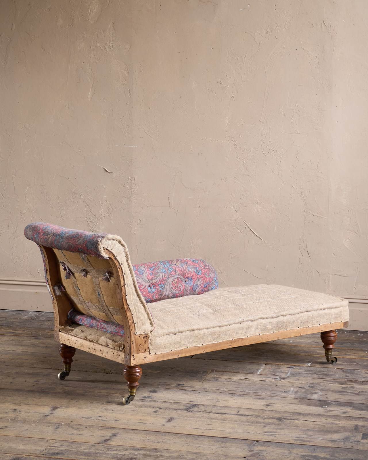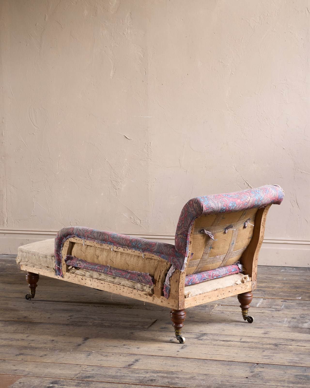 Solid hardwood frame and solid mahogany legs which are ring turned and with the original ring turned gilt brass cup castors to all legs.