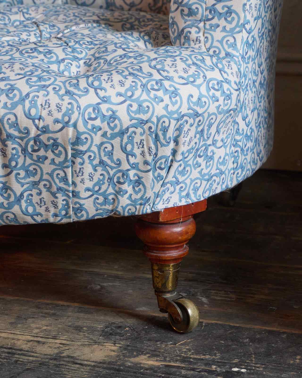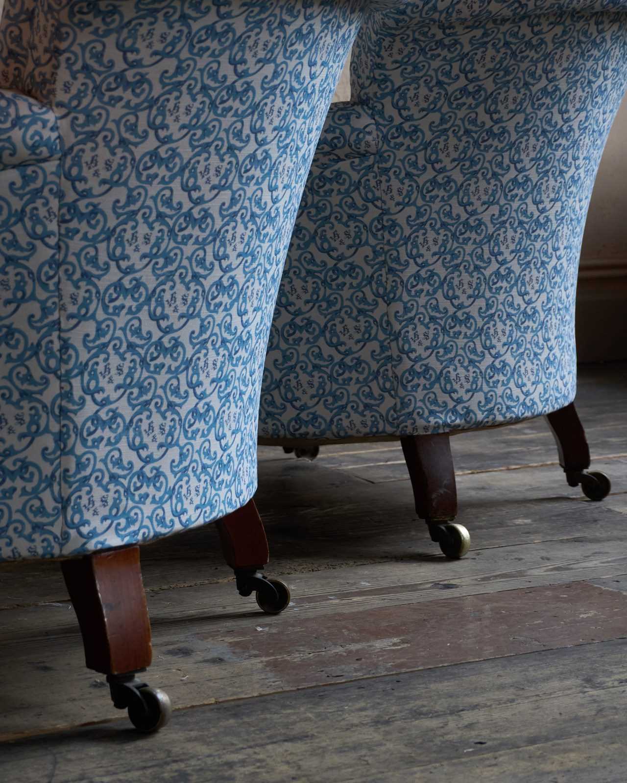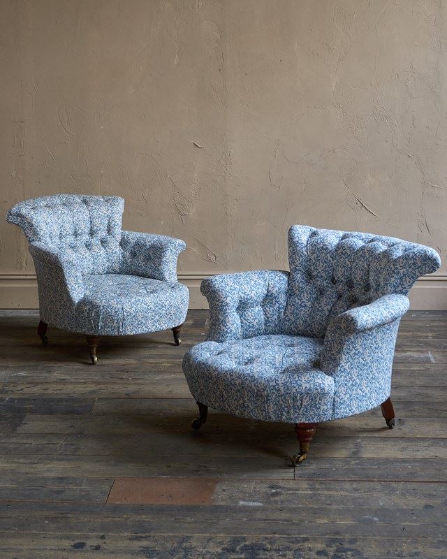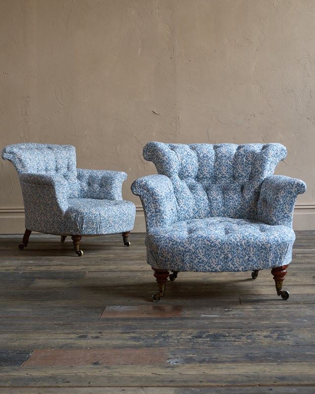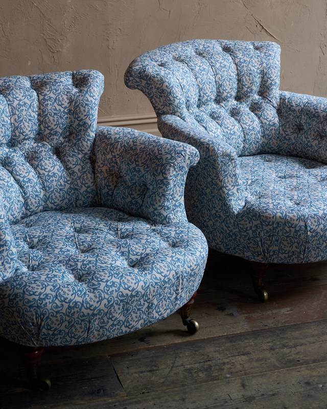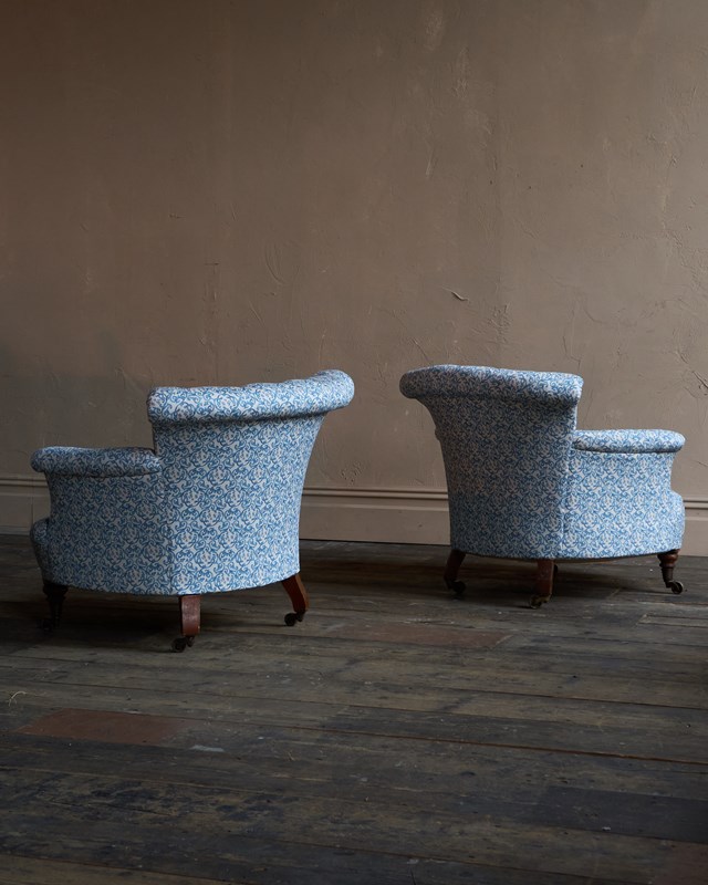 A Pair Of Early Howard And Sons Armchairs In Blue H&S Ticking