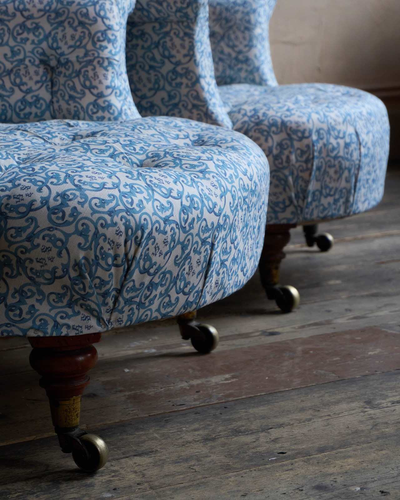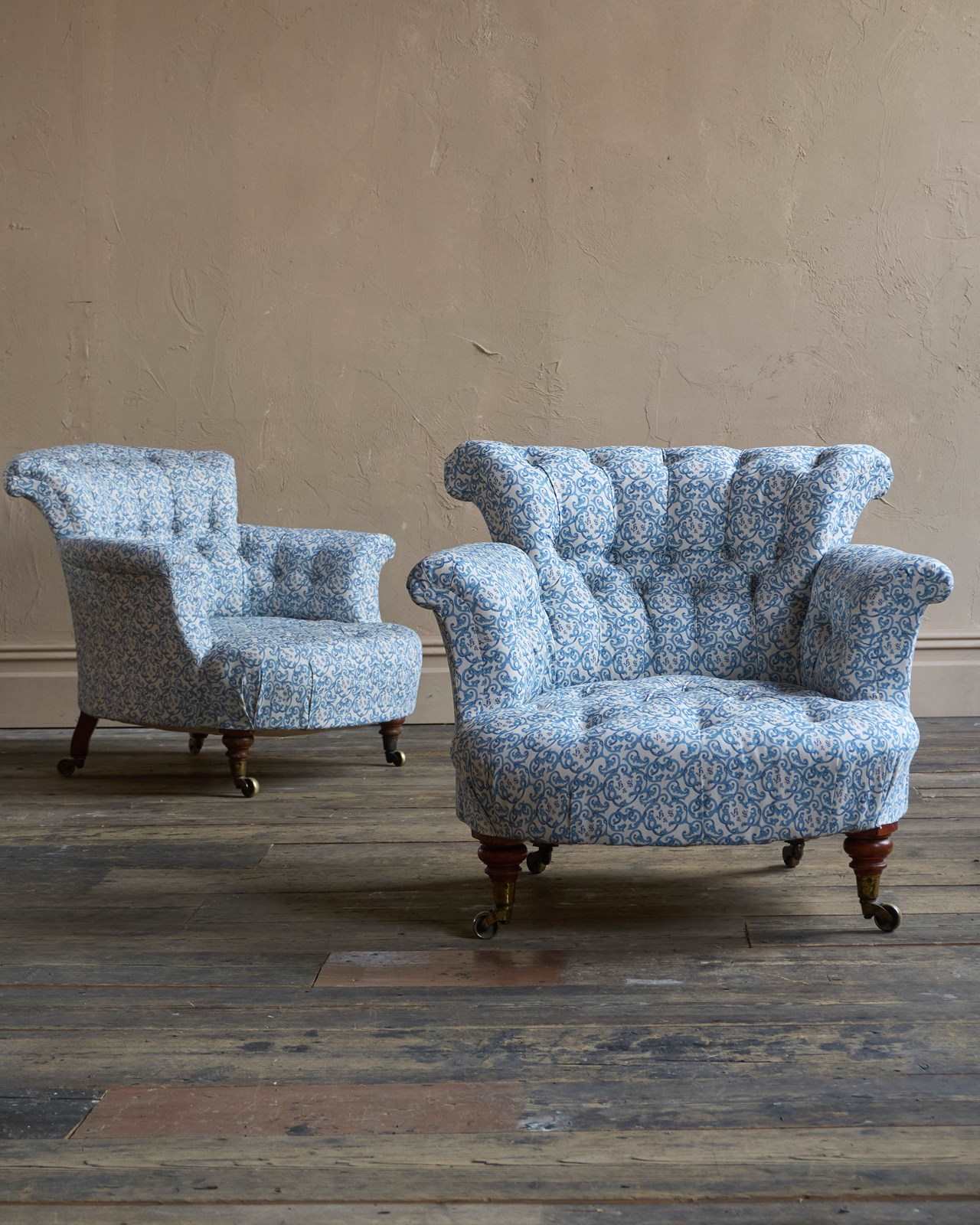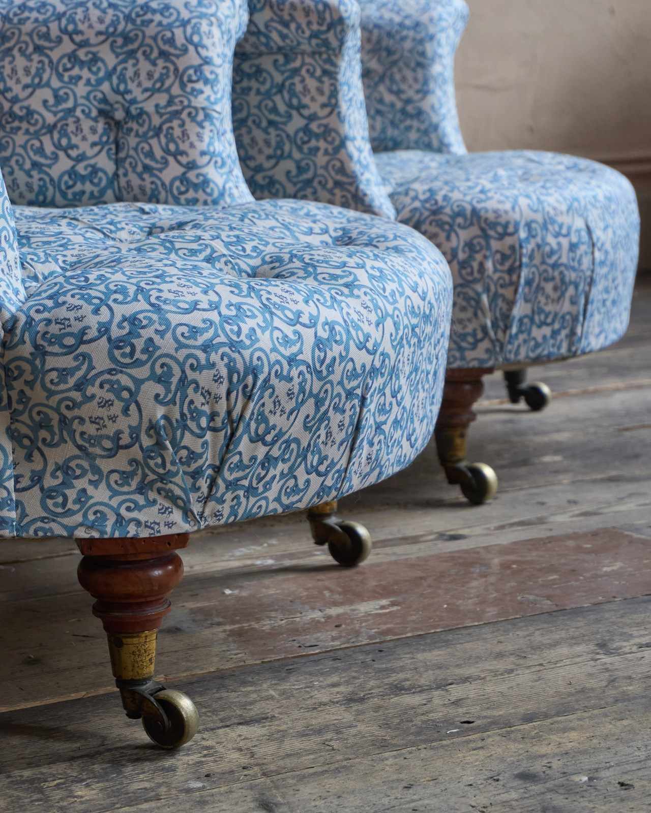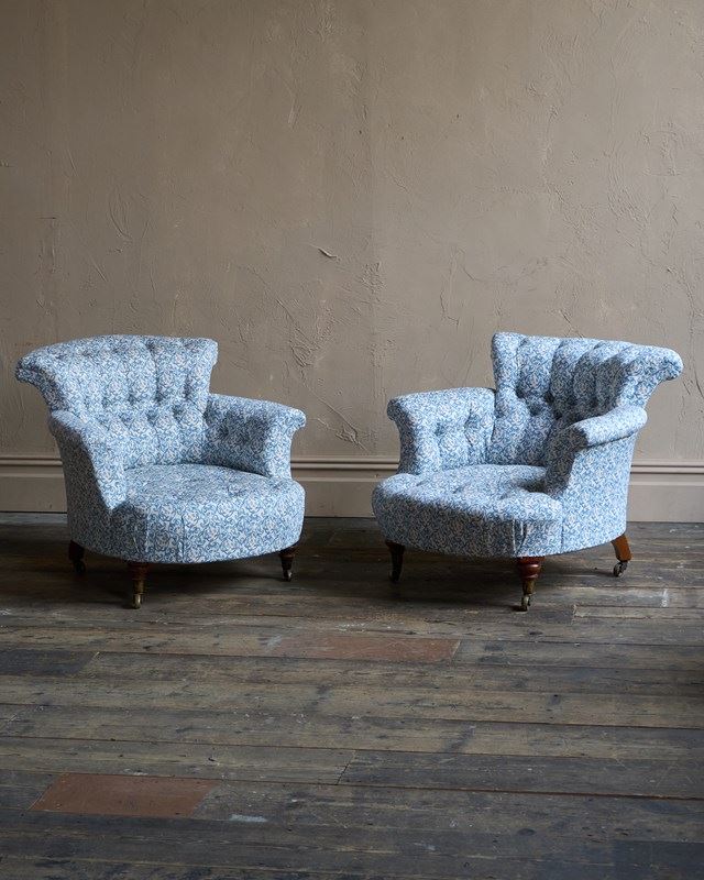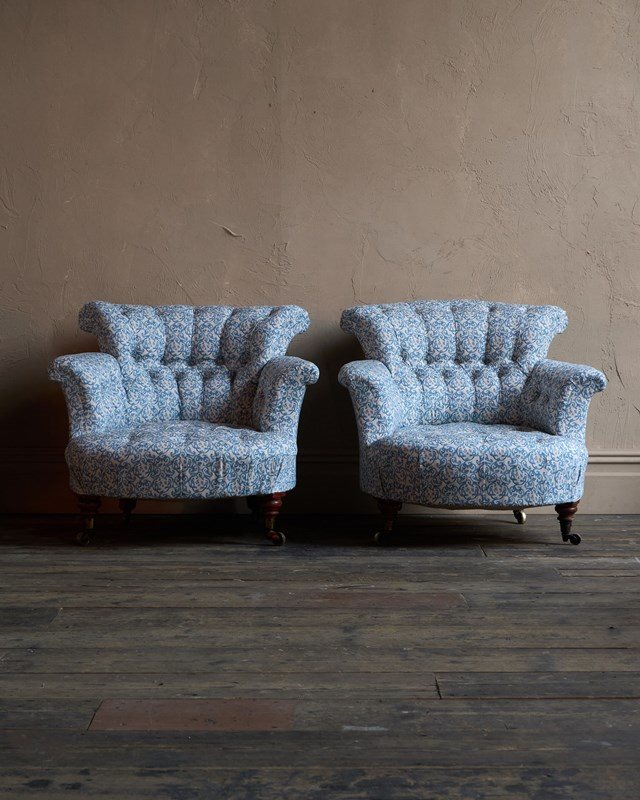 A matched pair of 19th century Howard & Sons armchairs, raised on Howard's uniquely turned walnut legs and retaining the original Cope & Collinson brass gilt castors.