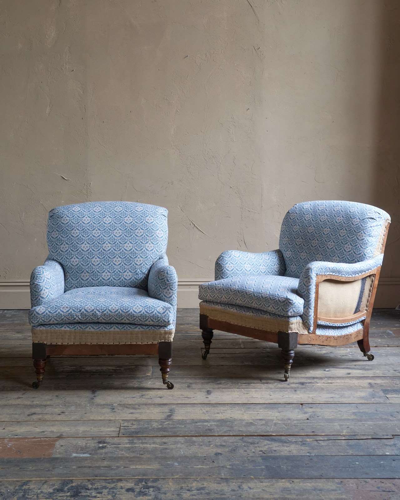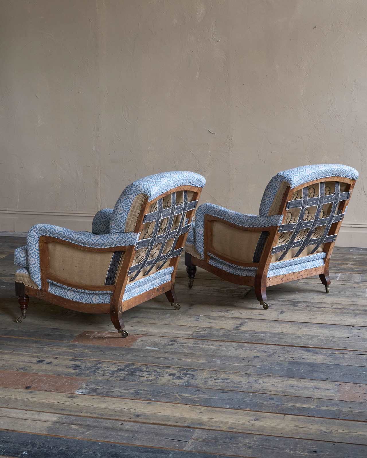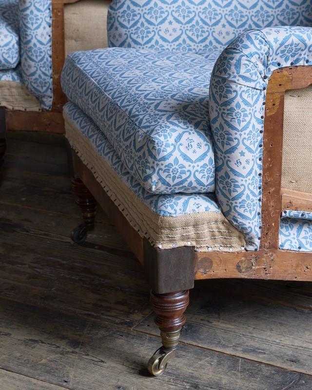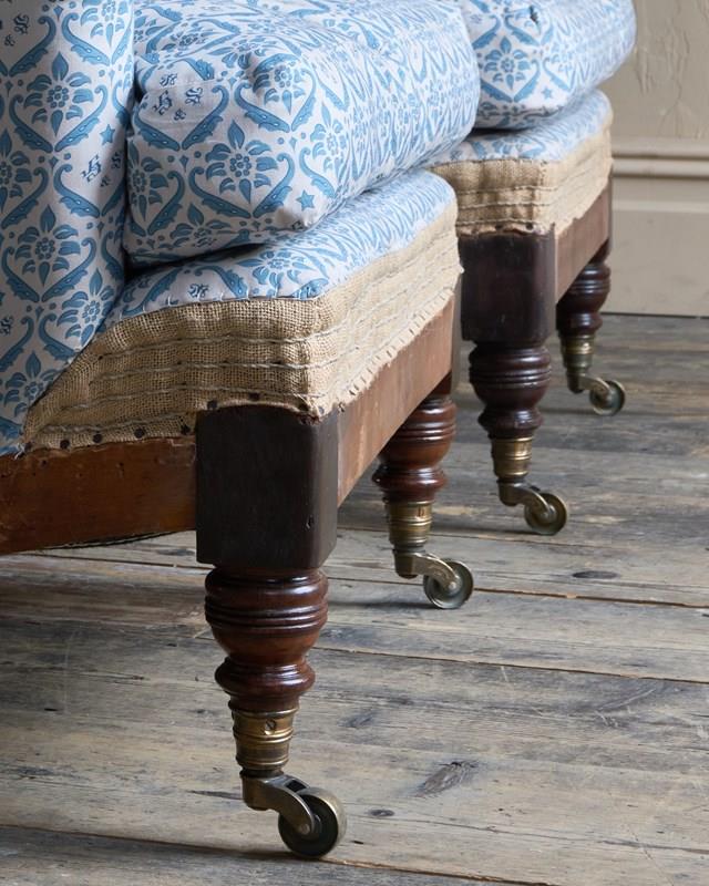 Fully Restored and Traditionally Upholstered from the frames up, having sprung seats and backs, horsehair fillings to the seat and arms and a siege de duvet feather filled back rest with feather and down cushions. All this skilled hand stitched and hammer tacked work has been left on display.