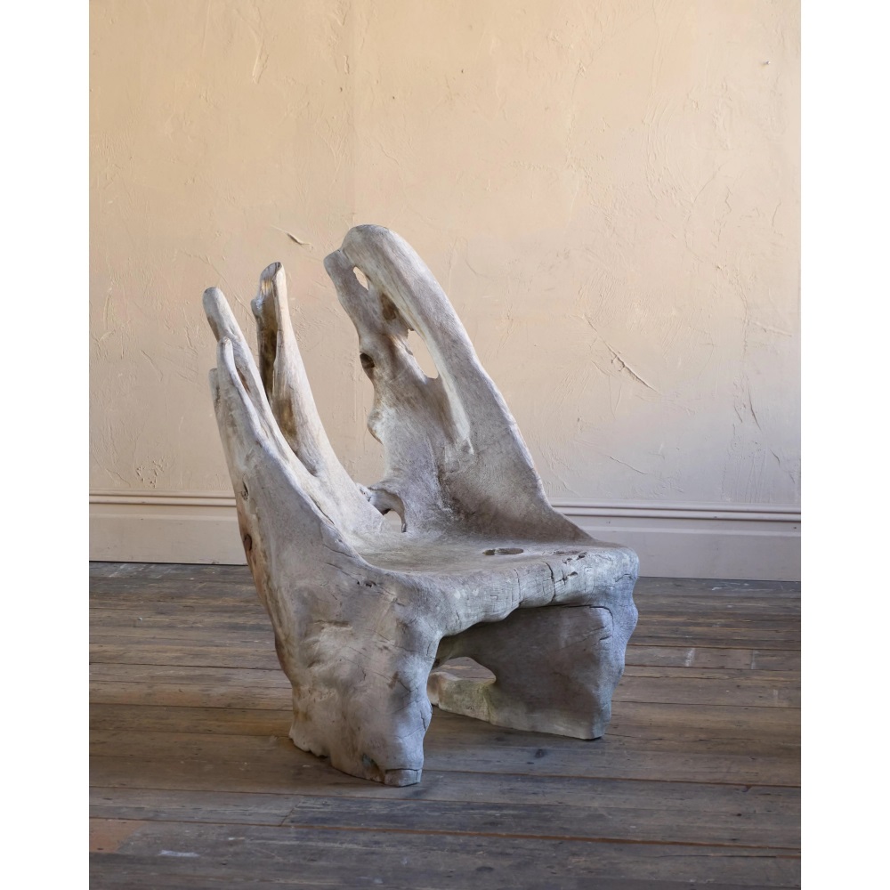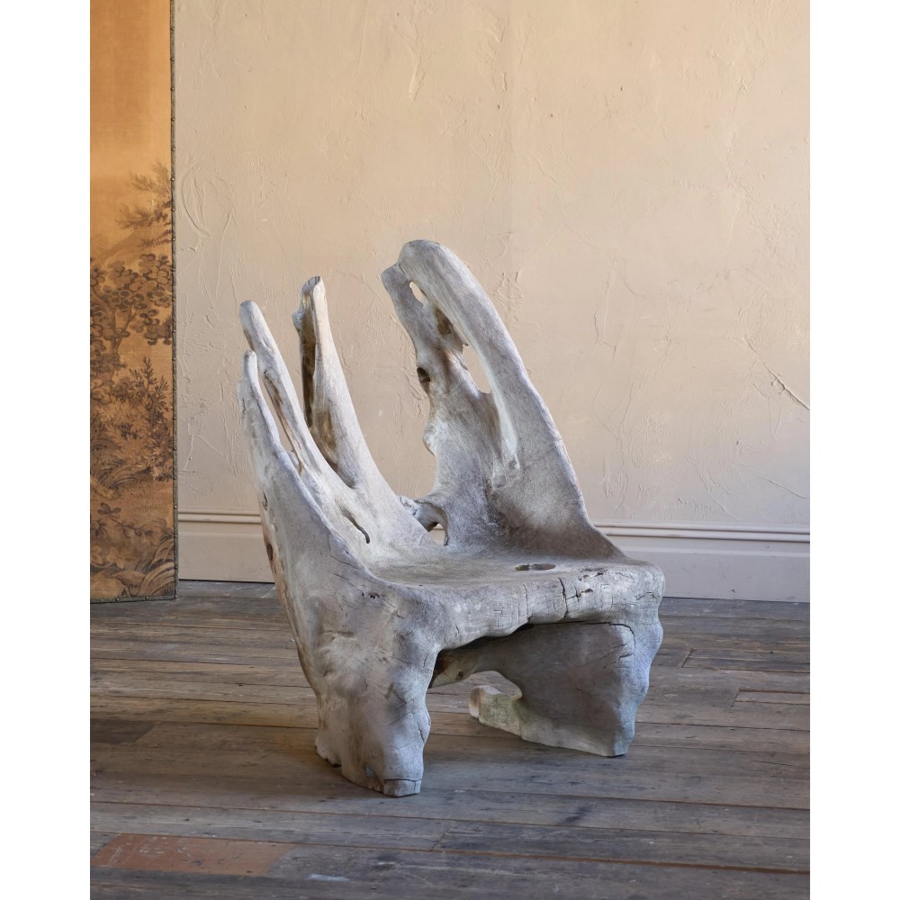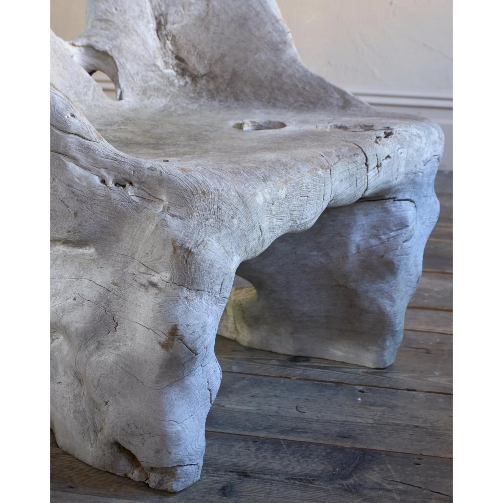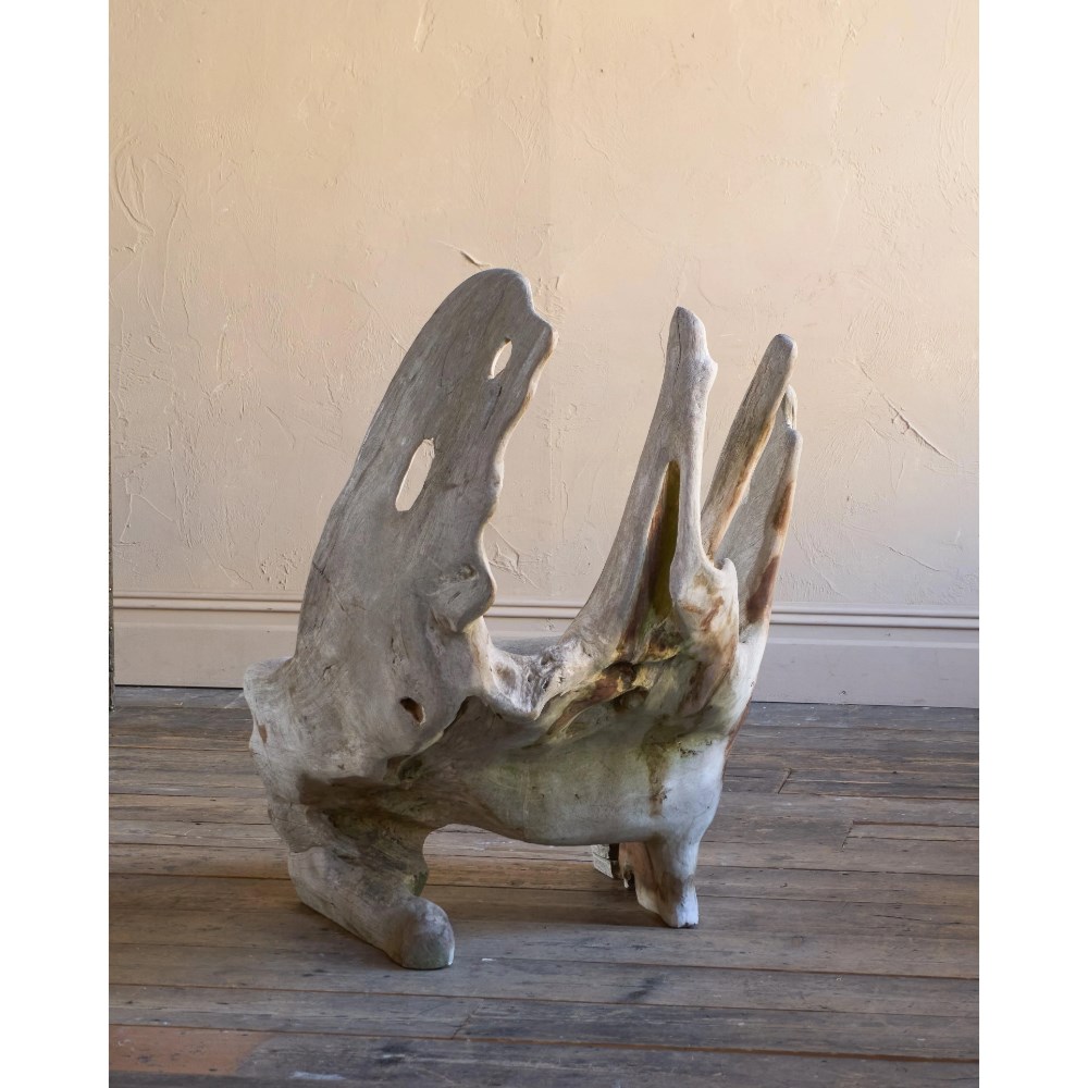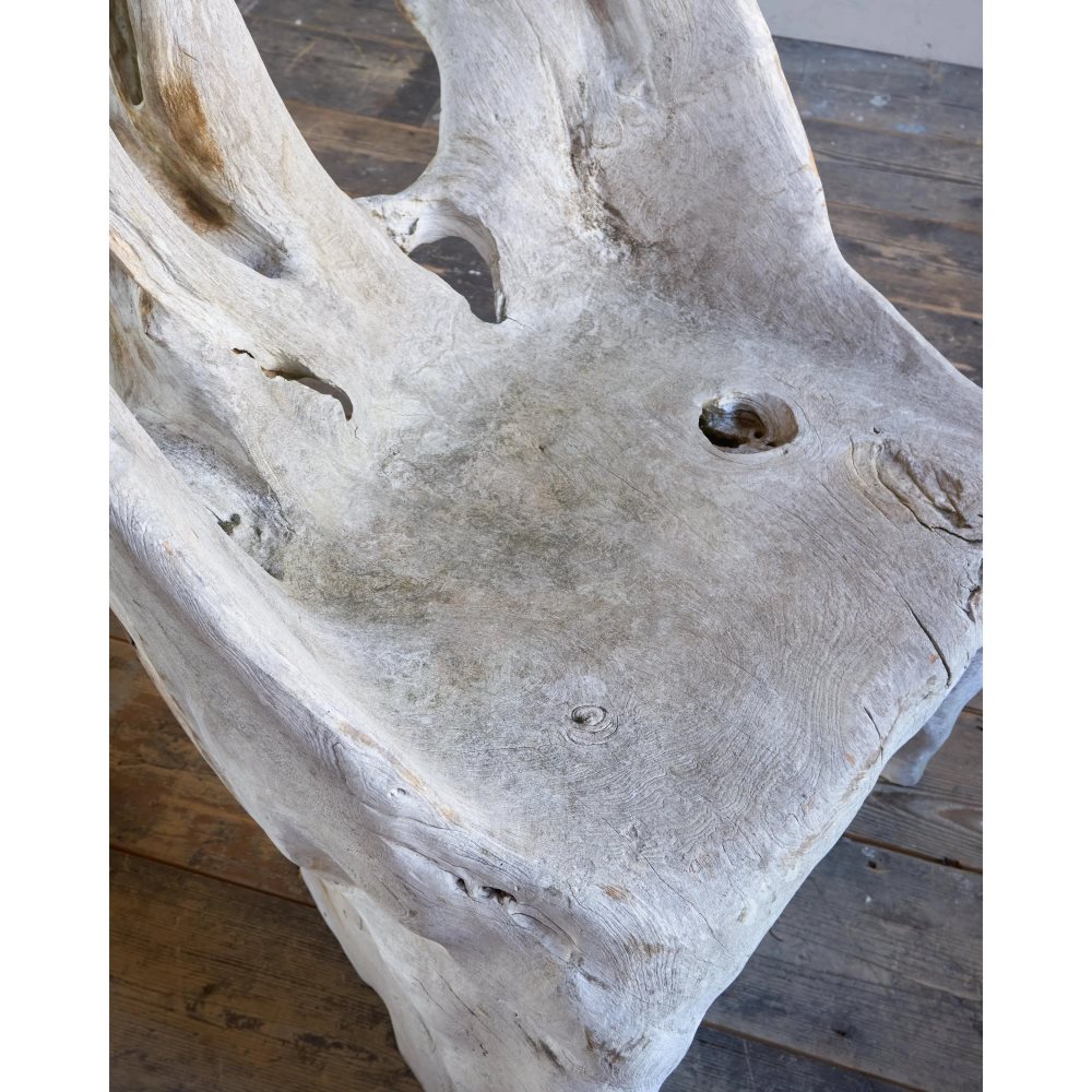 Made from a solid teak root ball, this incredibly characterful chair is weathered by time by the elements and is now a silver grey colour.