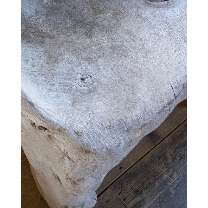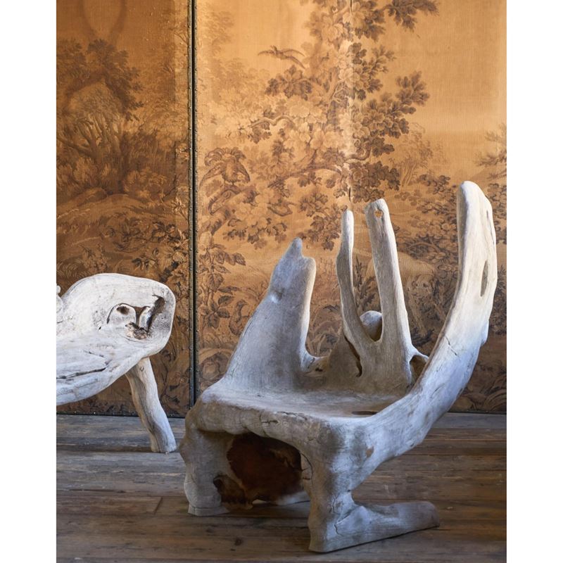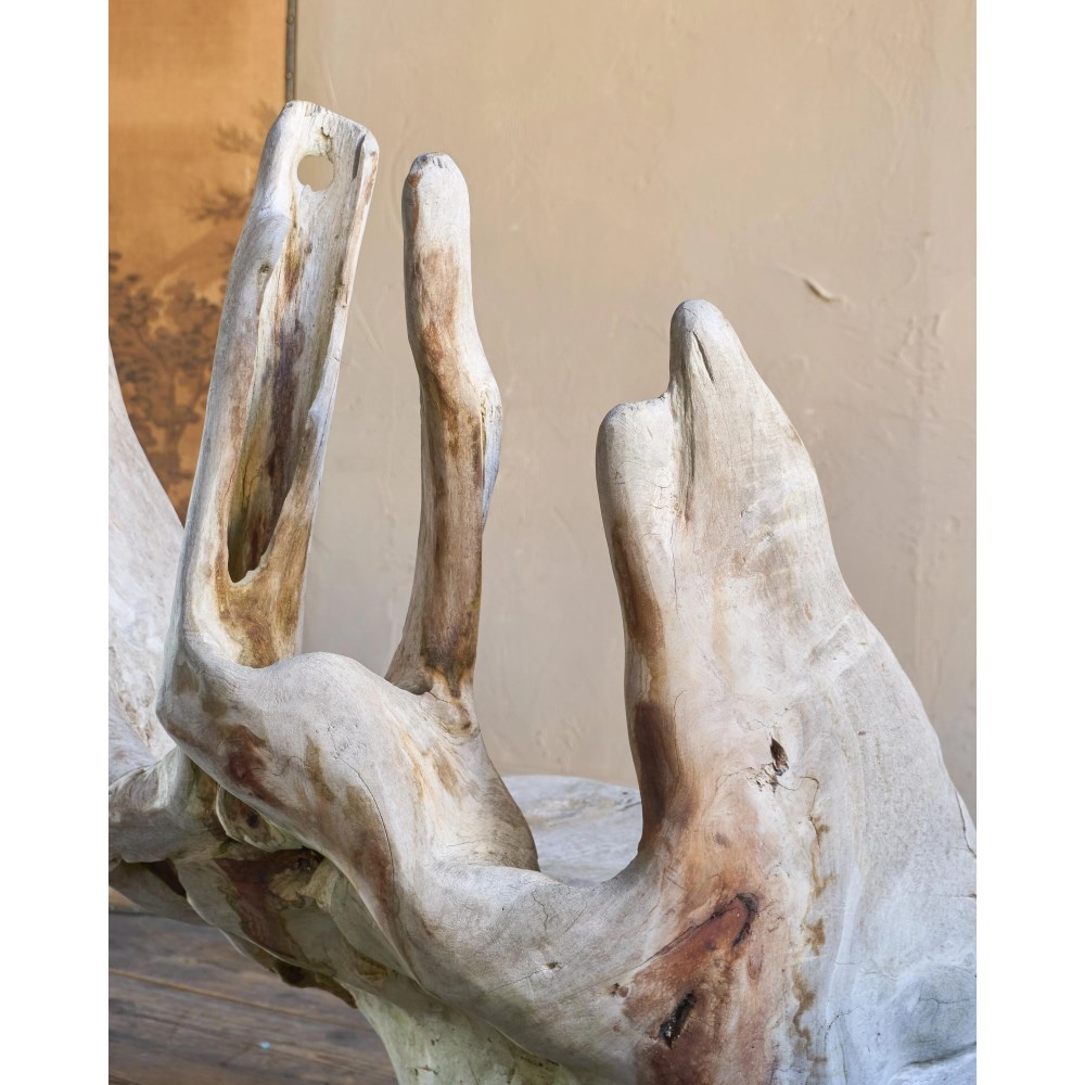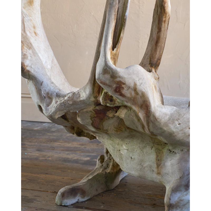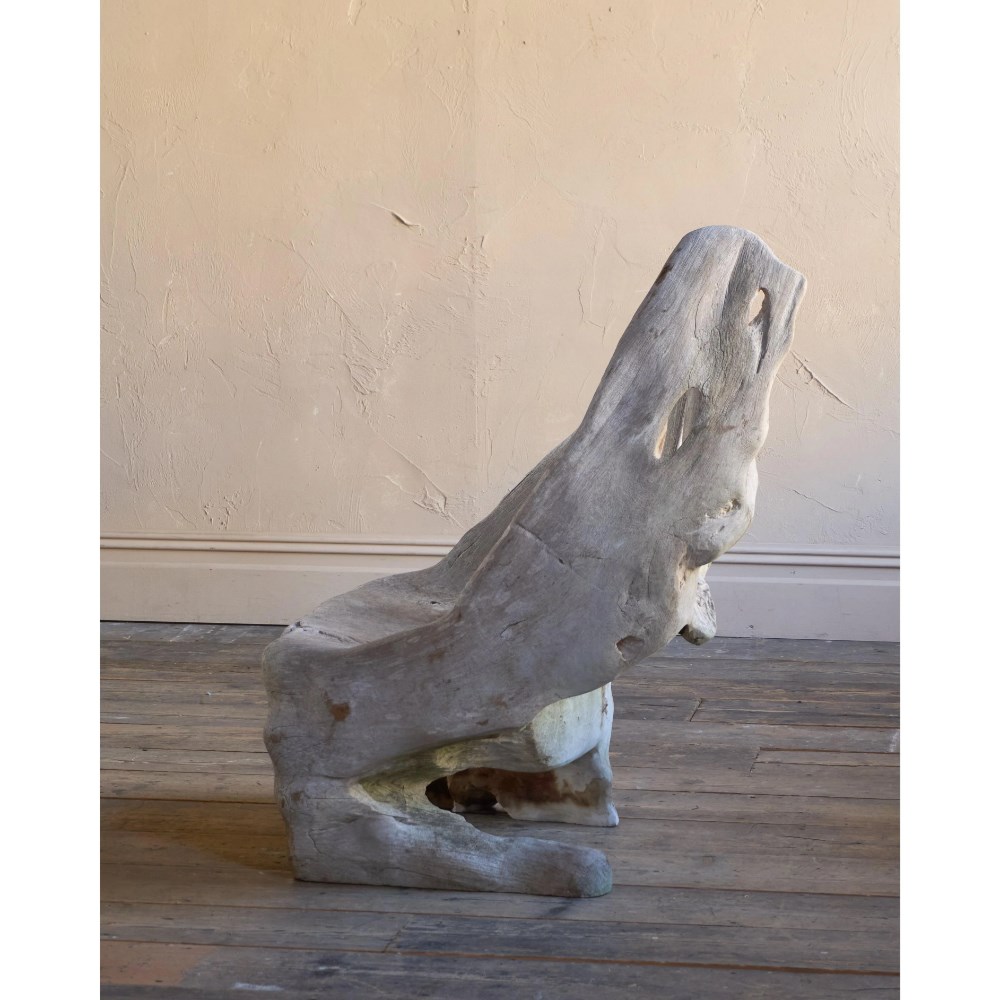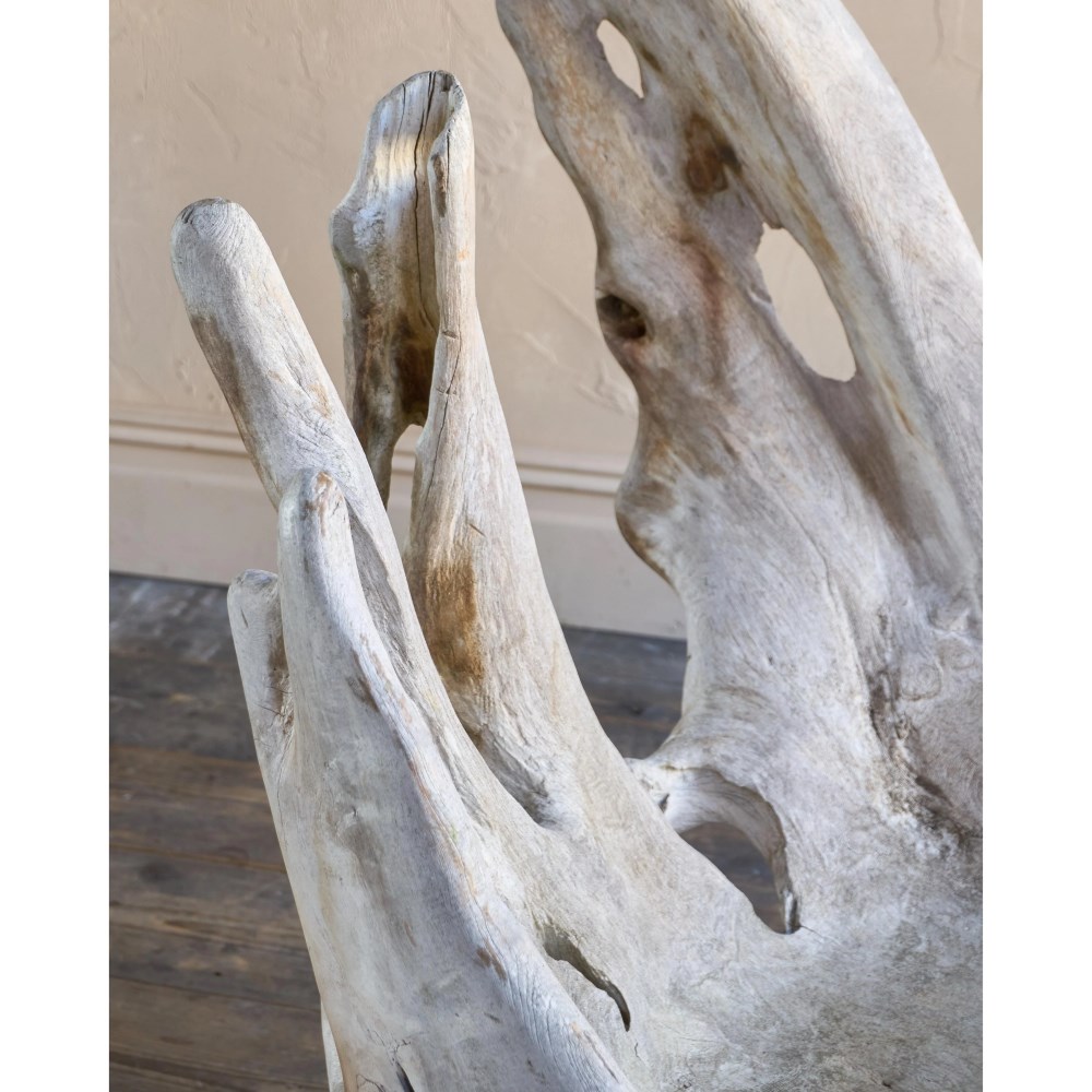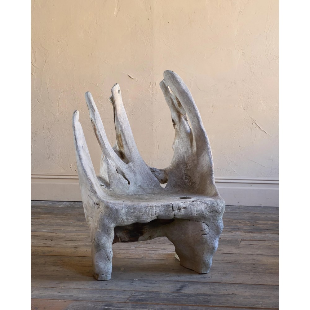Made from a solid teak root ball, this incredibly characterful chair is weathered by time by the elements and is now a silver grey colour.