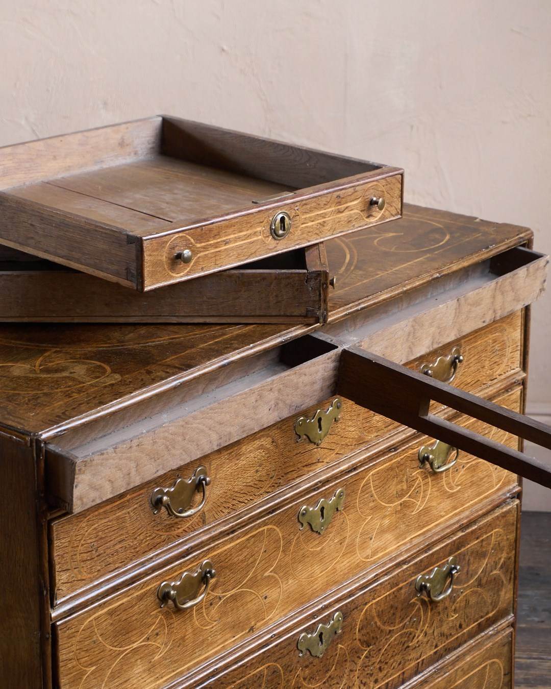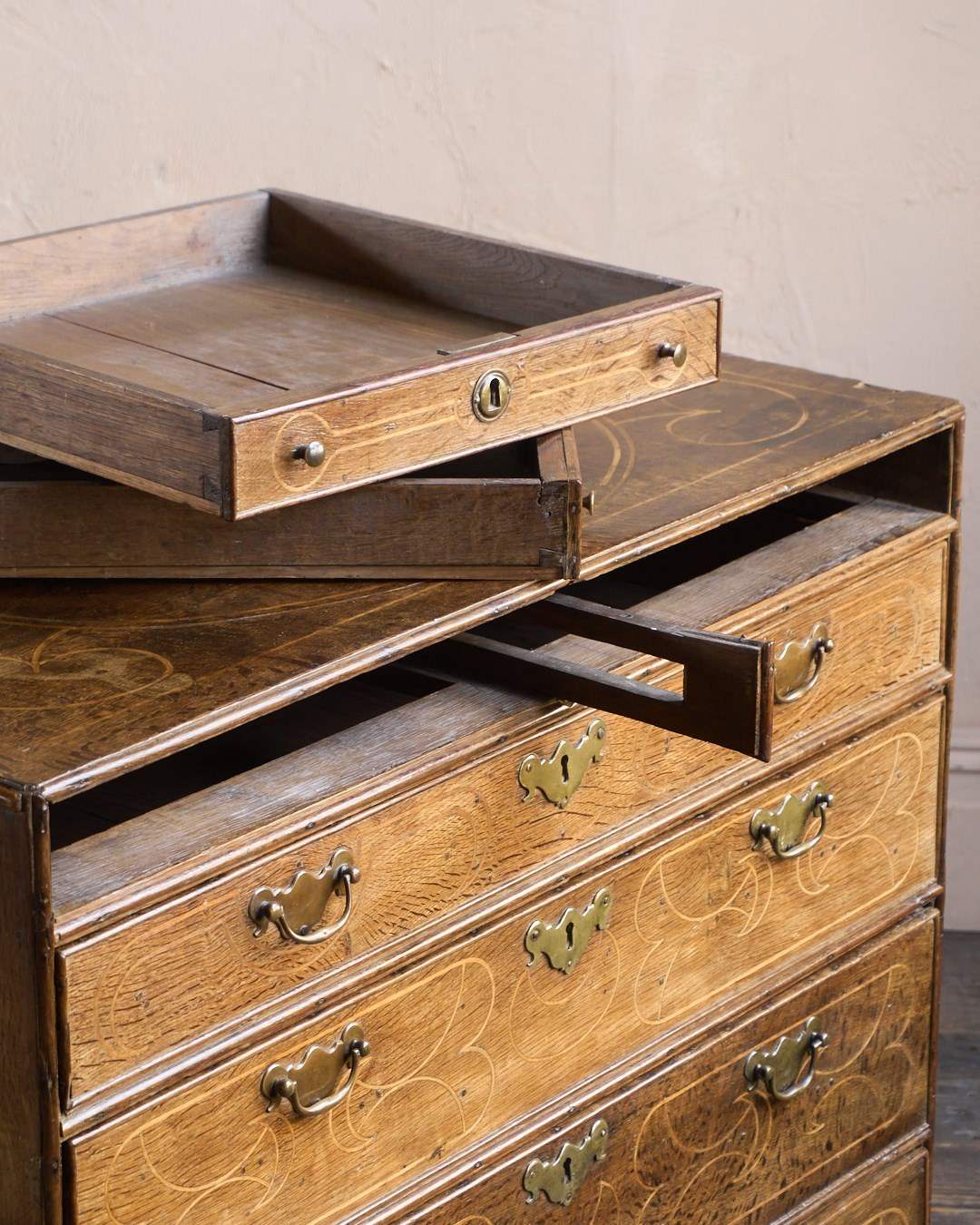 Made from solid English Oak and Inlaid with boxwood to the top and the drawer fronts, with small dowel peg details to the drawer fronts.