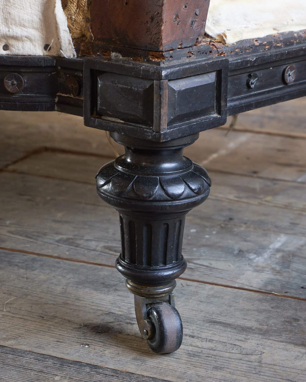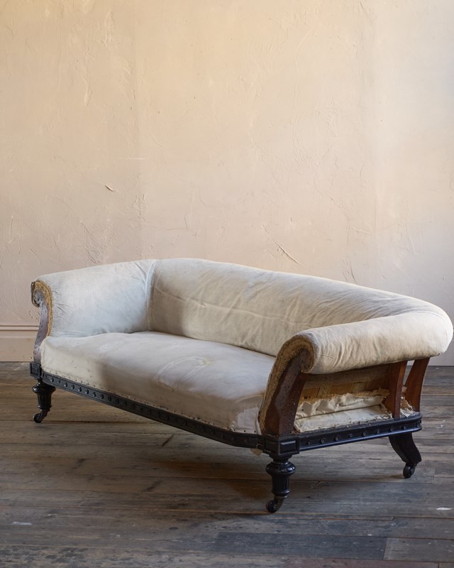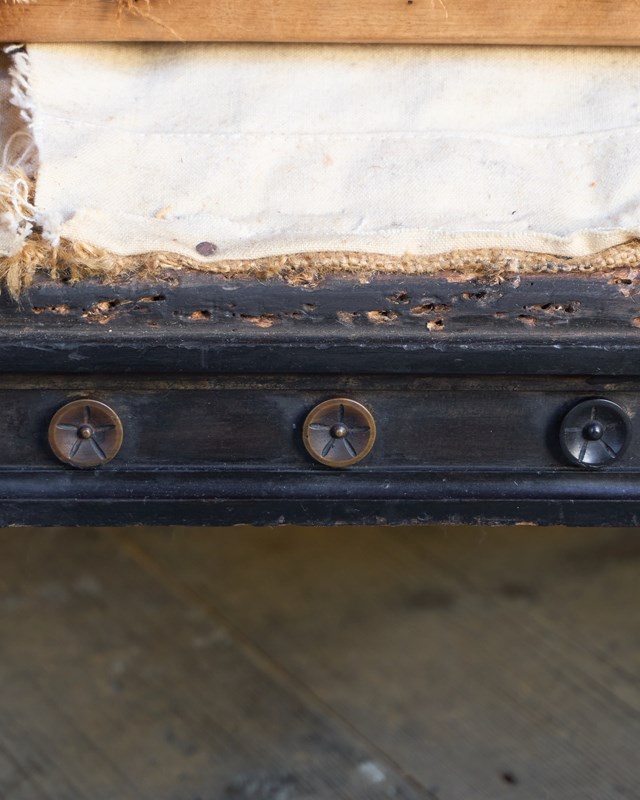 Oversized legs which are ebonised. The front legs are tapered and fluted, while the back are splayed and chamfered. There is a carved apron frieze having rosettes and also is ebonised.