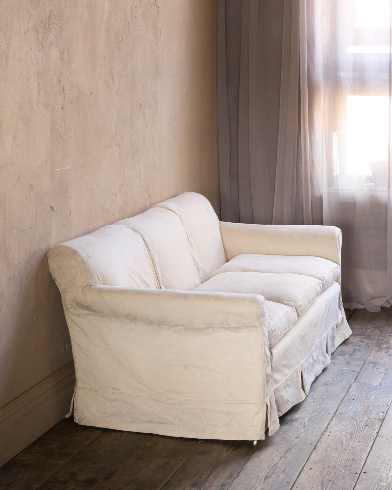 Fully lined with calico, and has an ivory coloured loose cover which is need of cleaning. Also having three feather filled seat cushions.