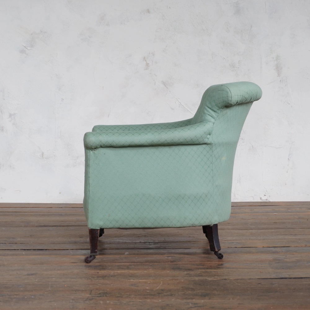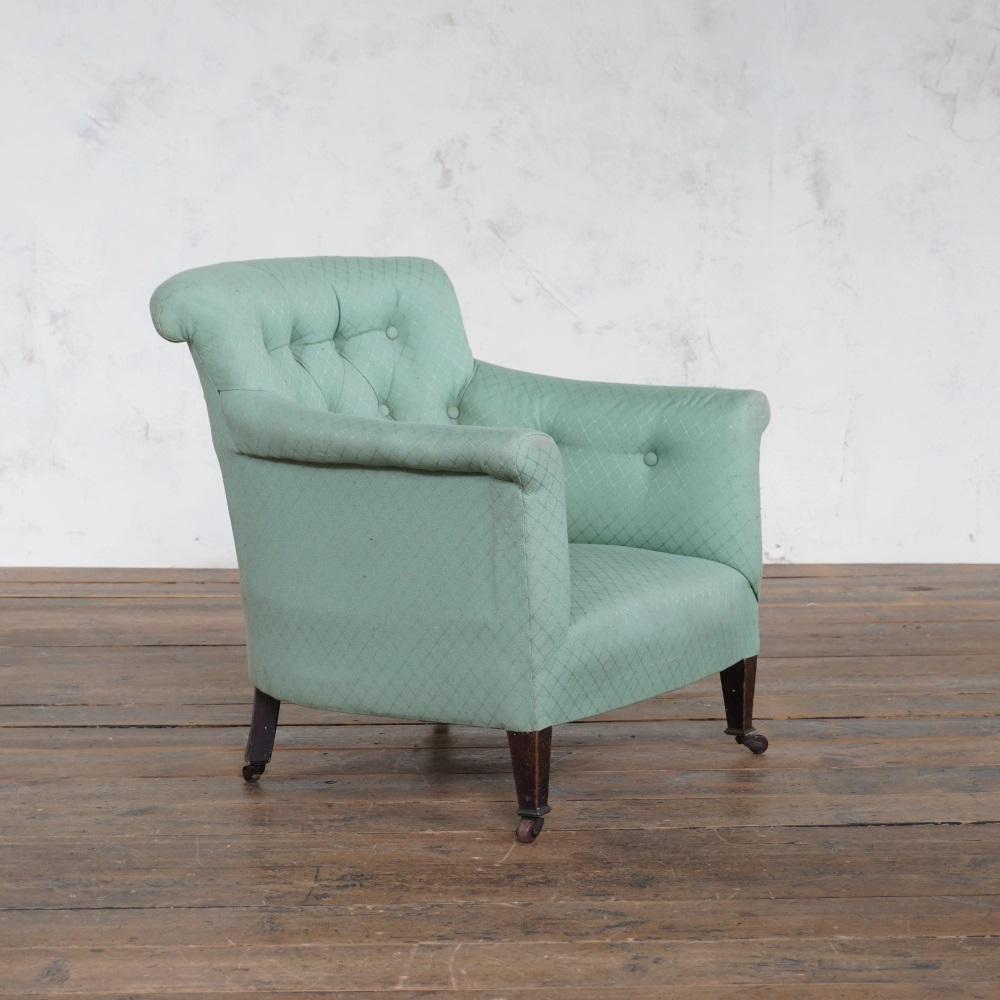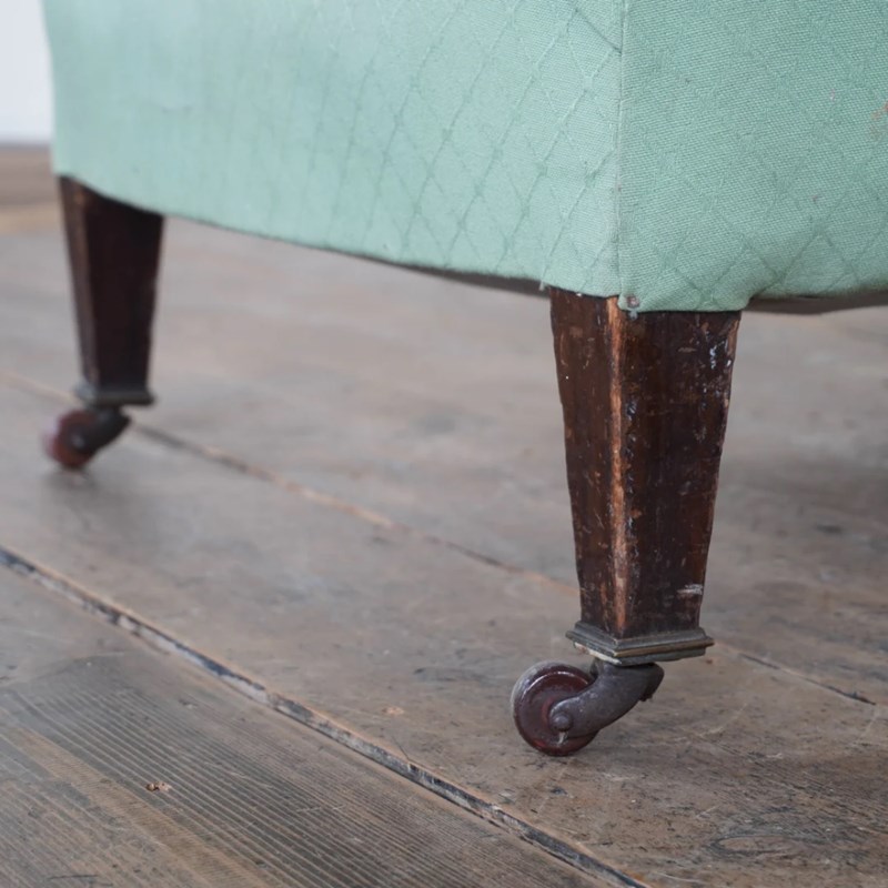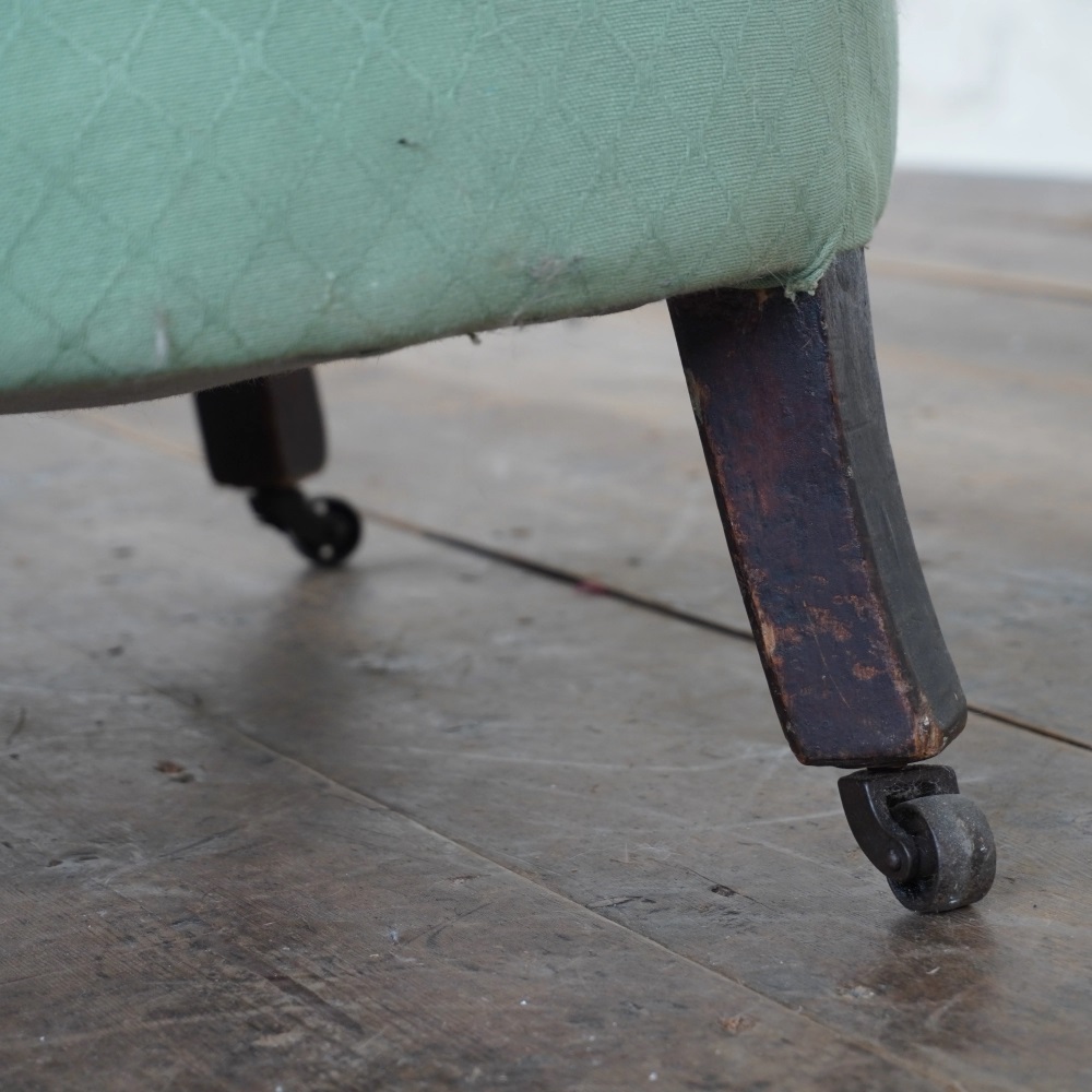 Tapered legs, ceramic castors, green fabric in useable condition without rips but with signs of use and wear. Width 72cm, Depth 76cm, Height 72cm, with a seat height of 30cm and depth of 46cm.