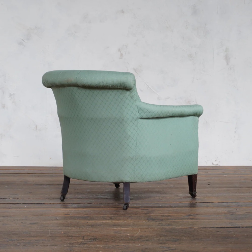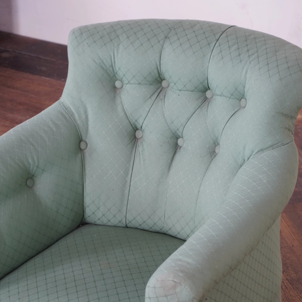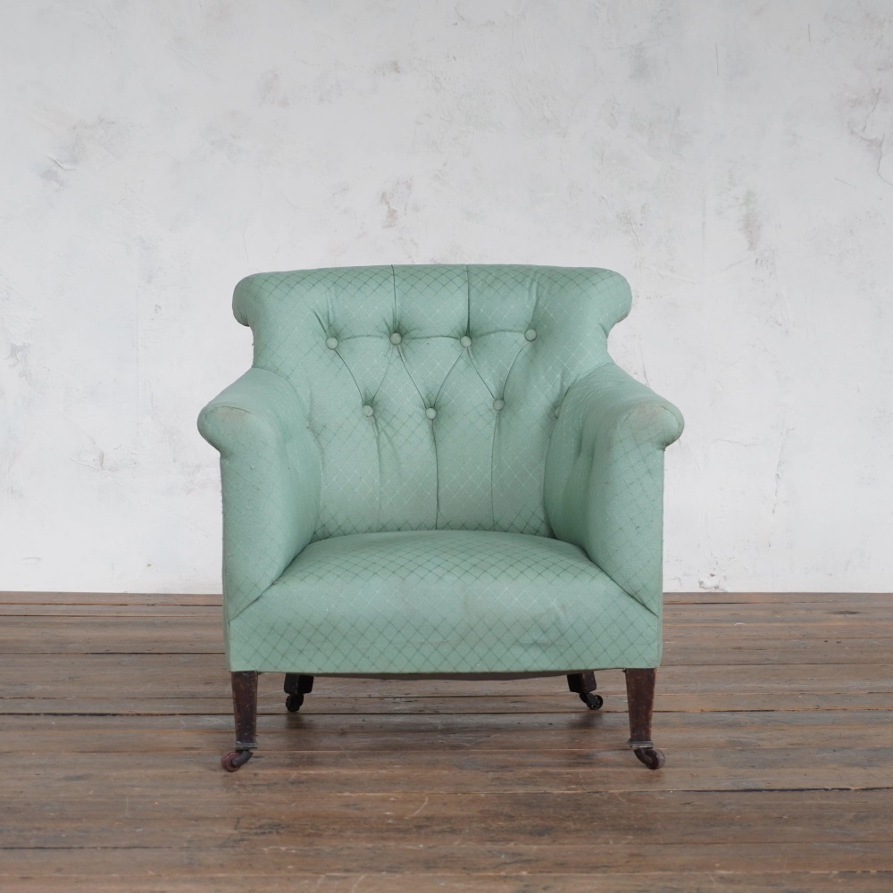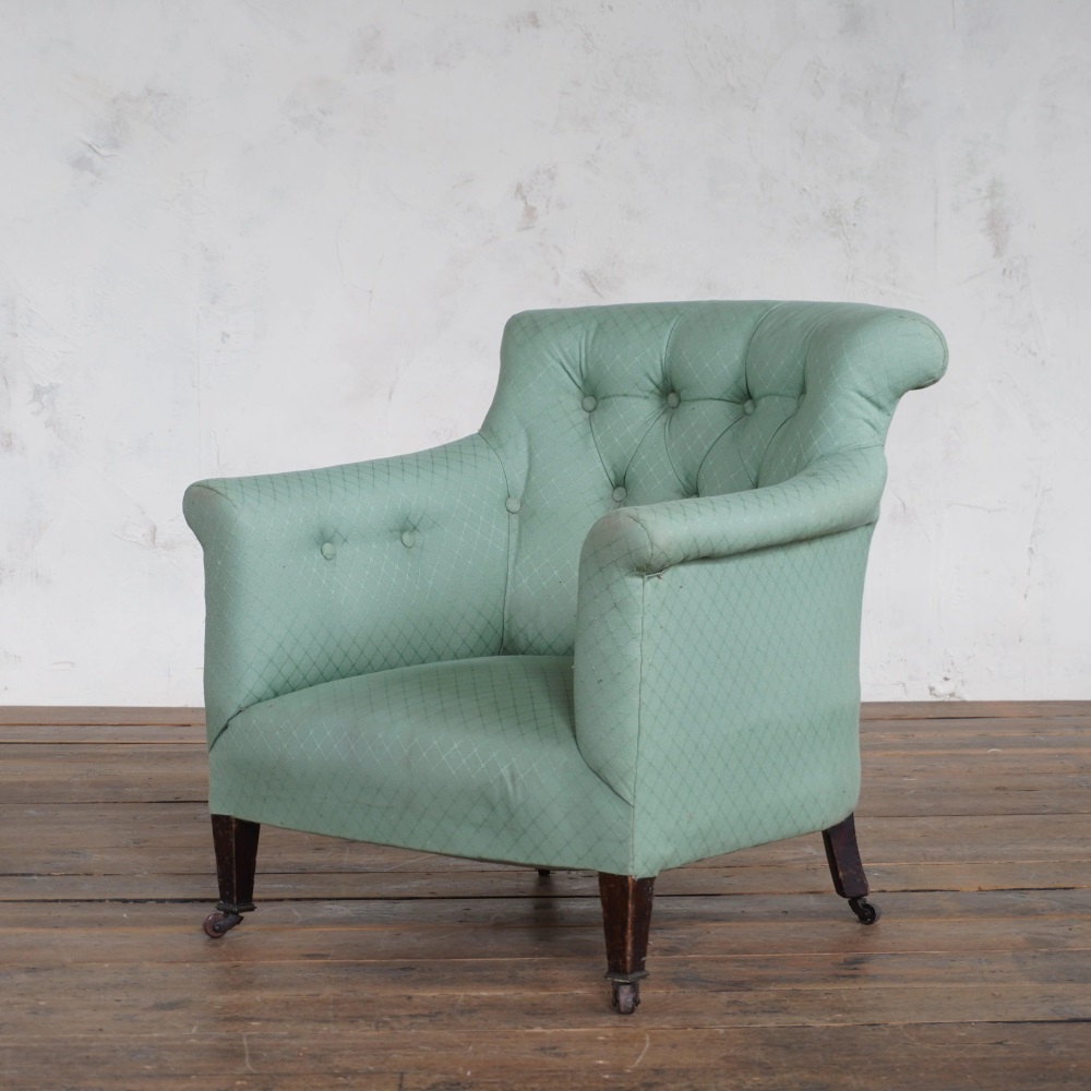 Tapered legs, ceramic castors, green fabric in useable condition without rips but with signs of use and wear. Width 72cm, Depth 76cm, Height 72cm, with a seat height of 30cm and depth of 46cm.