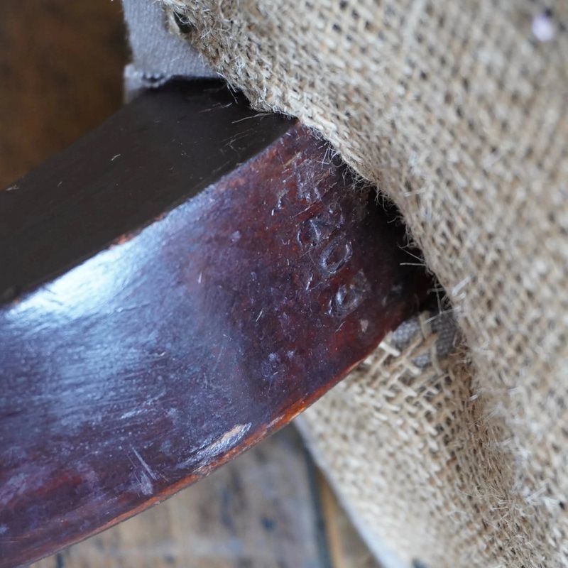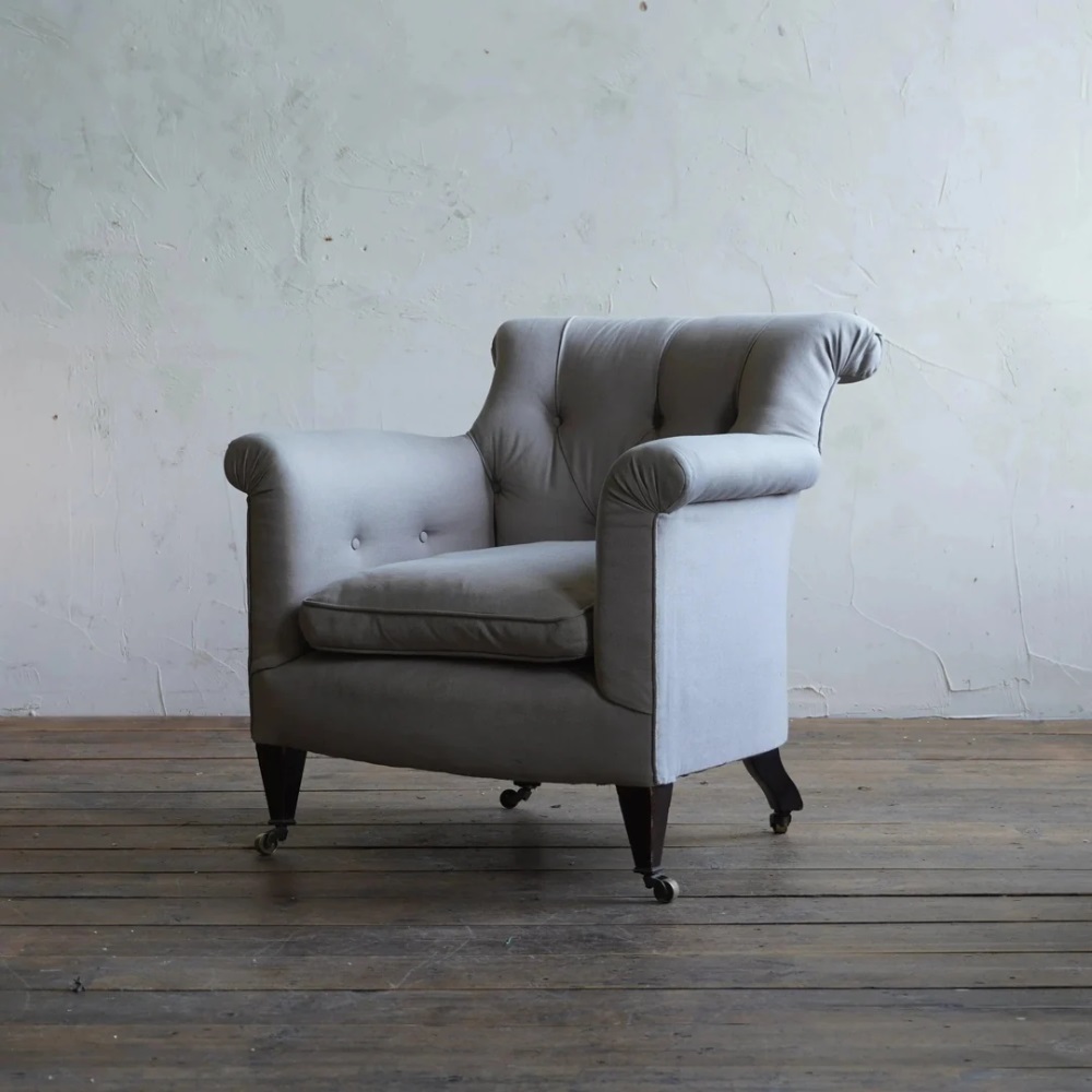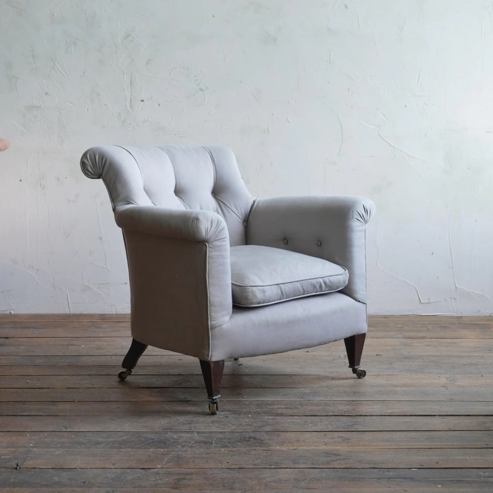 Tapered Legs, brass castors, grey linen fabric in useable condition, needs a professional clean. Width 80cm x Depth 76cm x Height 75cm, with a seat height of 38cm.