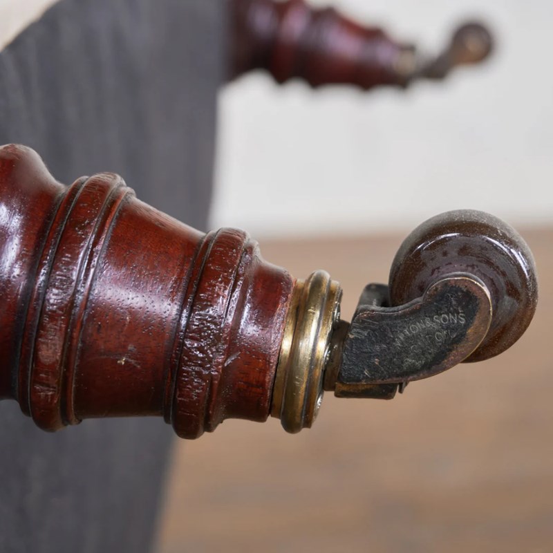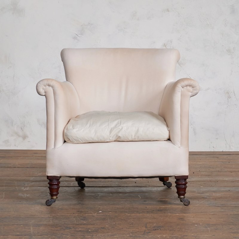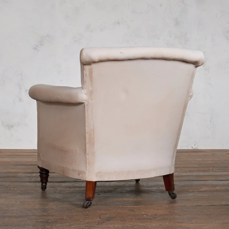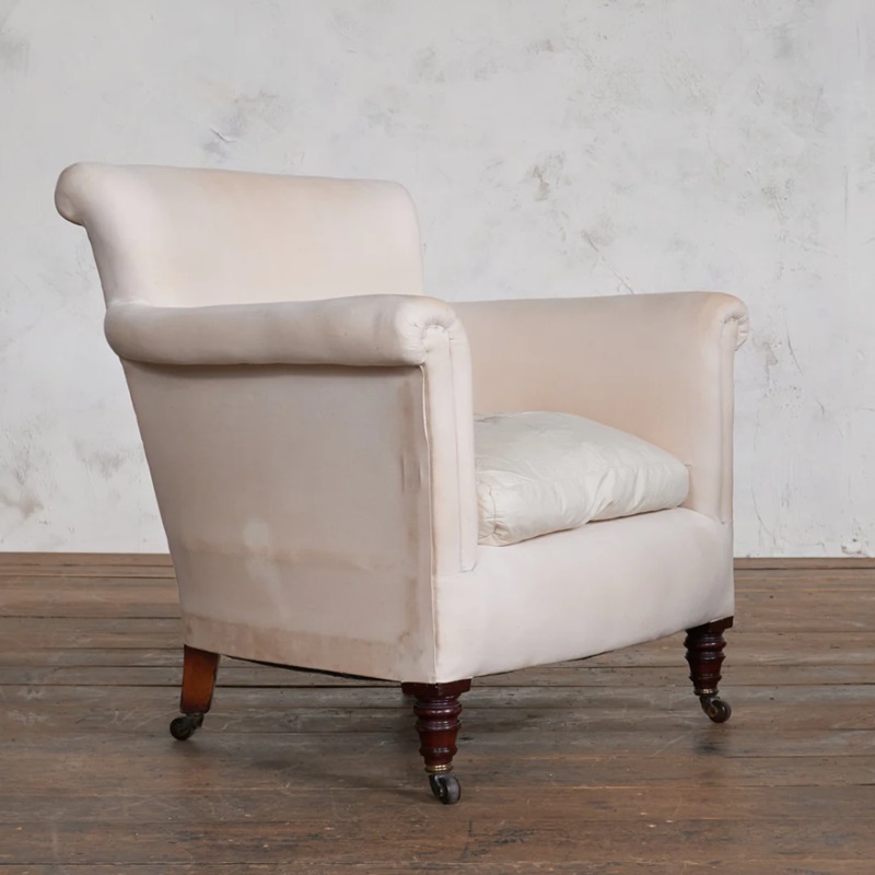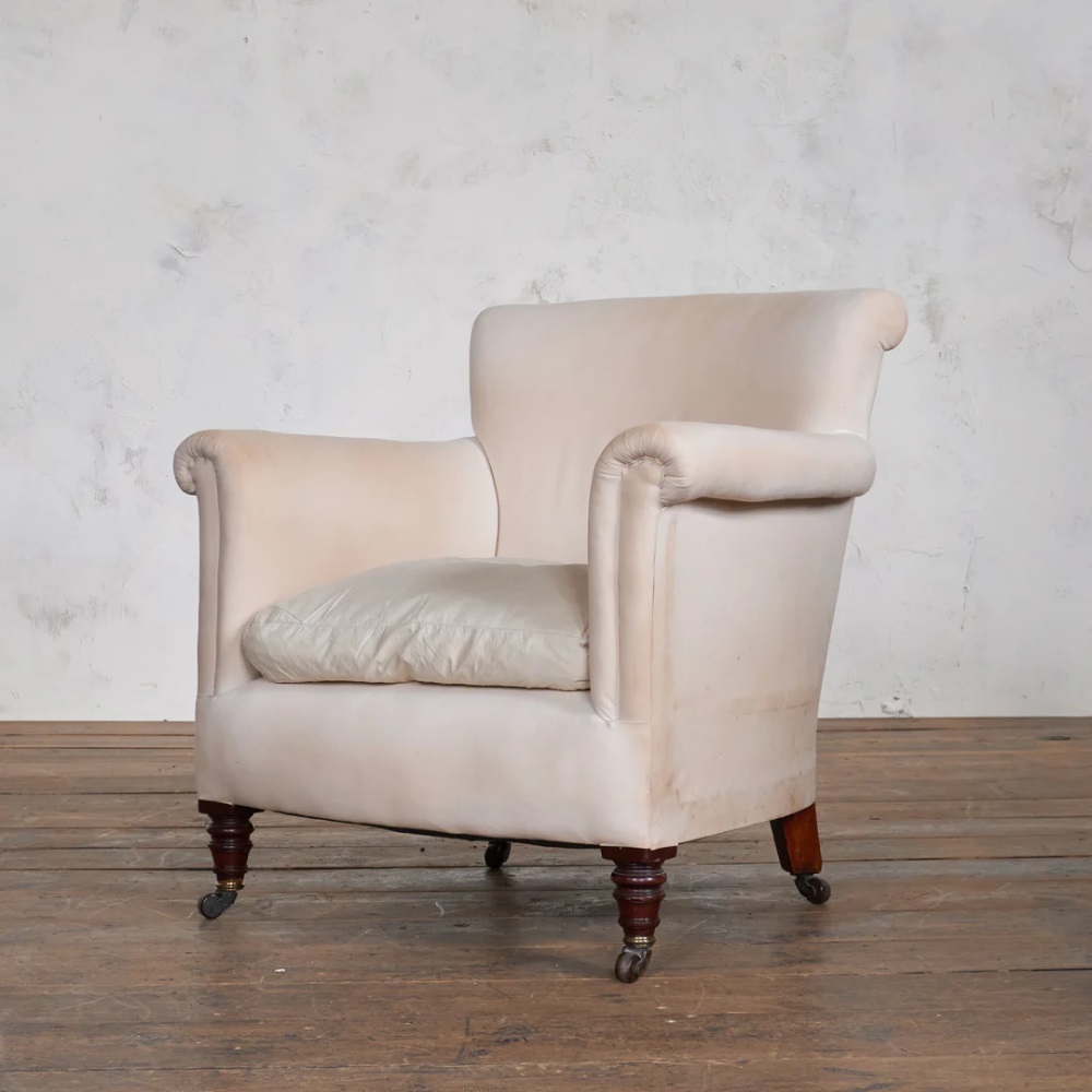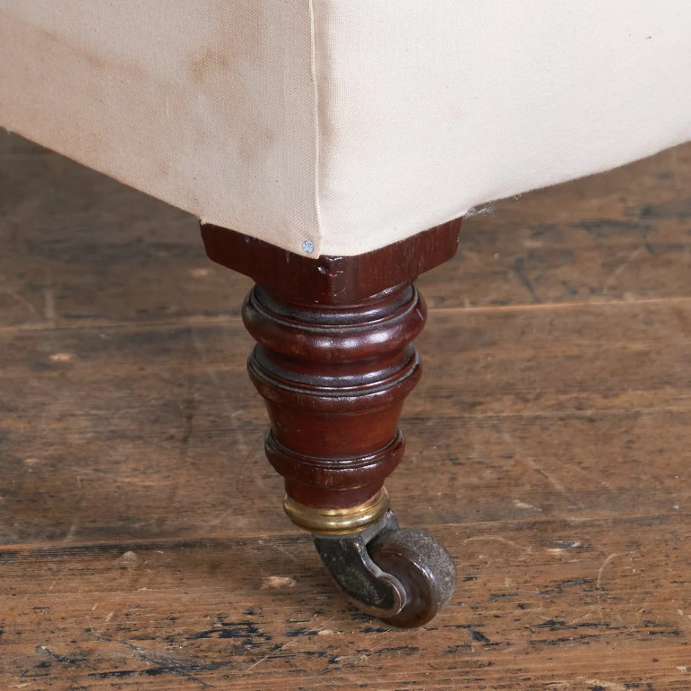 Hampton & Sons, Turned Legs on ceramic castors, with a full calico covering which has aging but no wear. Width 79cm x Depth 76cm x Height 77cm, with a seat height of 38cm and depth of 52cm.