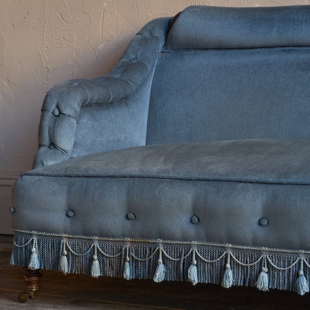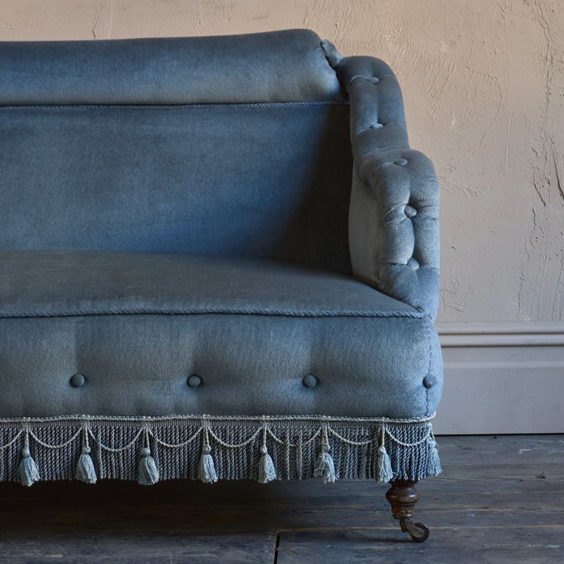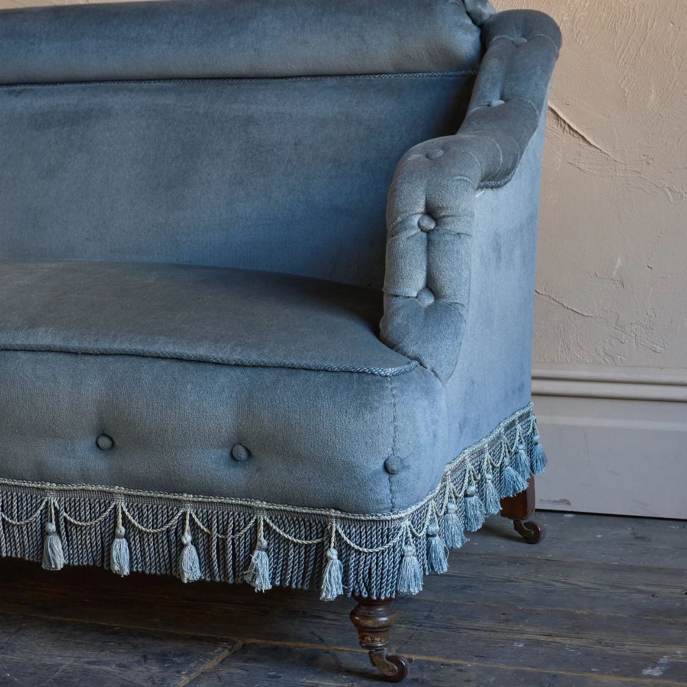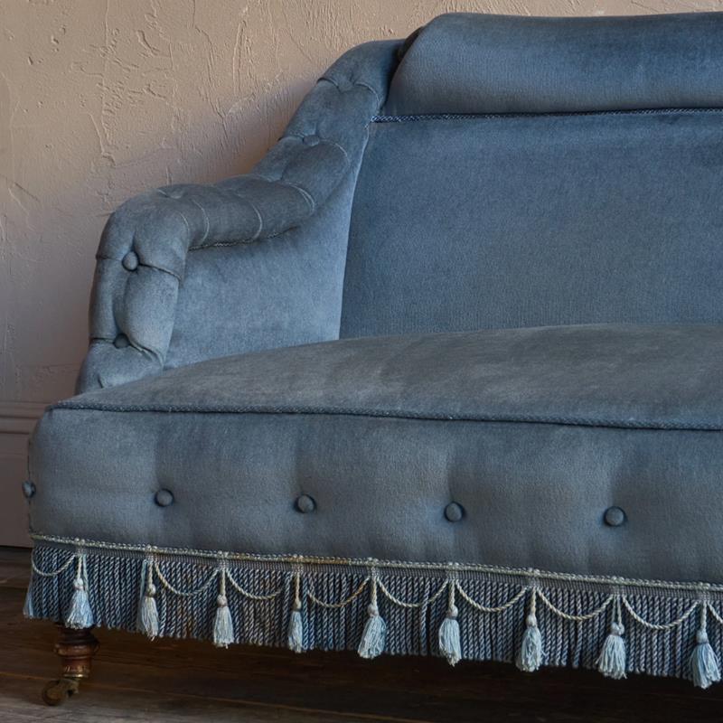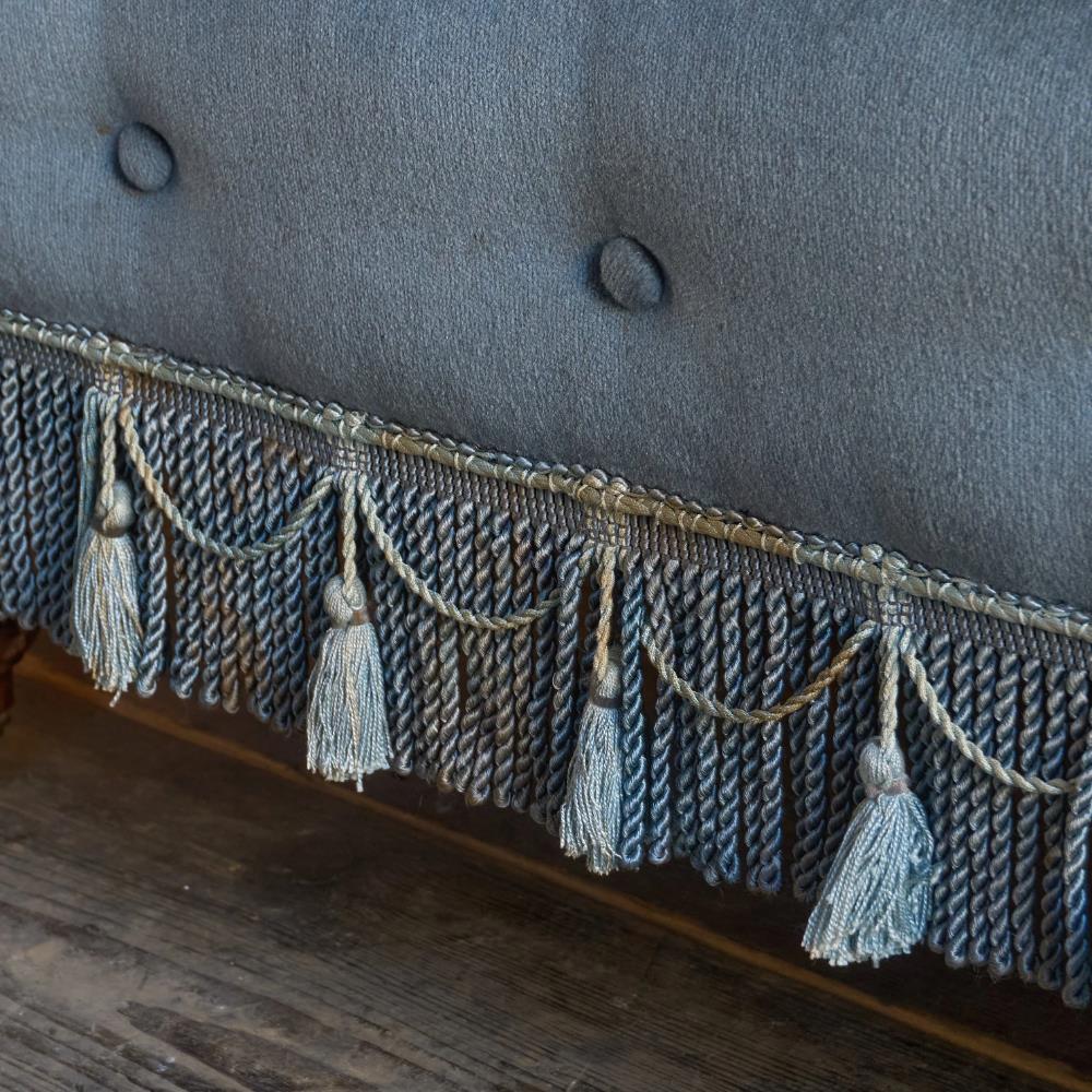 Antique Bedroom Sofa - Blue Velvet With Tassel Trim