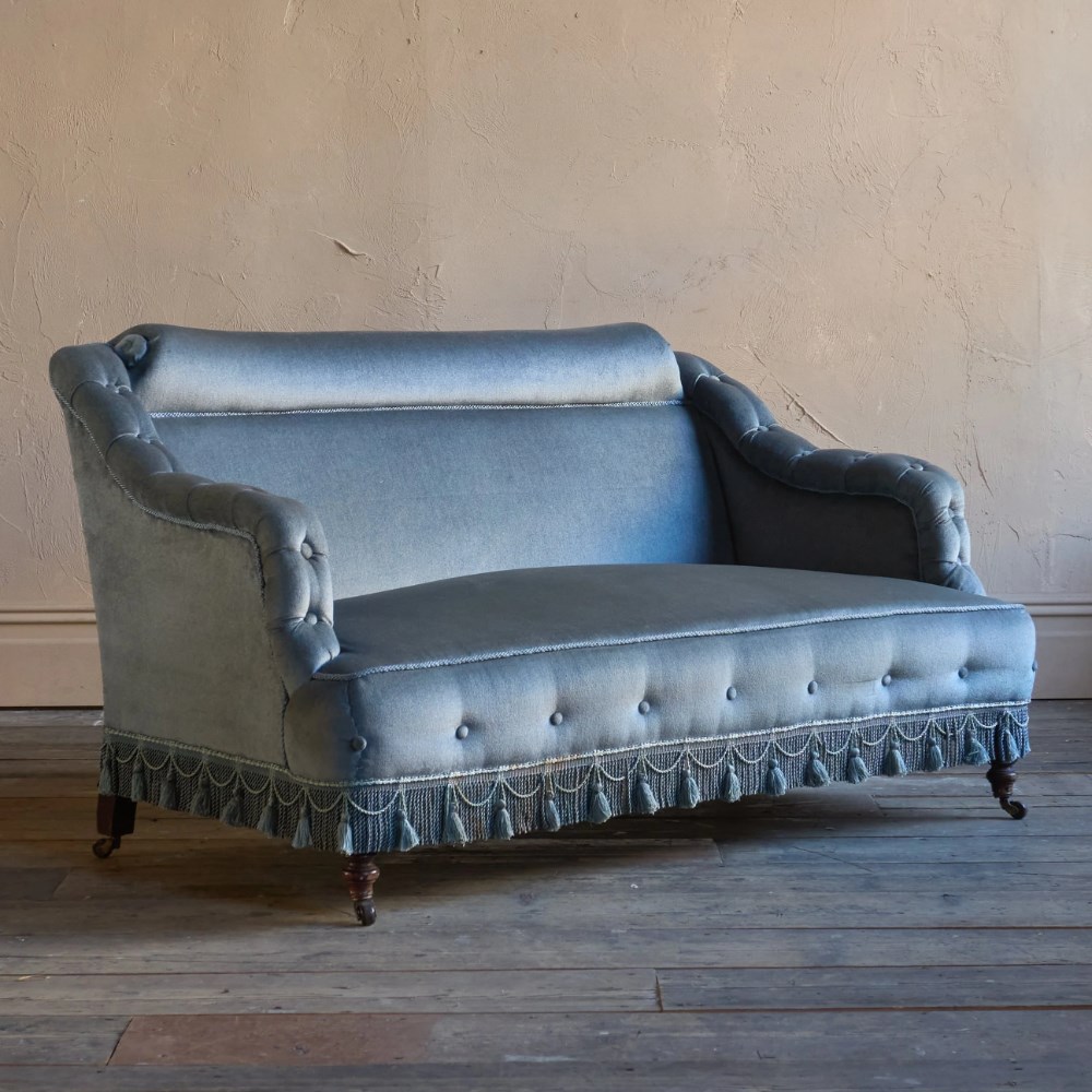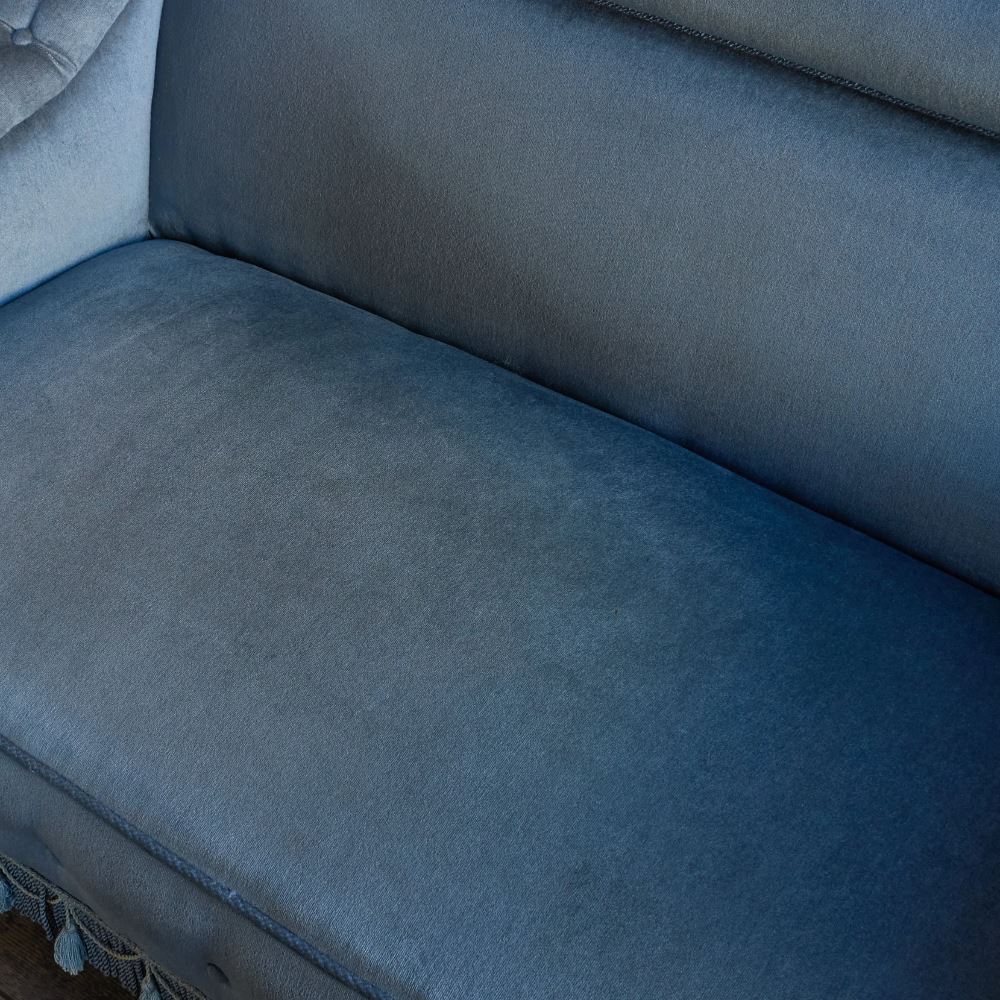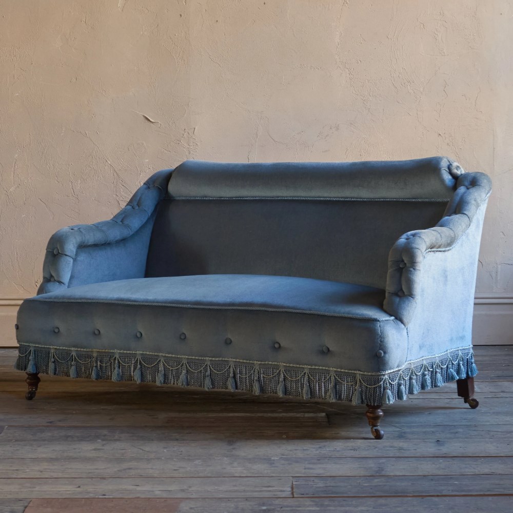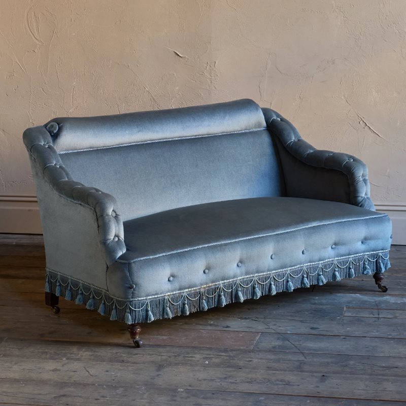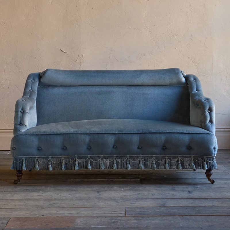 Antique Bedroom Sofa - Blue Velvet With Tassel Trim