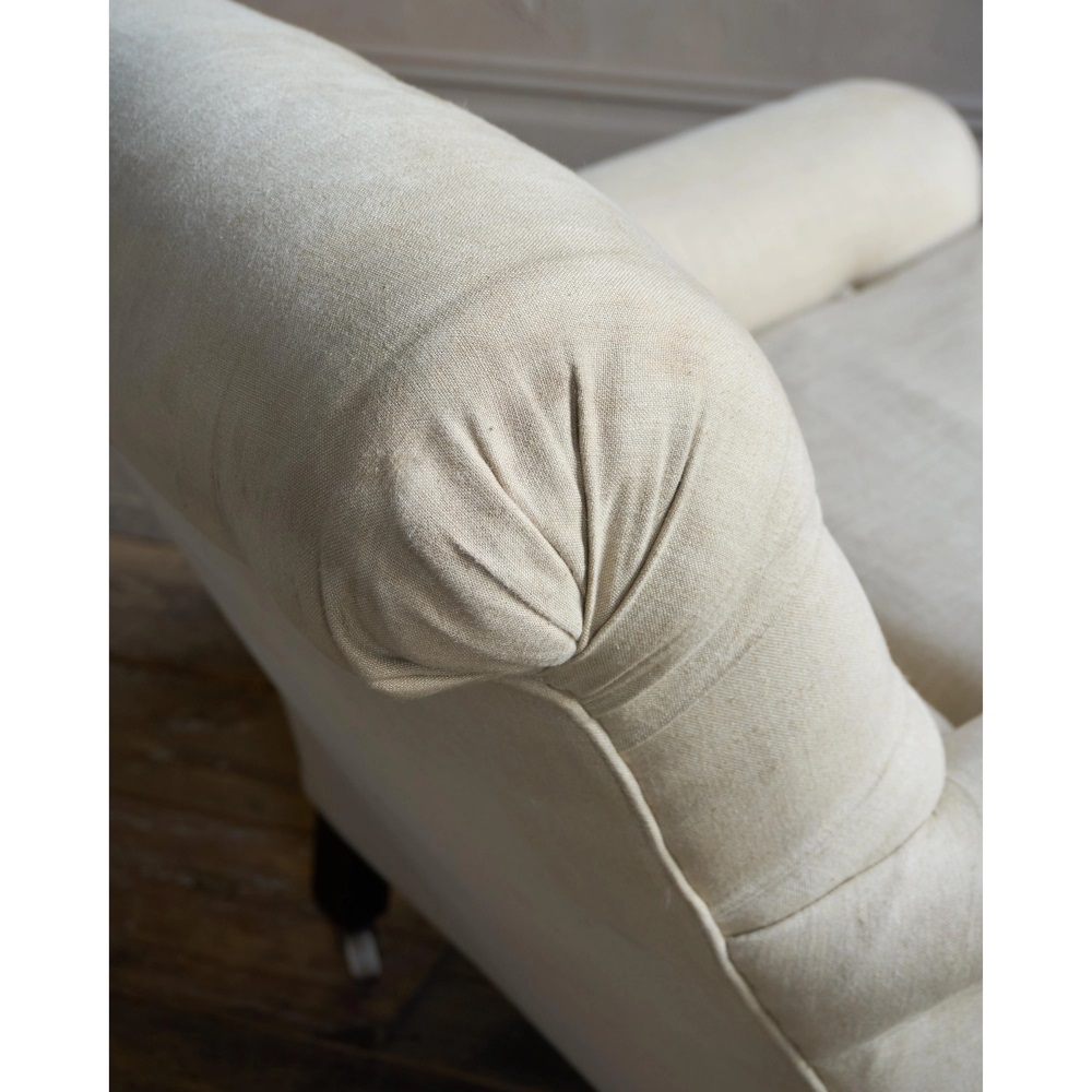 The outer fabric is in reasonable order but with some stains here and there, likely these could be removed with a professional clean. One button in the back needs to be re-tied in.