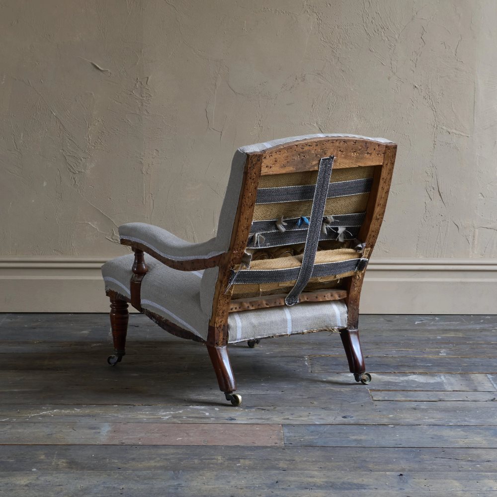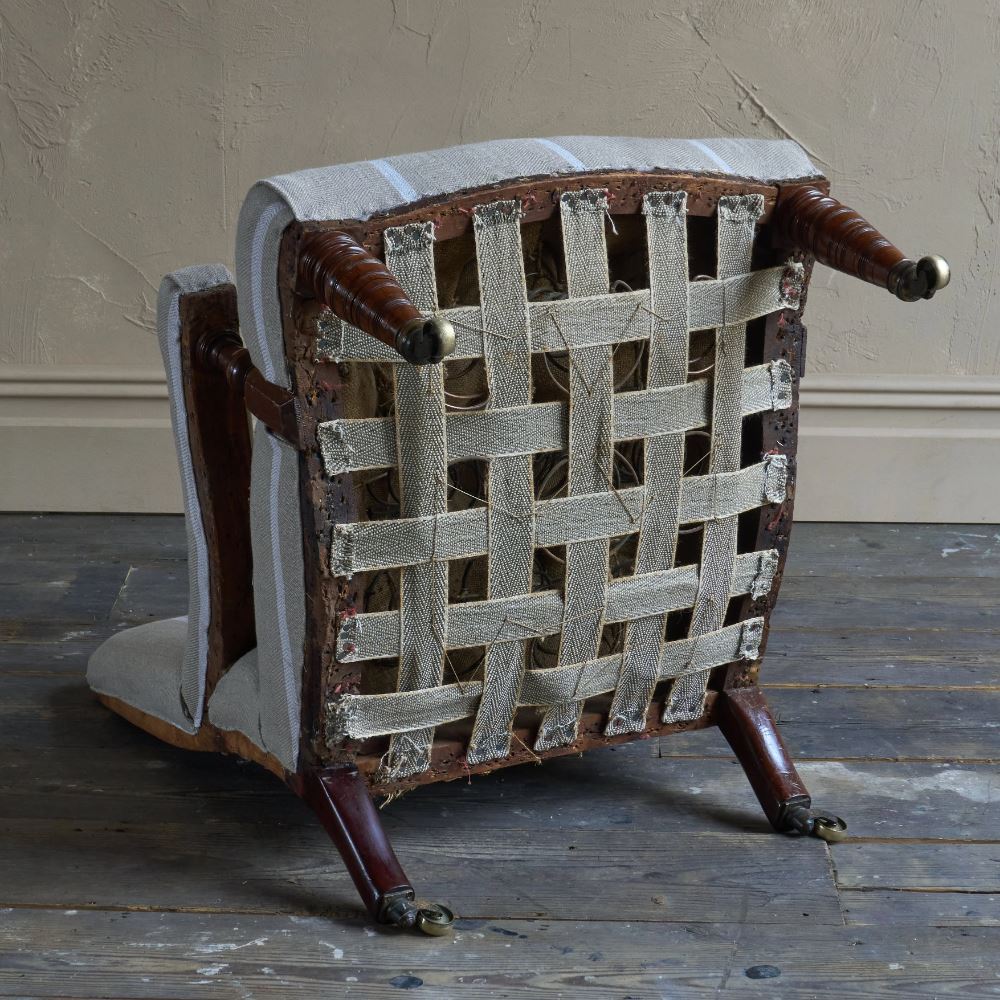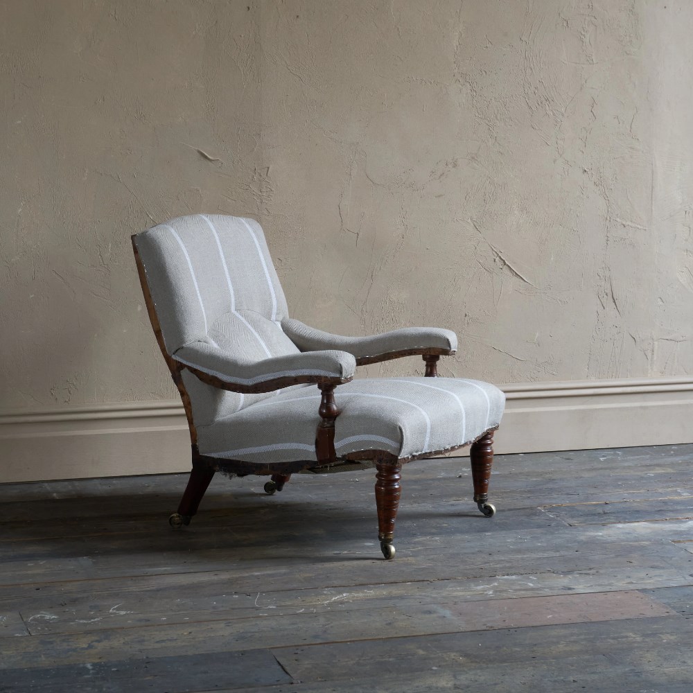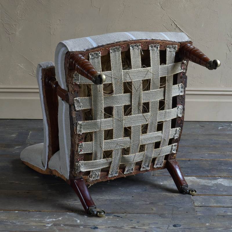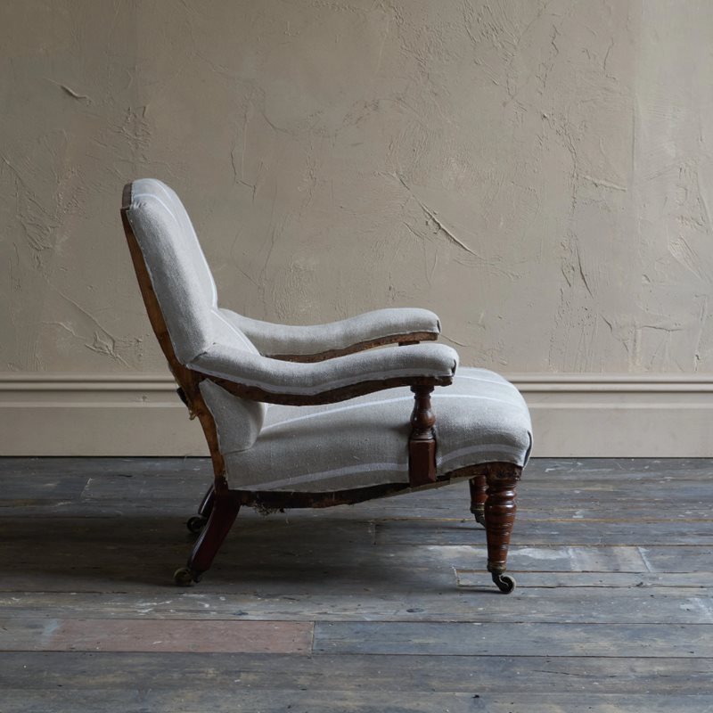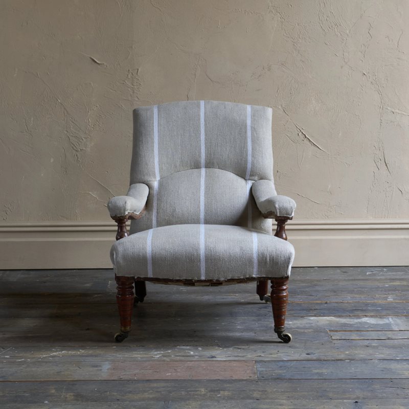Antique open armchair with prep' ticking.