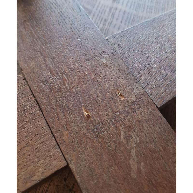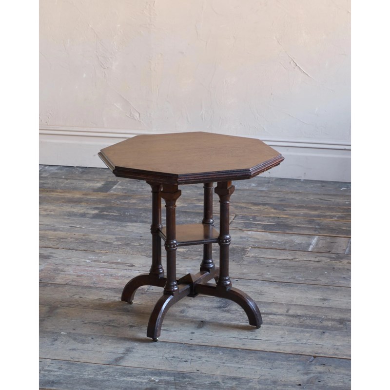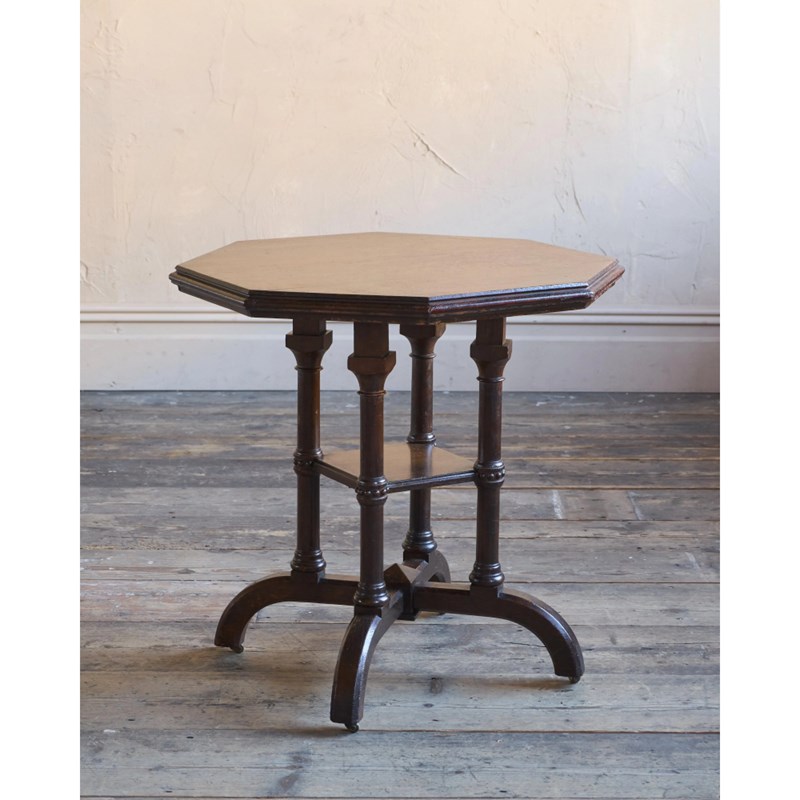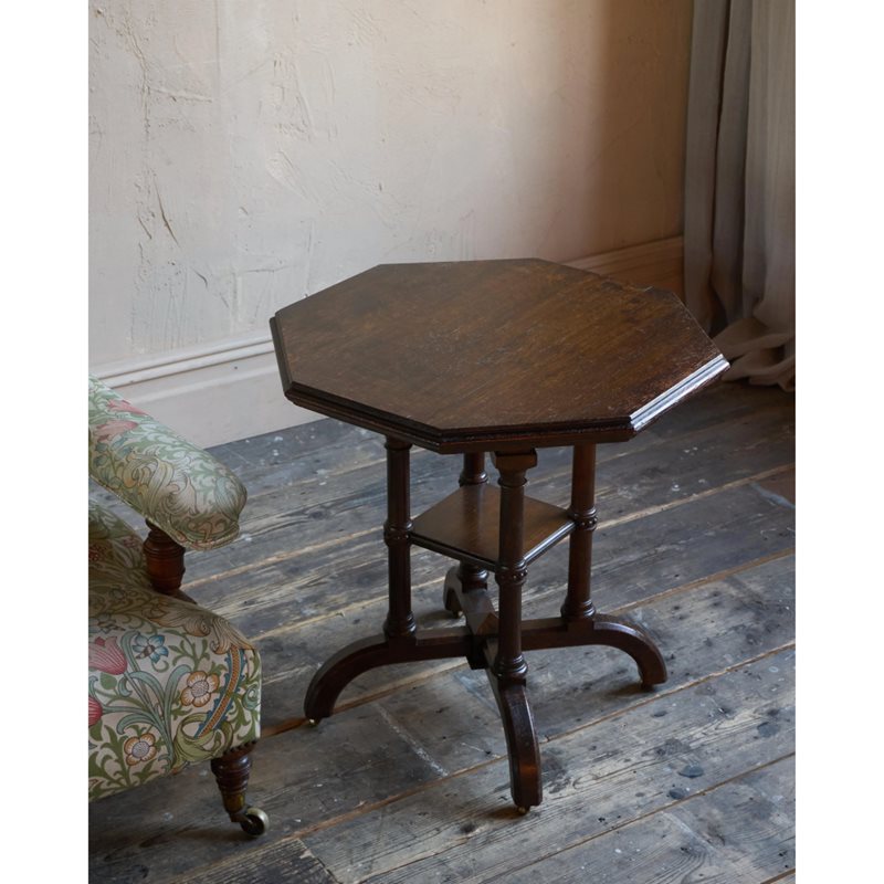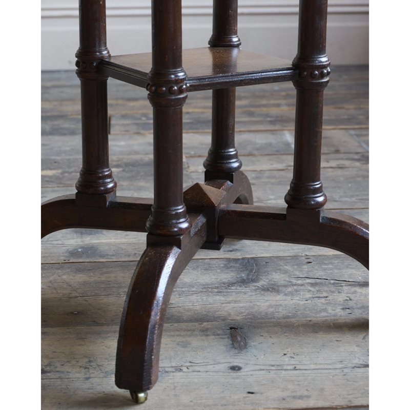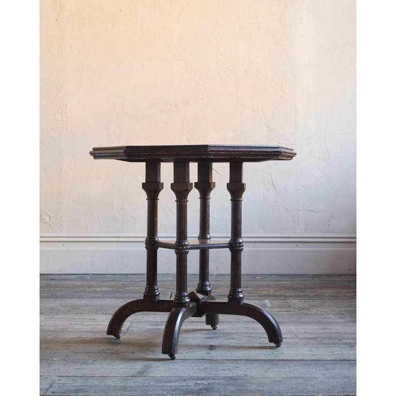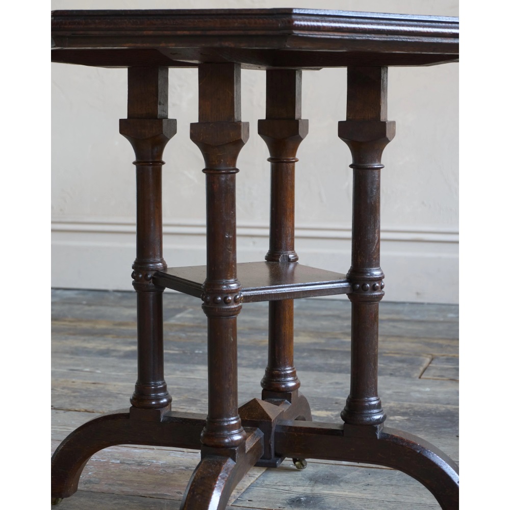 Solid english oak construction with an octagonal top and gothic like pillars and legs, with recessed Cope & Collinson castors.