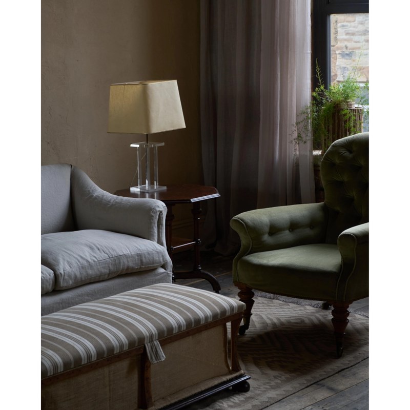 Traditionally upholstered, with a sprung seat and horsehair fillings.