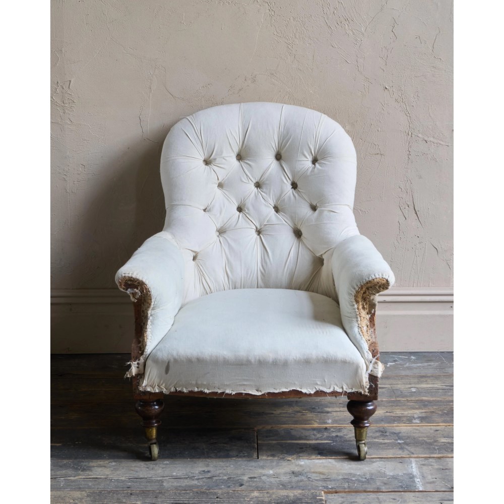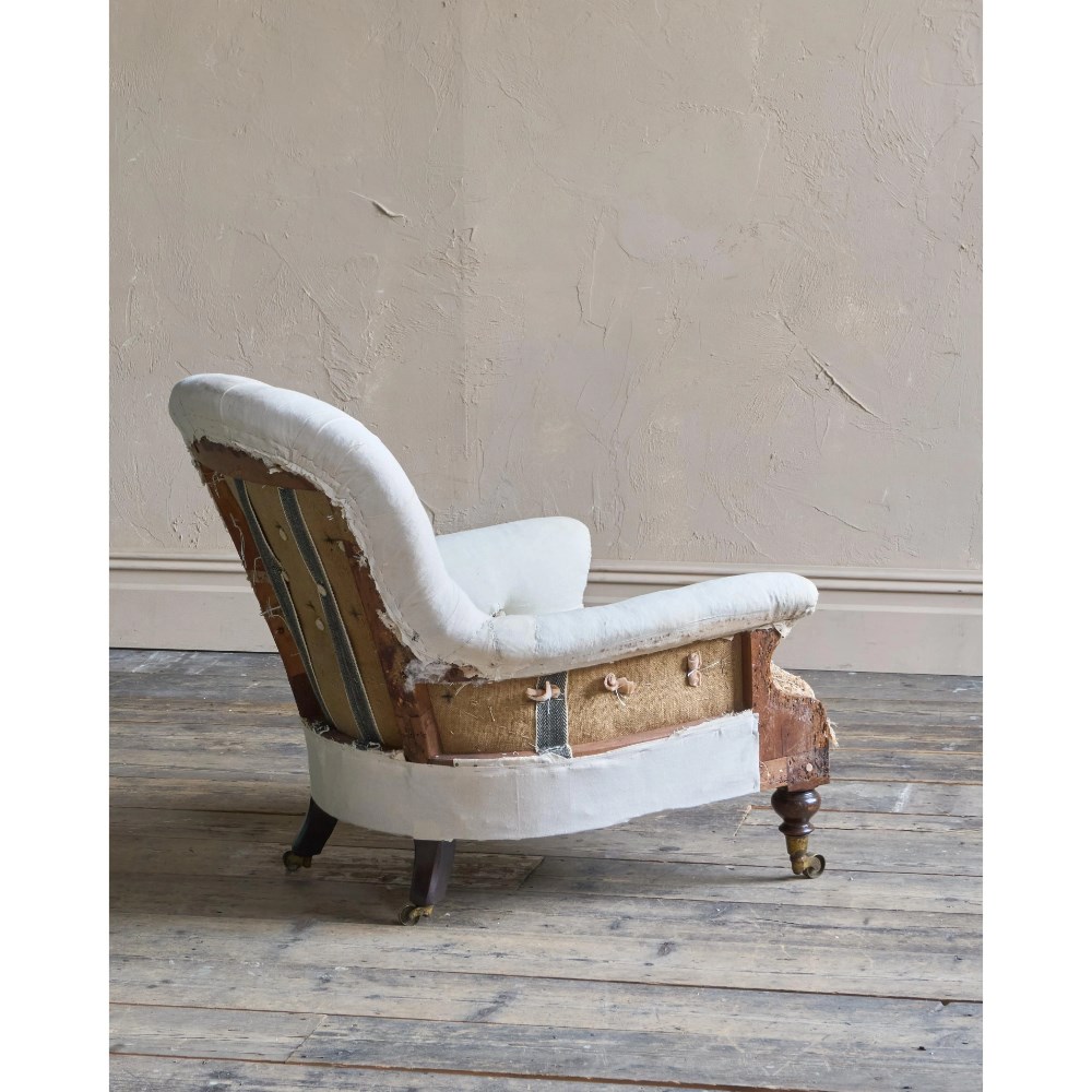 Traditionally upholstered, with a sprung seat and horsehair fillings.