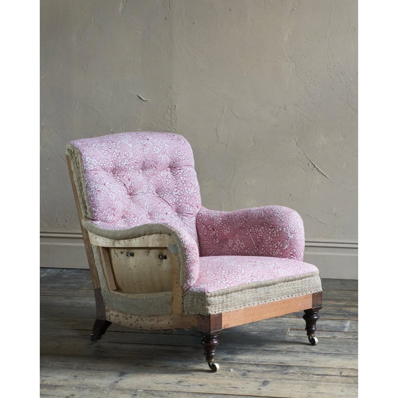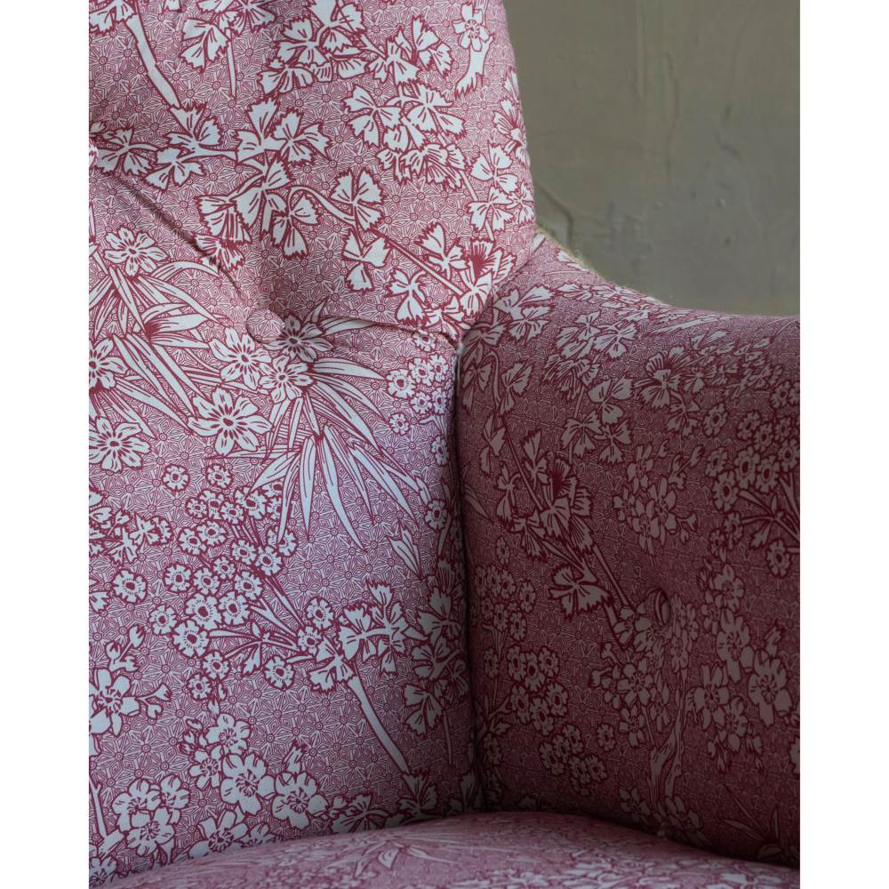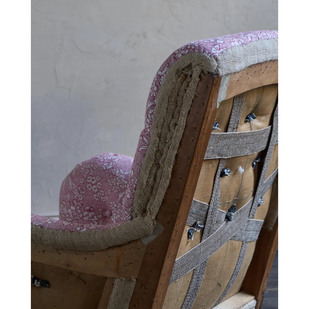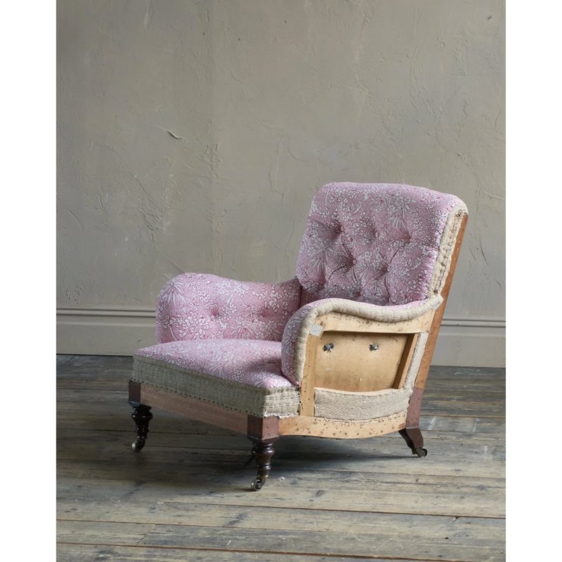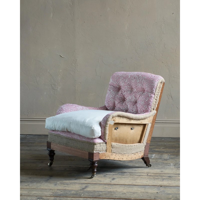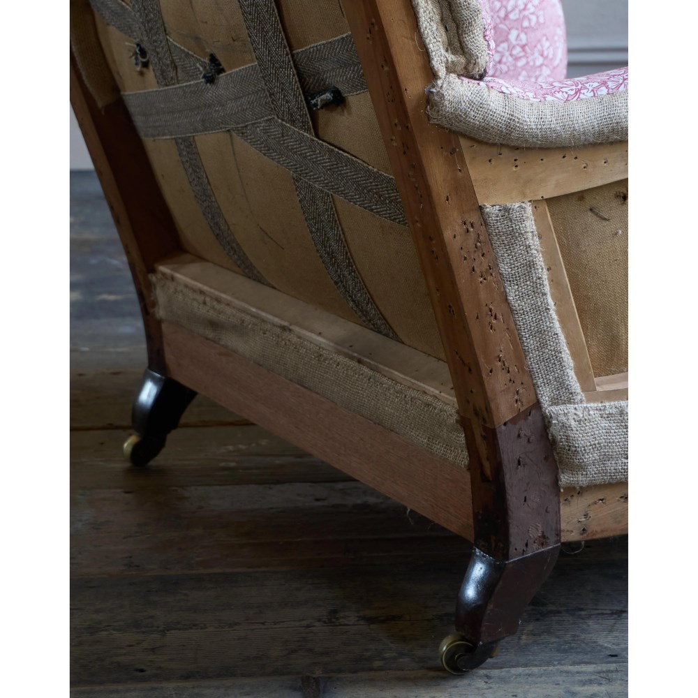 The upholstery has been restored and renewed structurally and has been lined with a replica of the original fabric found that was found underneath during restoration.