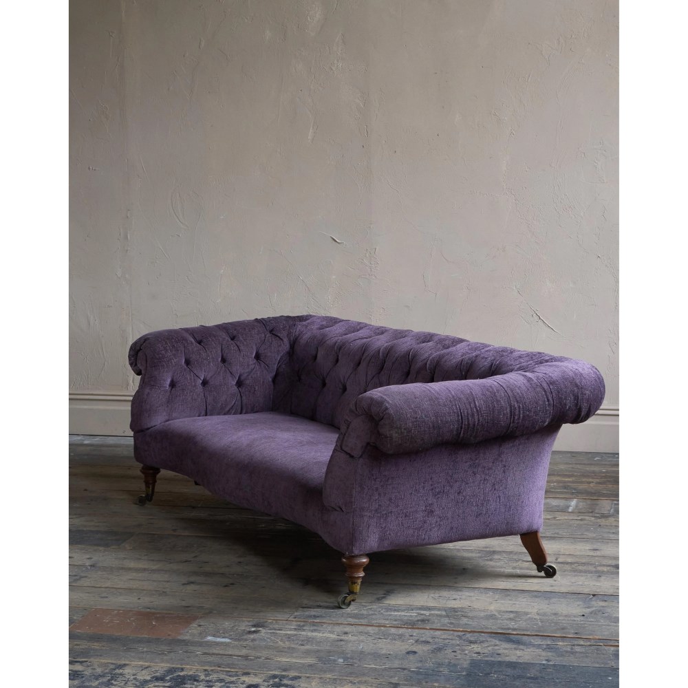 Currently covered in a purple fabric and would benefit from a recover. A cushion(s) can be added.