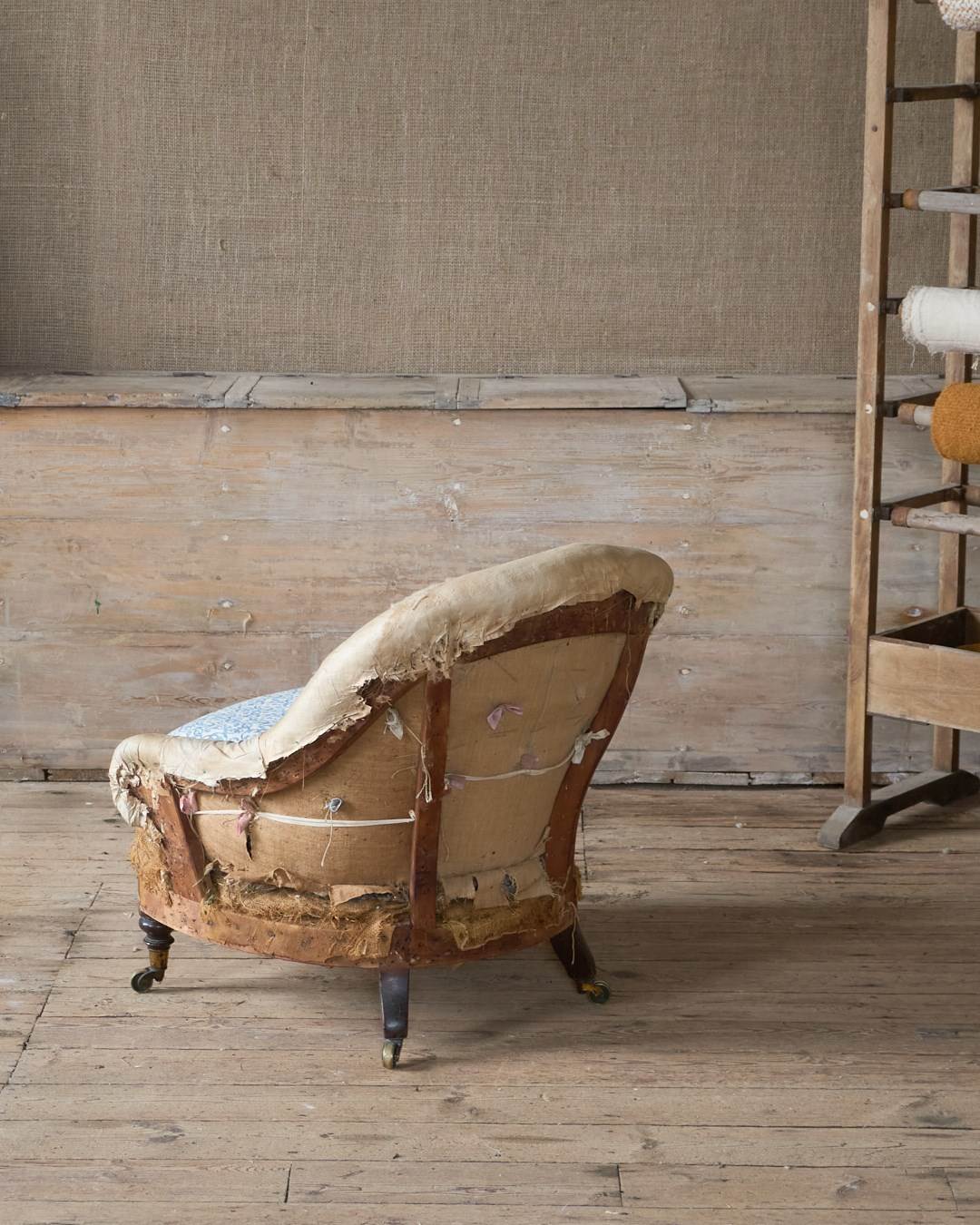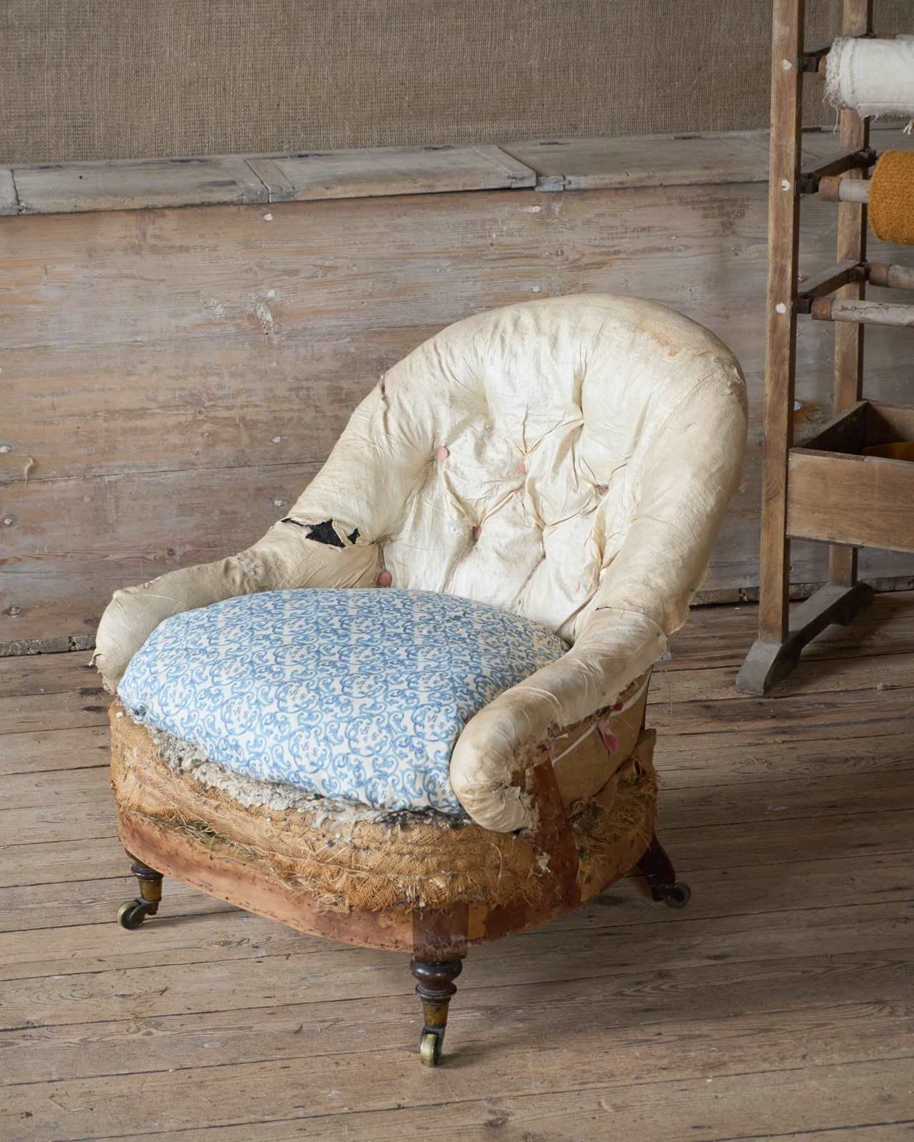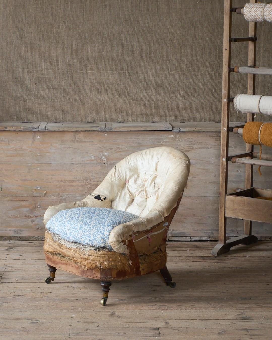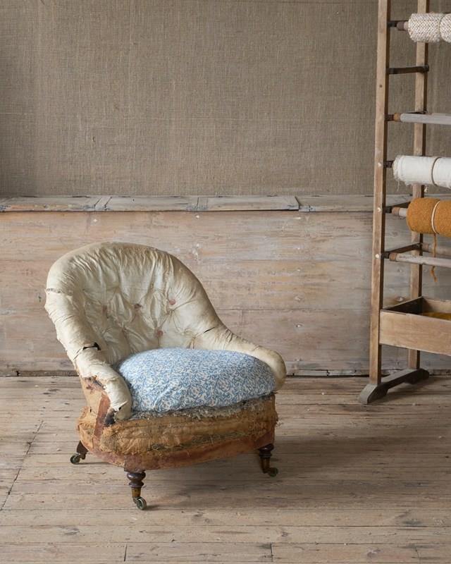 A well-drawn petite tub armchair that is traditionally upholstered with a button-back, sprung seat and horsehair fillings - but for upholstery.