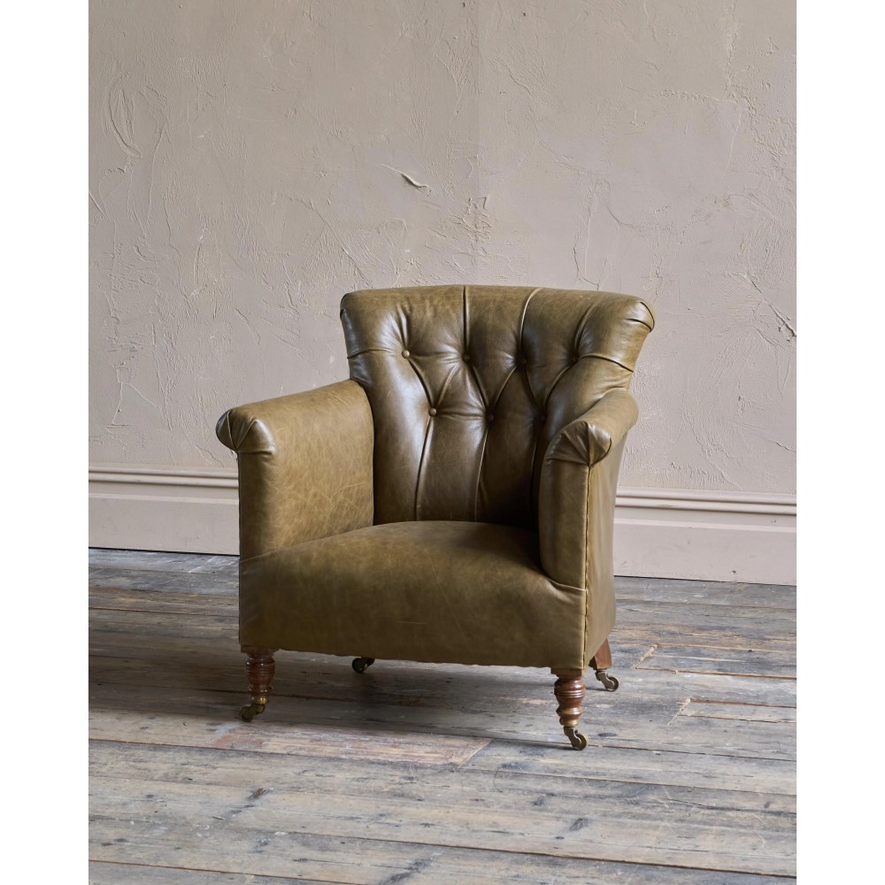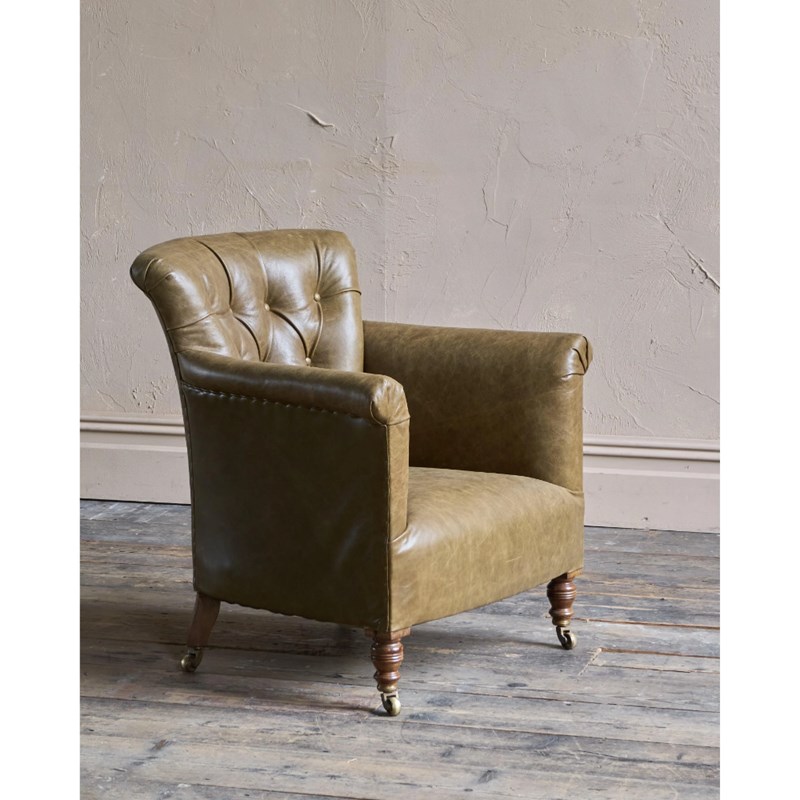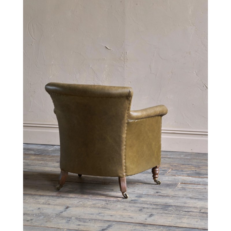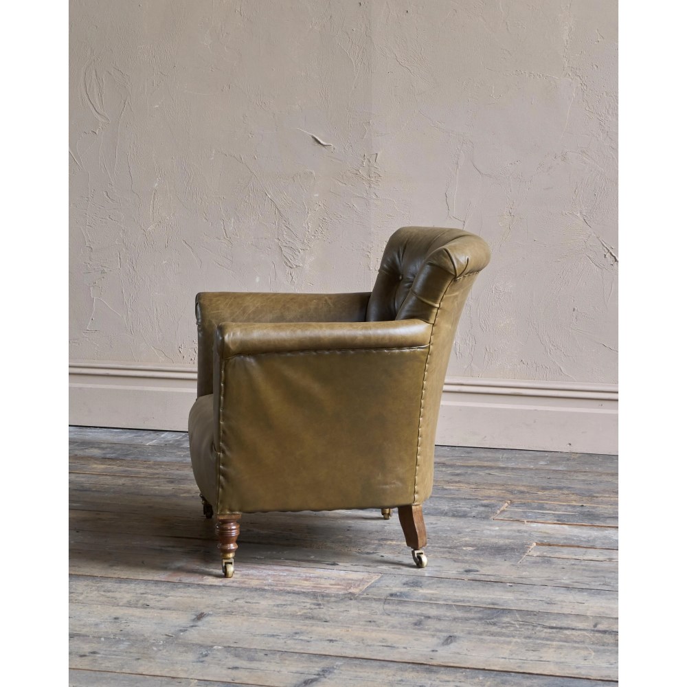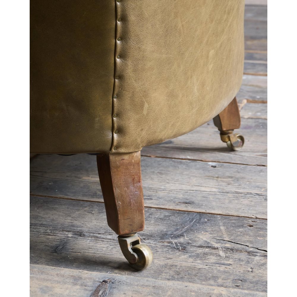 Upholstered from the frame up and freshly recovered in moss green leather.