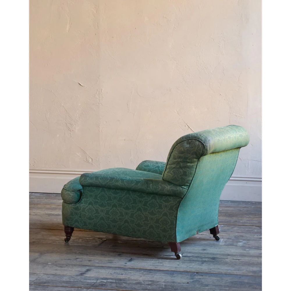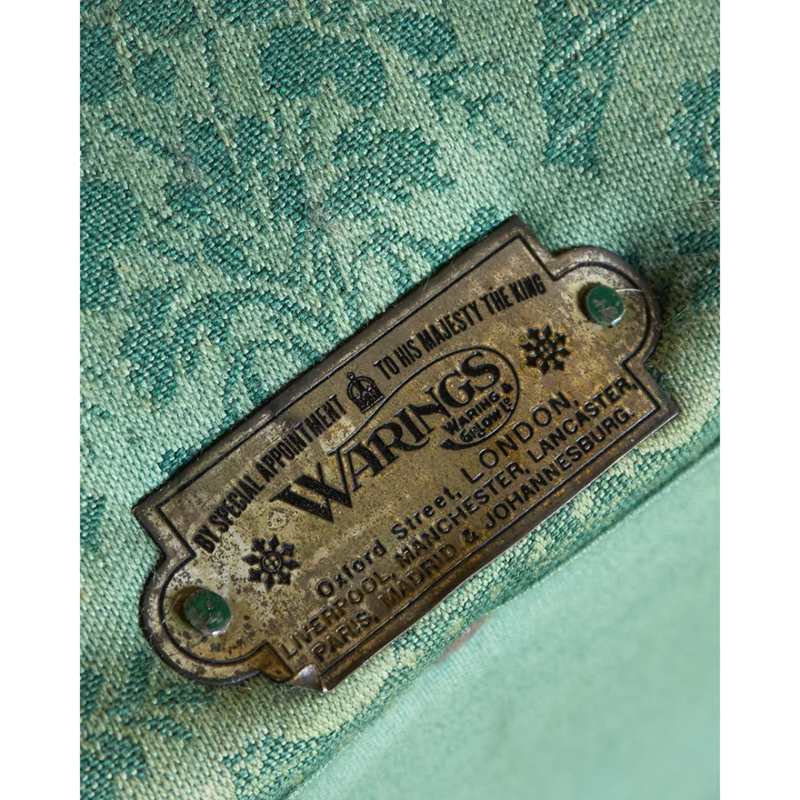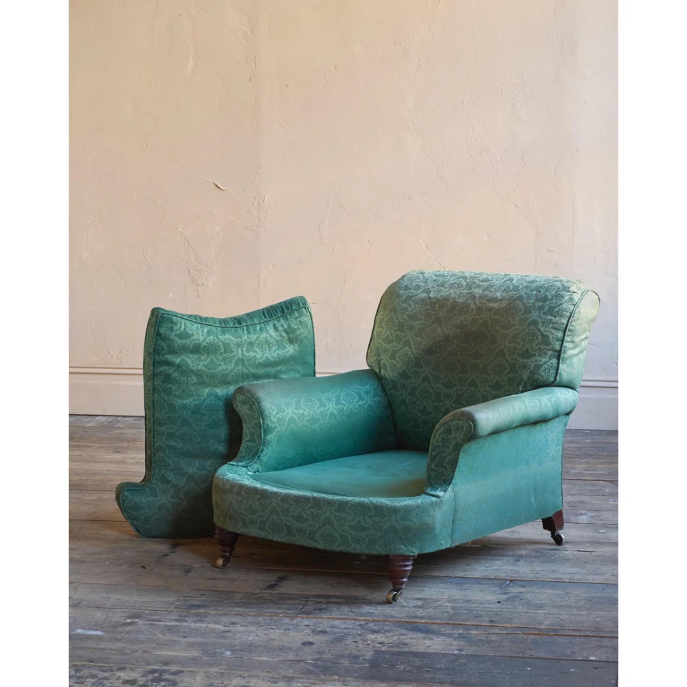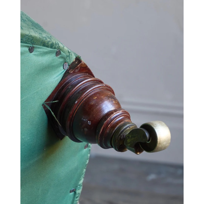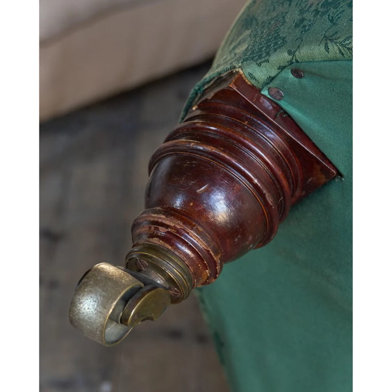 Currently covered in a green damask fabric that is not in great condition and is very old, possibly it's original cover.