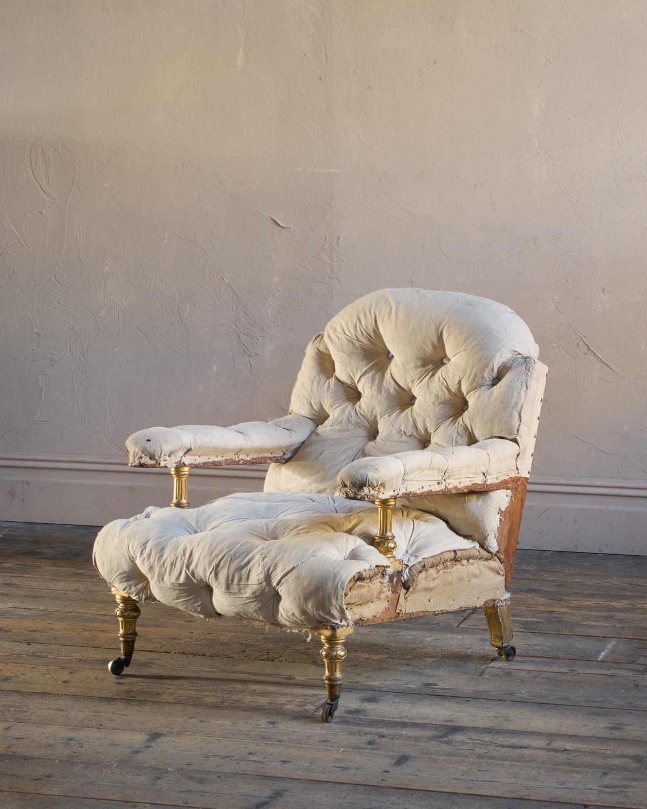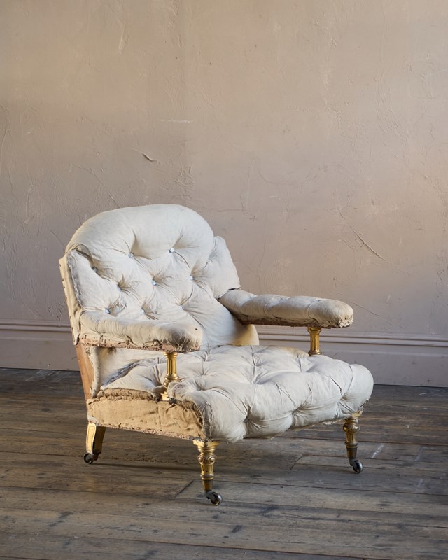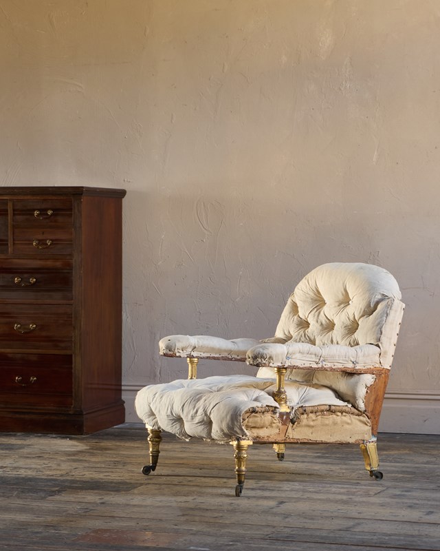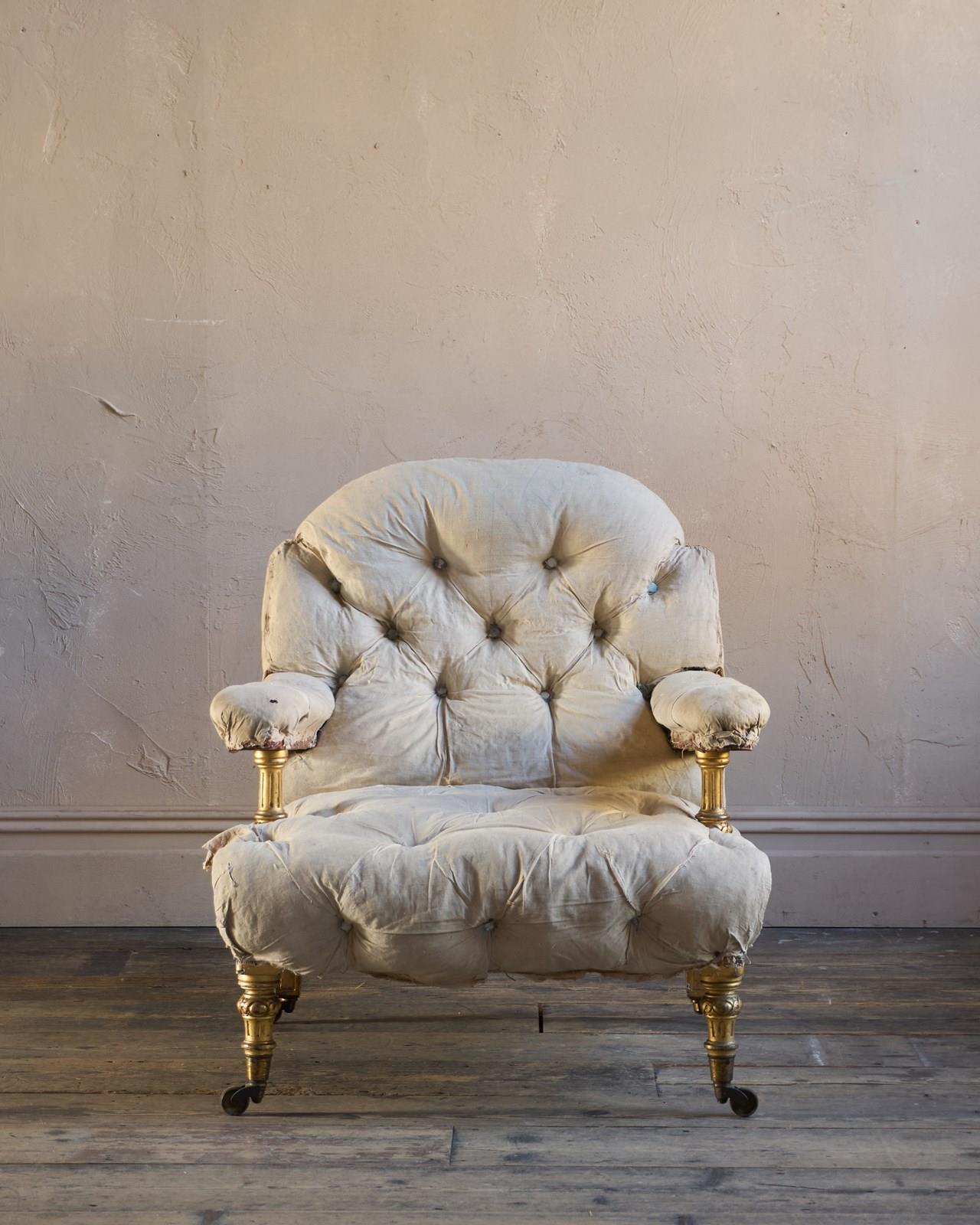 The upholstery is original with repairs, and has a fully deep buttoned back and seat, with buttoning to the arms.