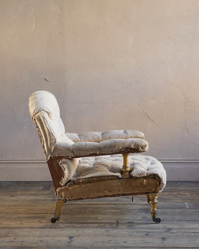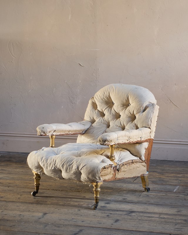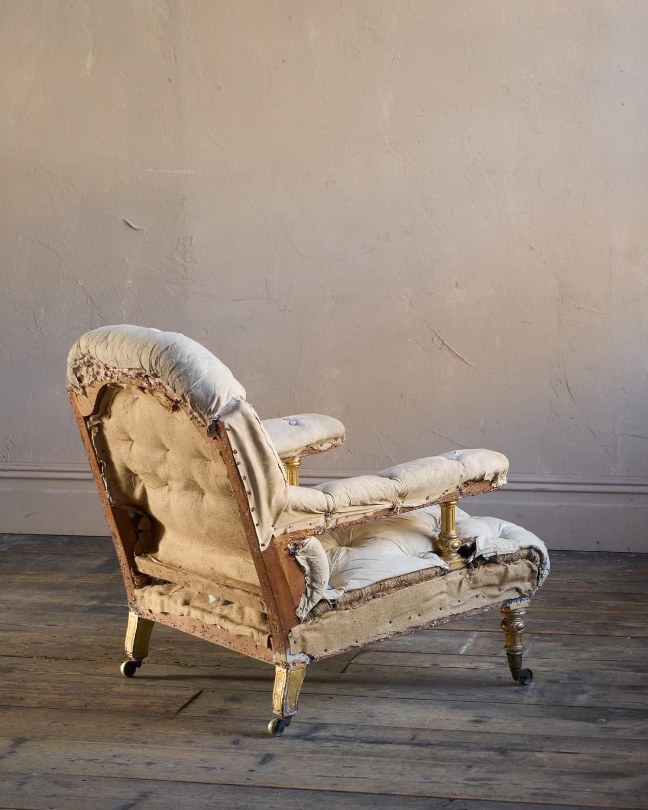 A comfortable and good looking armchair has open arms with gilt uprights, gilt front and back legs and with traditional upholstery throughout.
