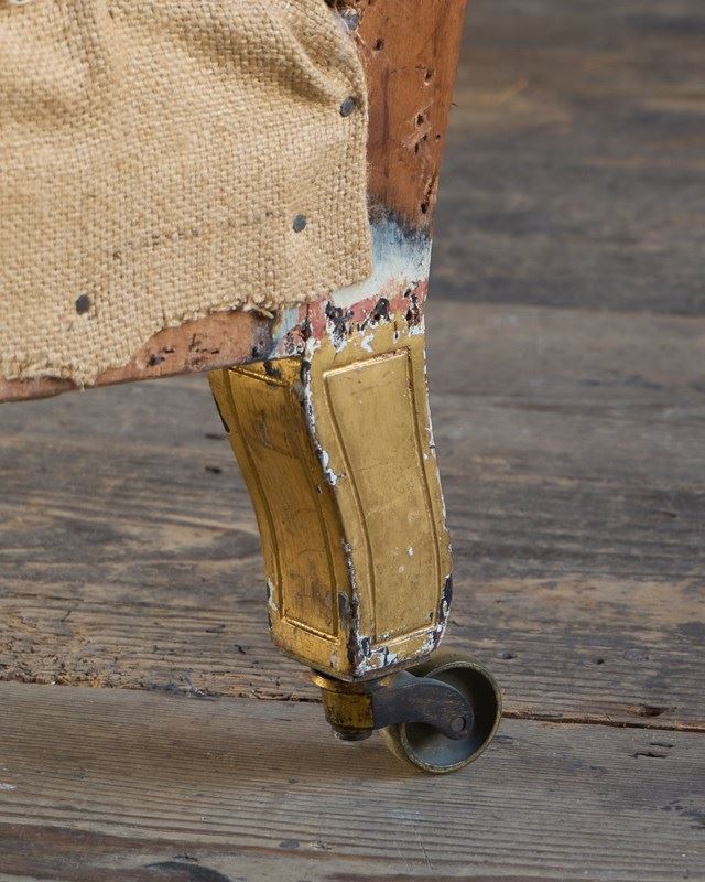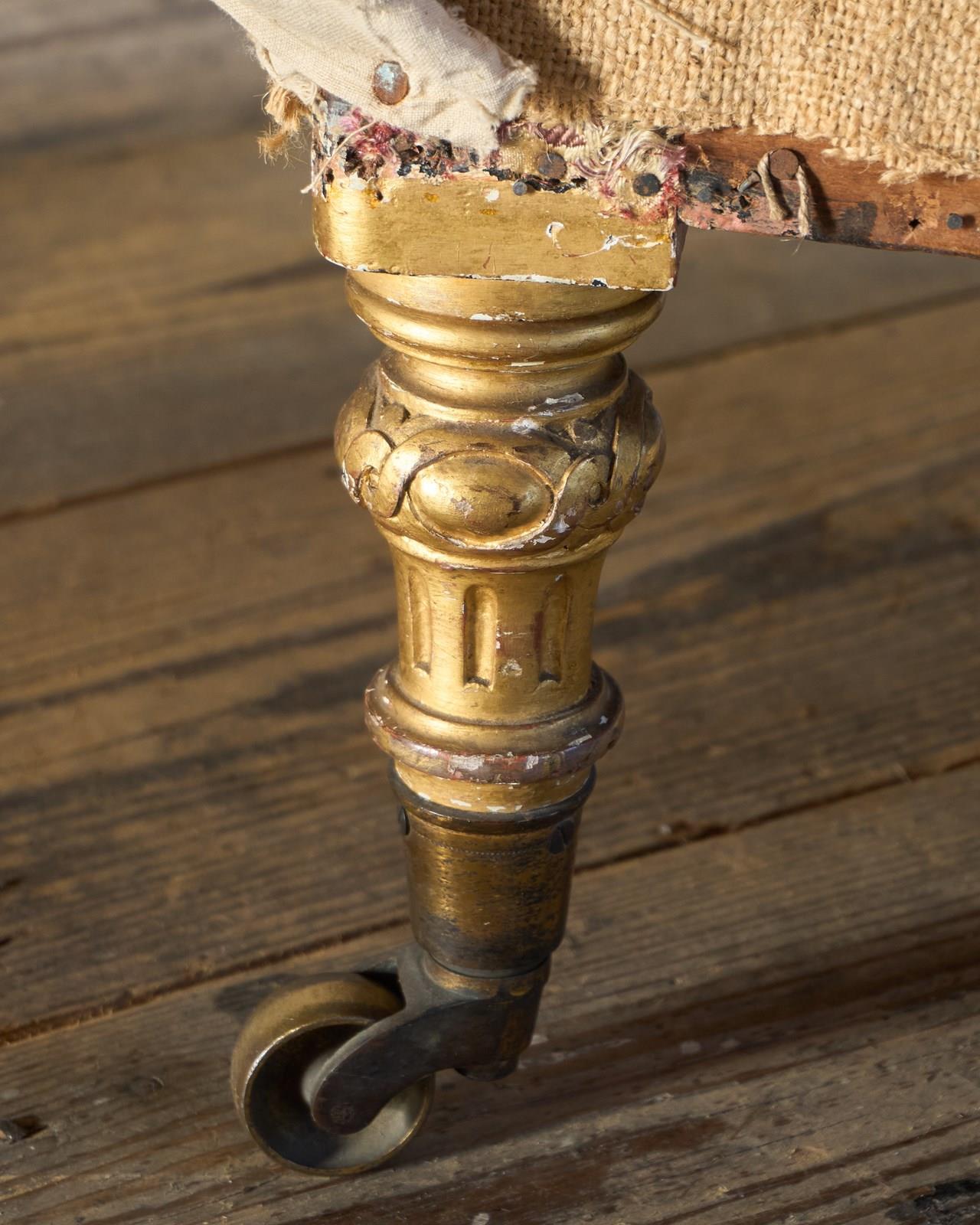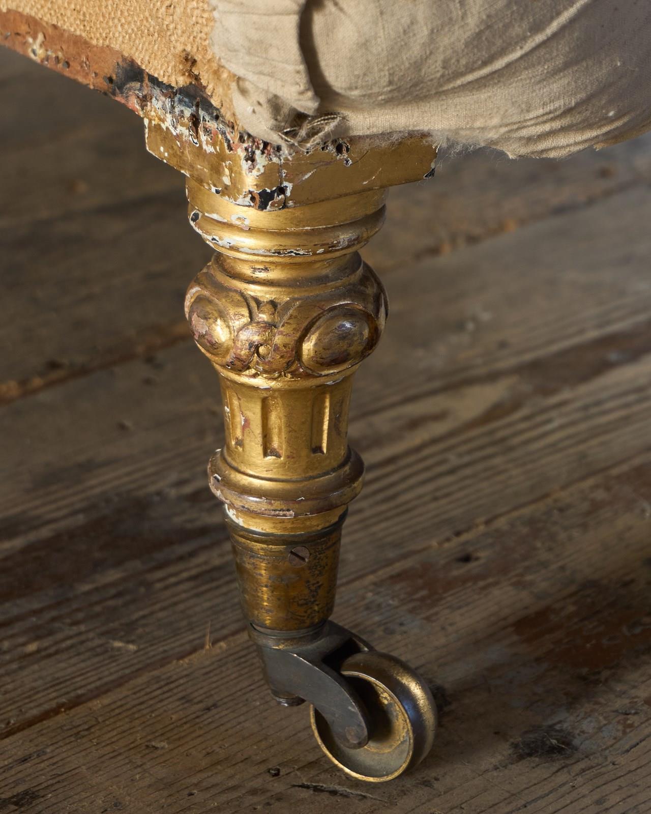 The front legs have been turned and carved with fluting and gadroons with knots and have the original gilt cope castors, and the back legs are splayed with line carving and the original gilt castors by cope.