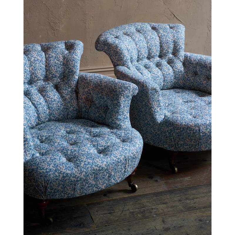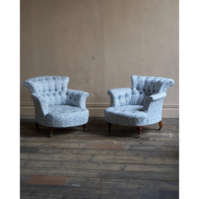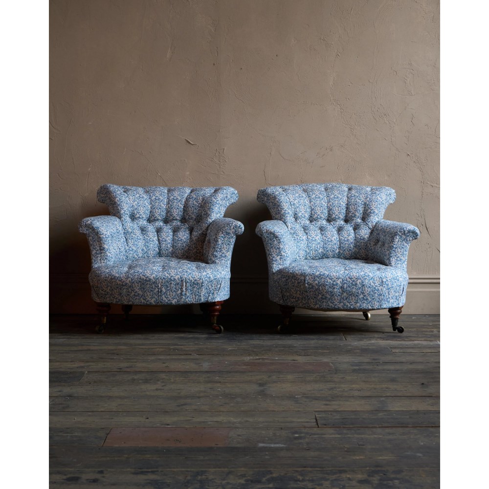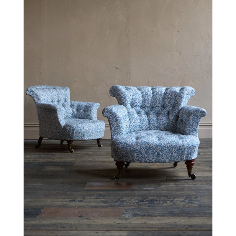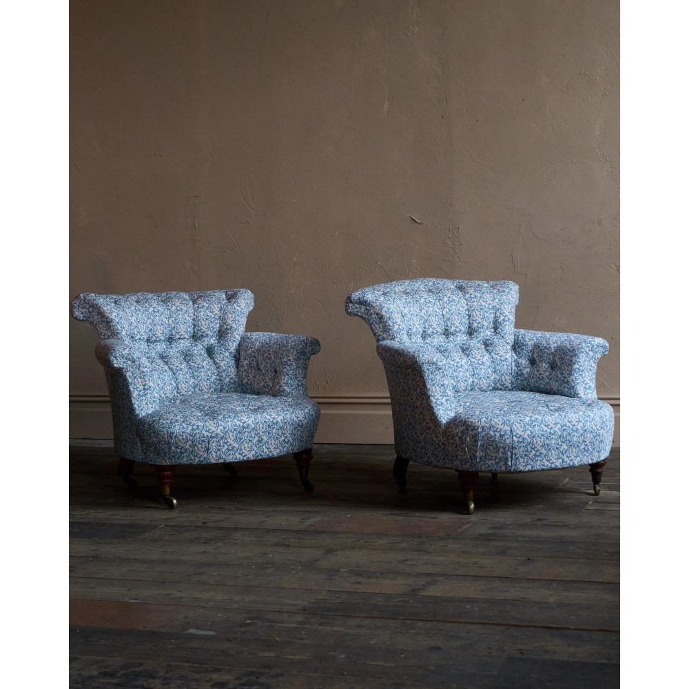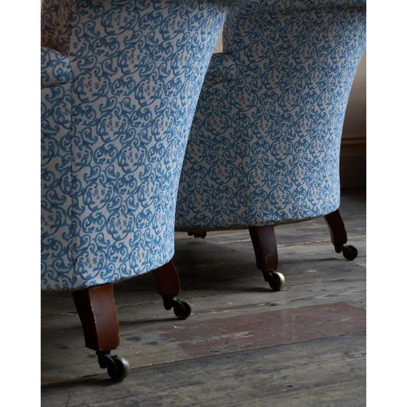 A matched pair of 19th century Howard & Sons armchairs, raised on Howard's uniquely turned walnut legs and retaining the original Cope & Collinson brass gilt castors.