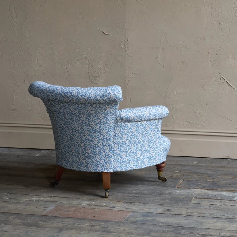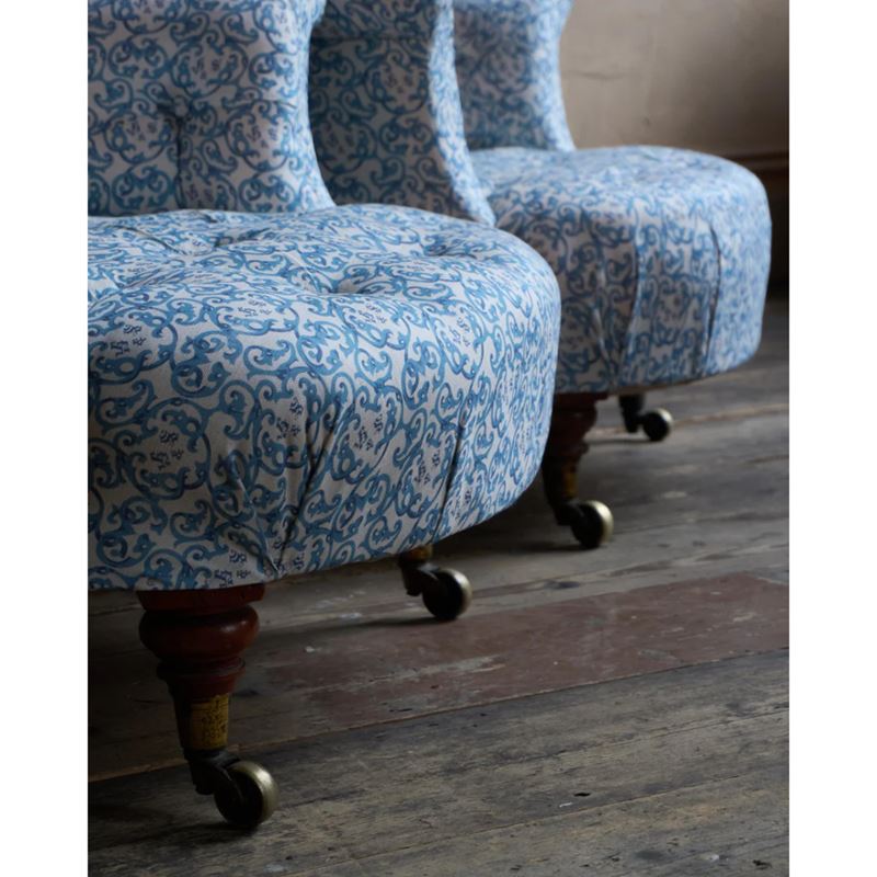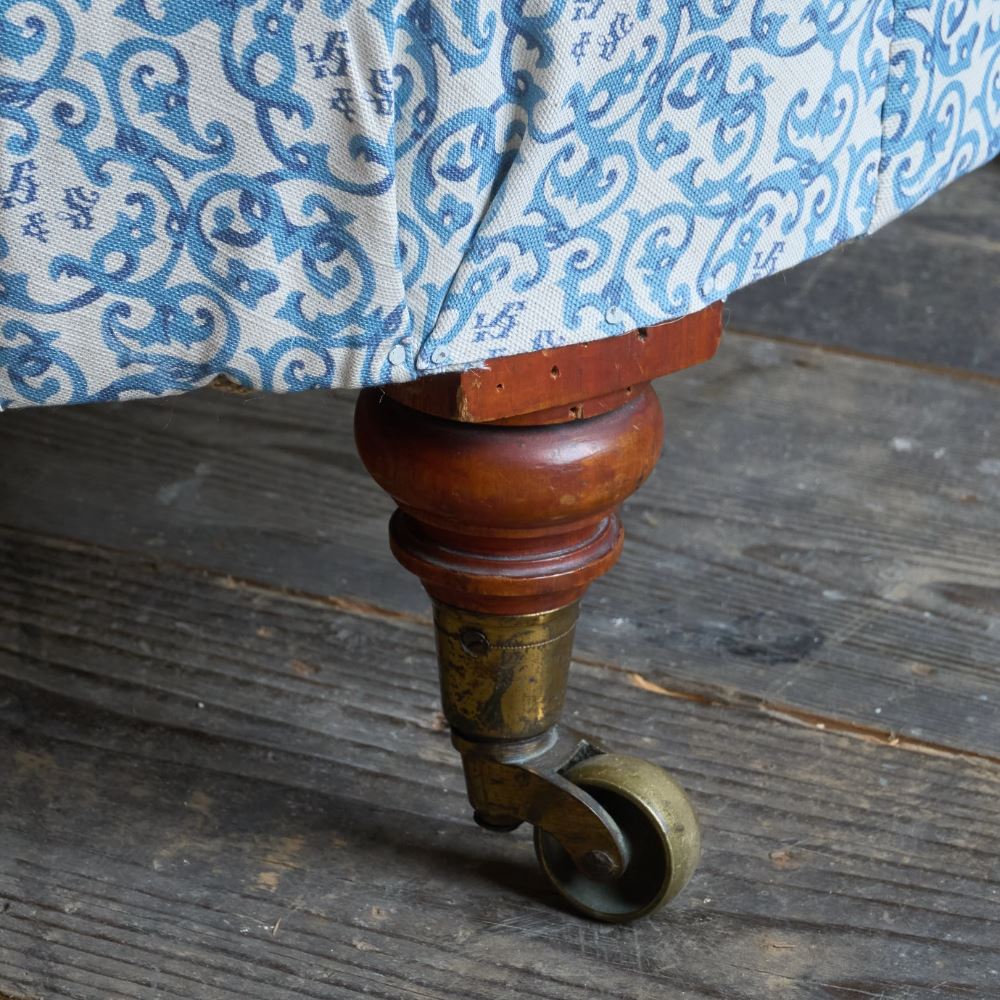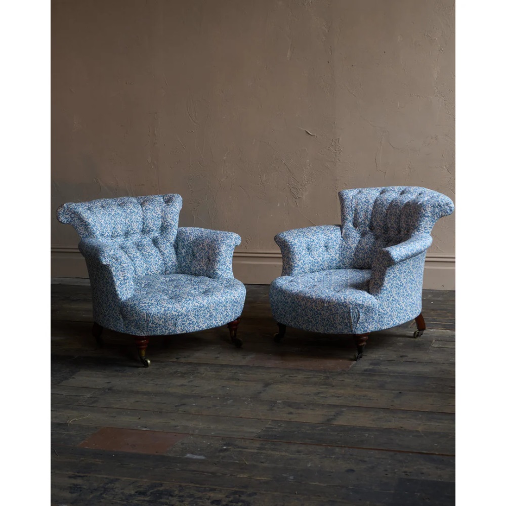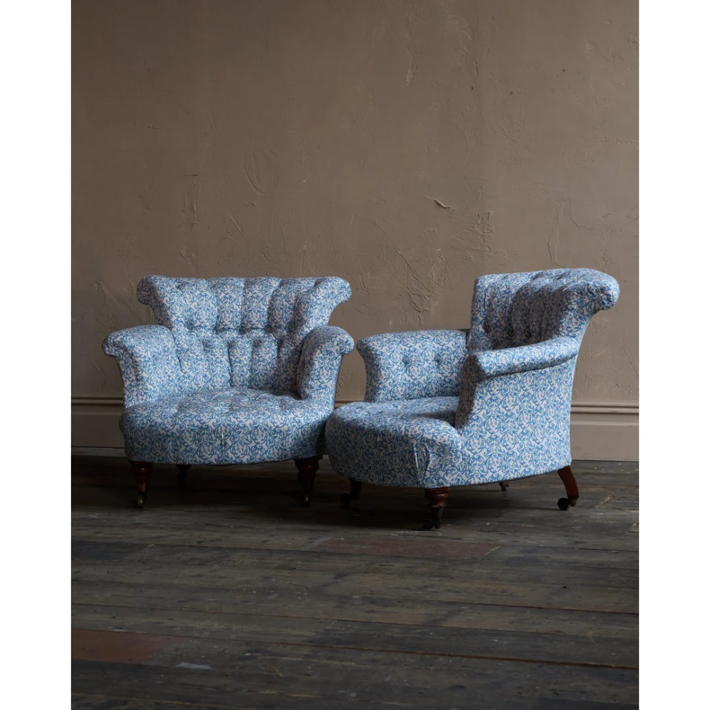 A matched pair of 19th century Howard & Sons armchairs, raised on Howard's uniquely turned walnut legs and retaining the original Cope & Collinson brass gilt castors.