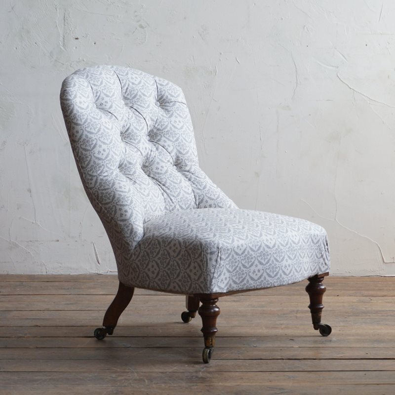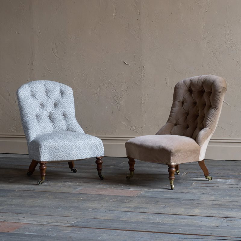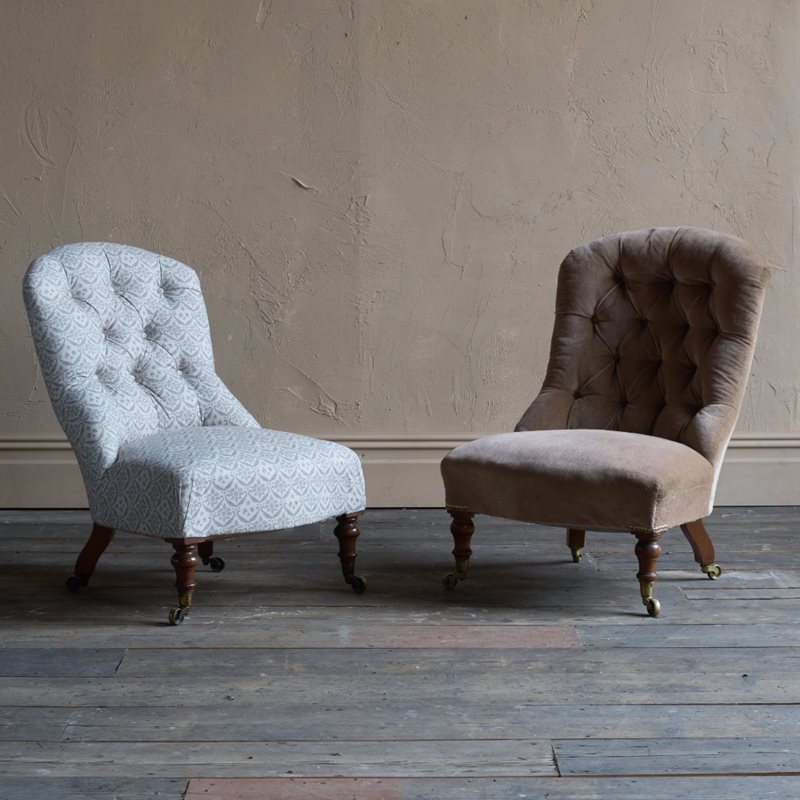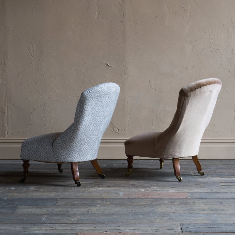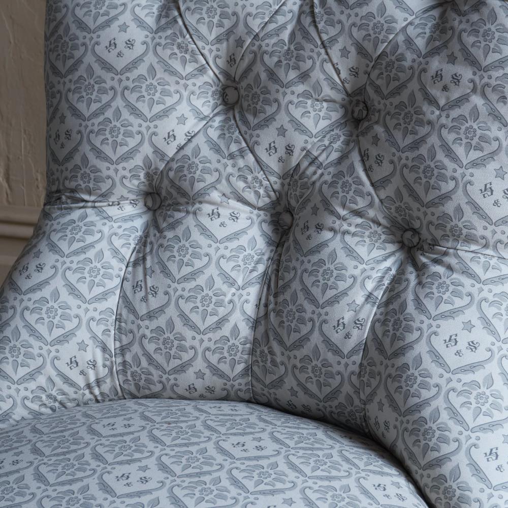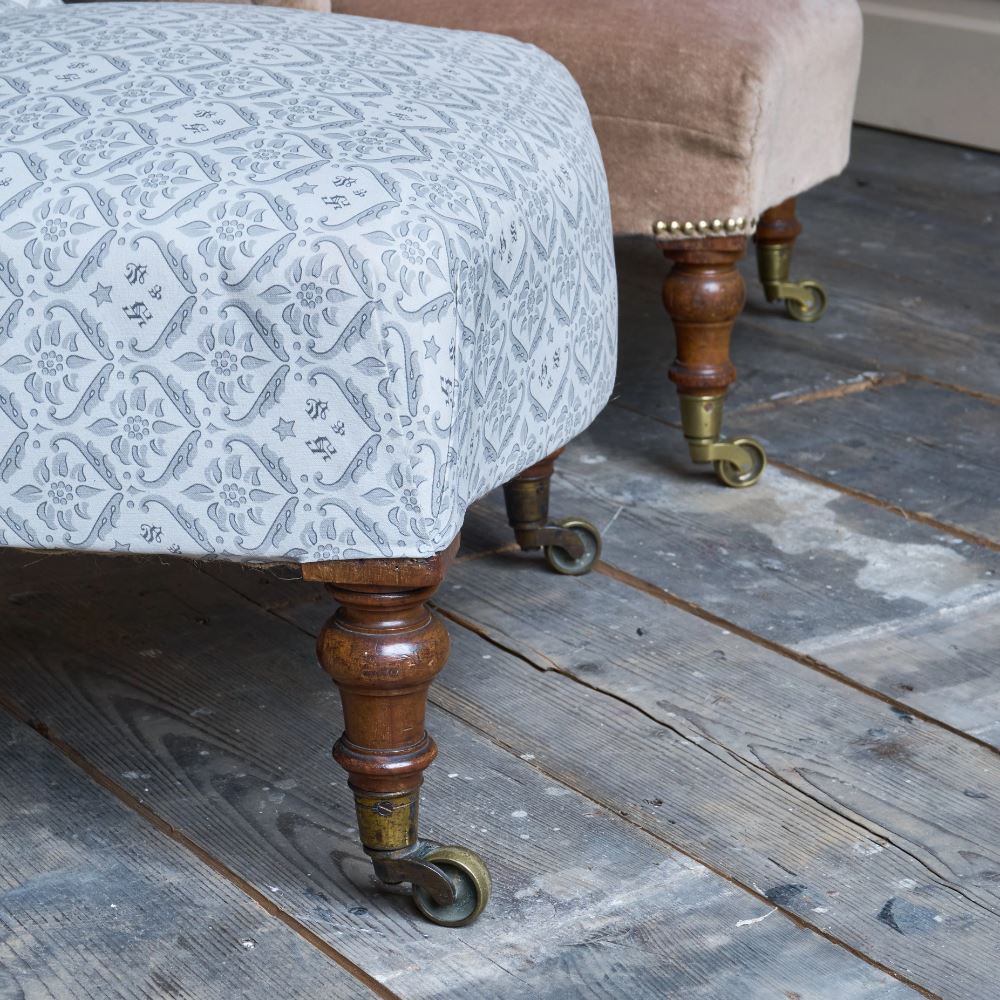 One chair has had full traditional upholstery from the frame up and has been covered in H&S ticking in grey.