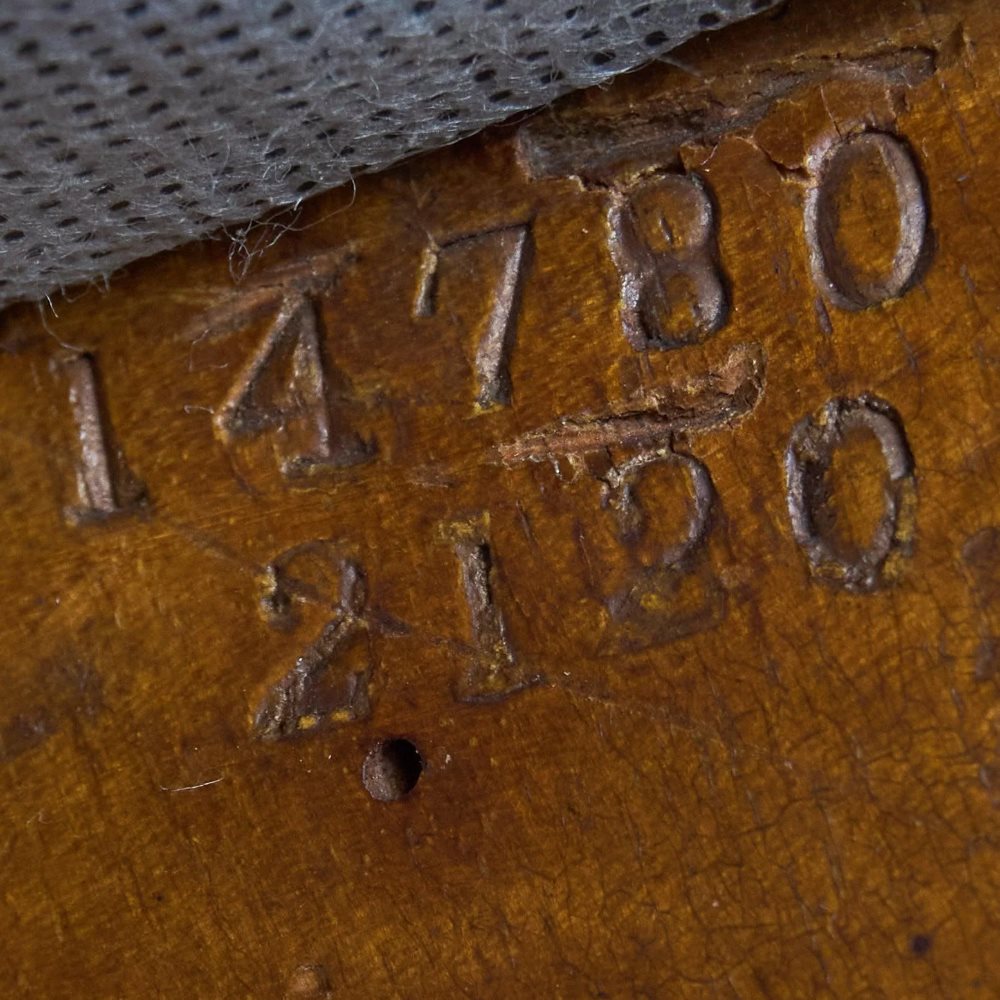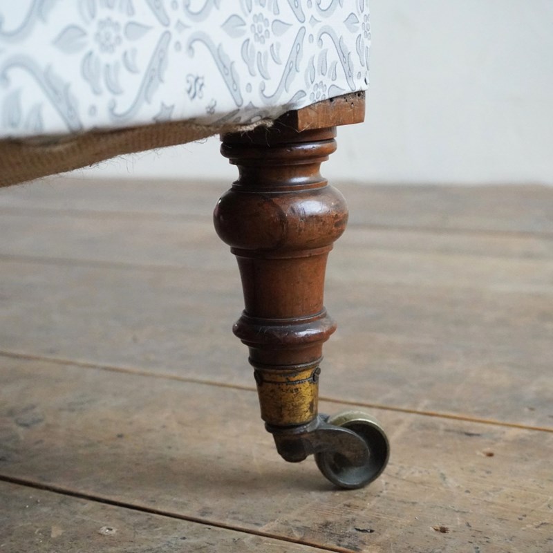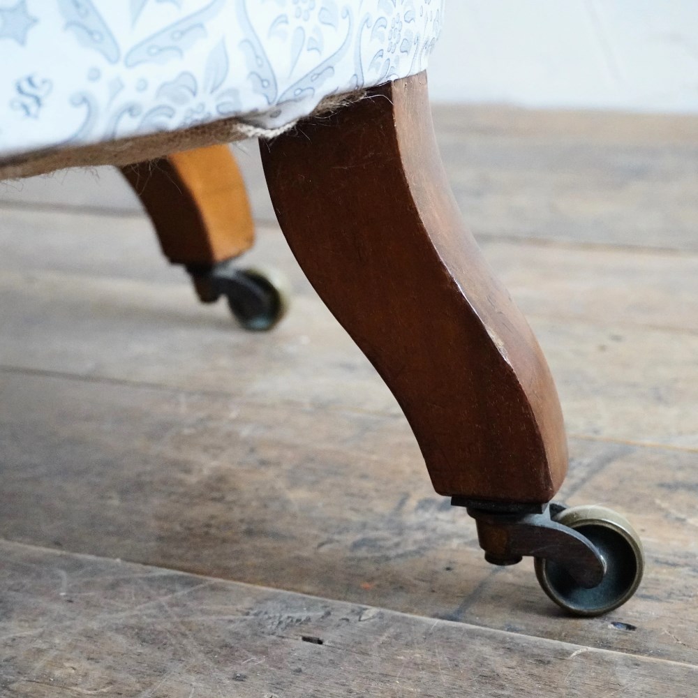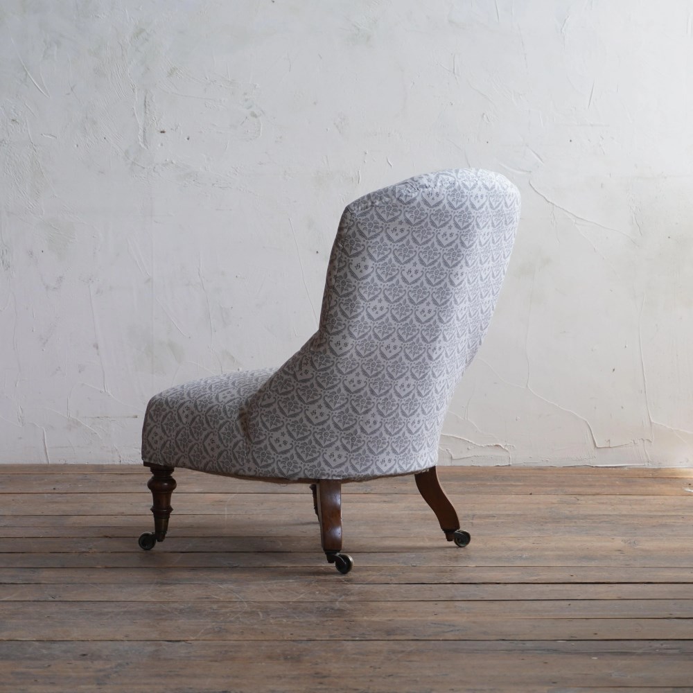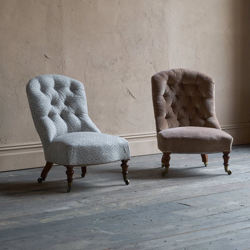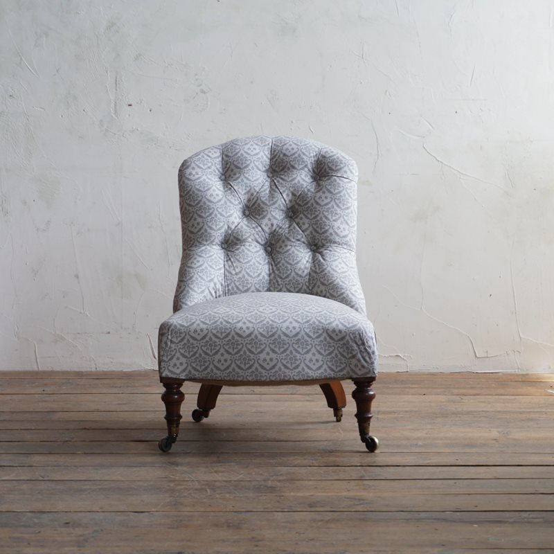 One chair has had full traditional upholstery from the frame up and has been covered in H&S ticking in grey.