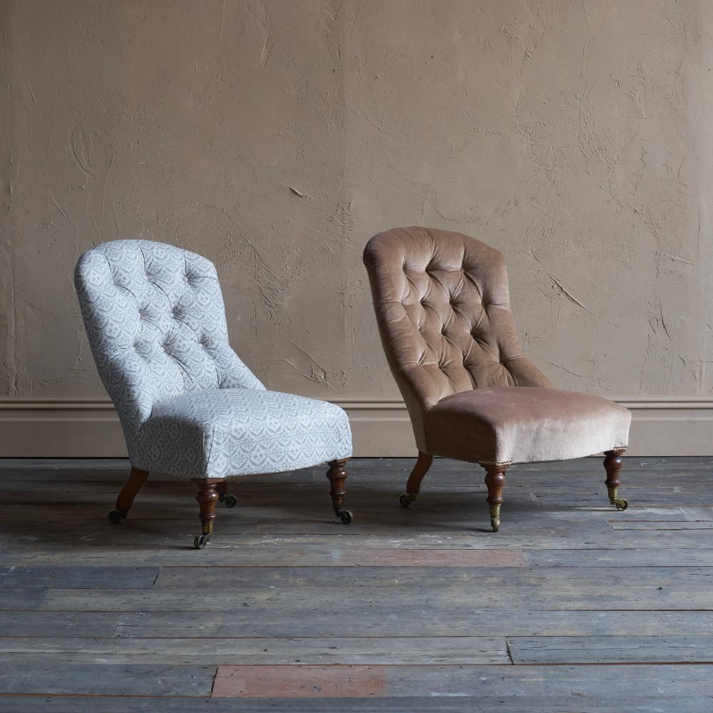 The other chair which is slightly larger is upholstered in taupe coloured velvet so please note that the price includes a recover to this one in the matching grey ticking.