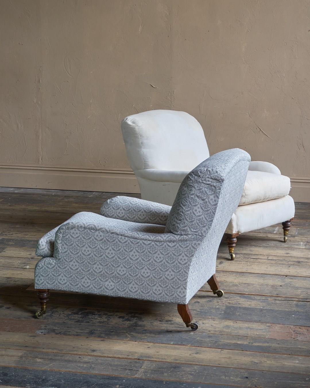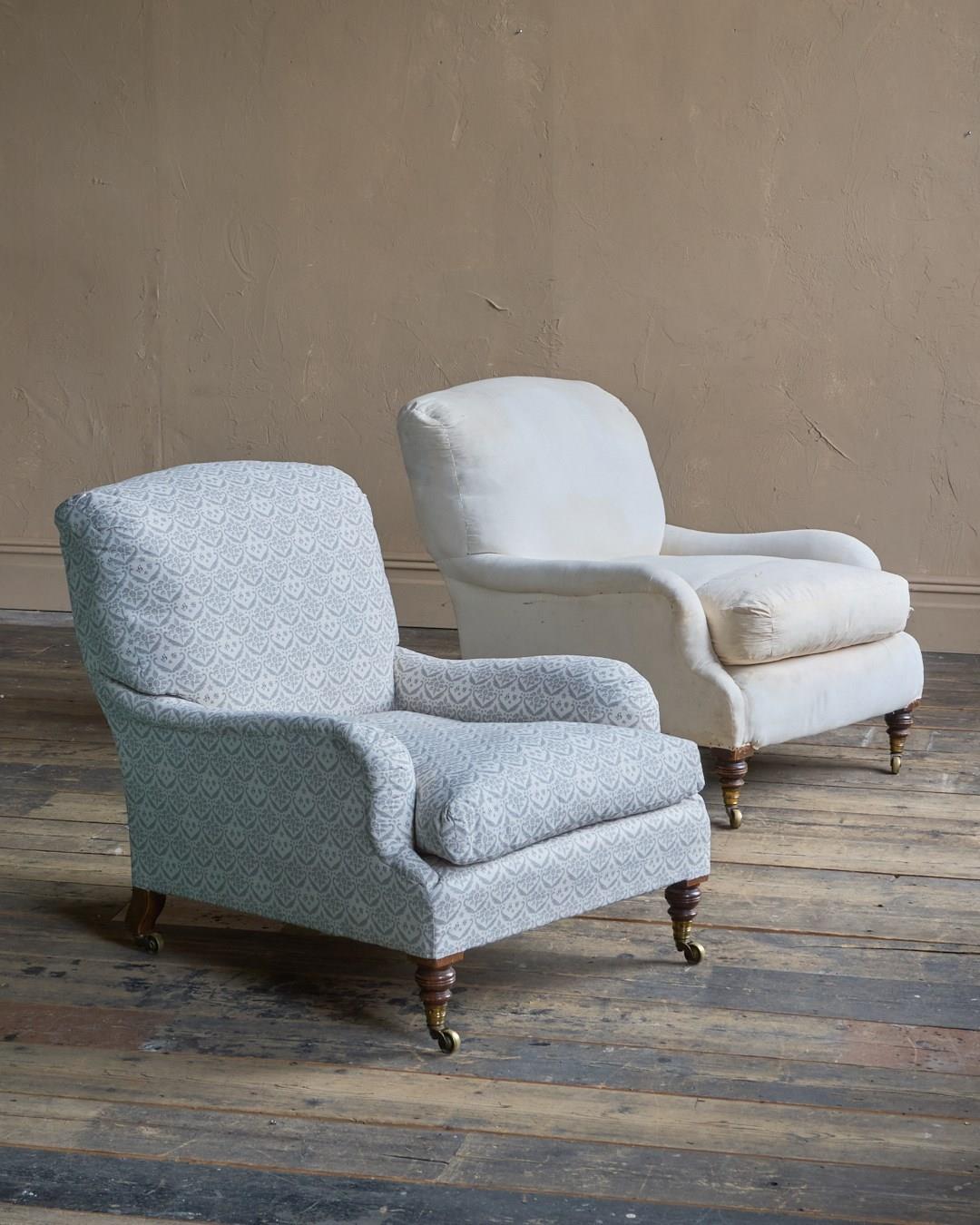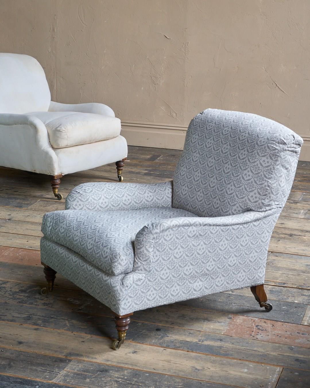One is fully restored and traditionally upholstered in H&S ticking fabric in pale grey, the price includes completing the second to match.