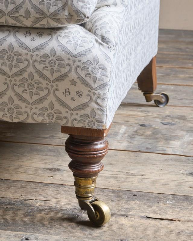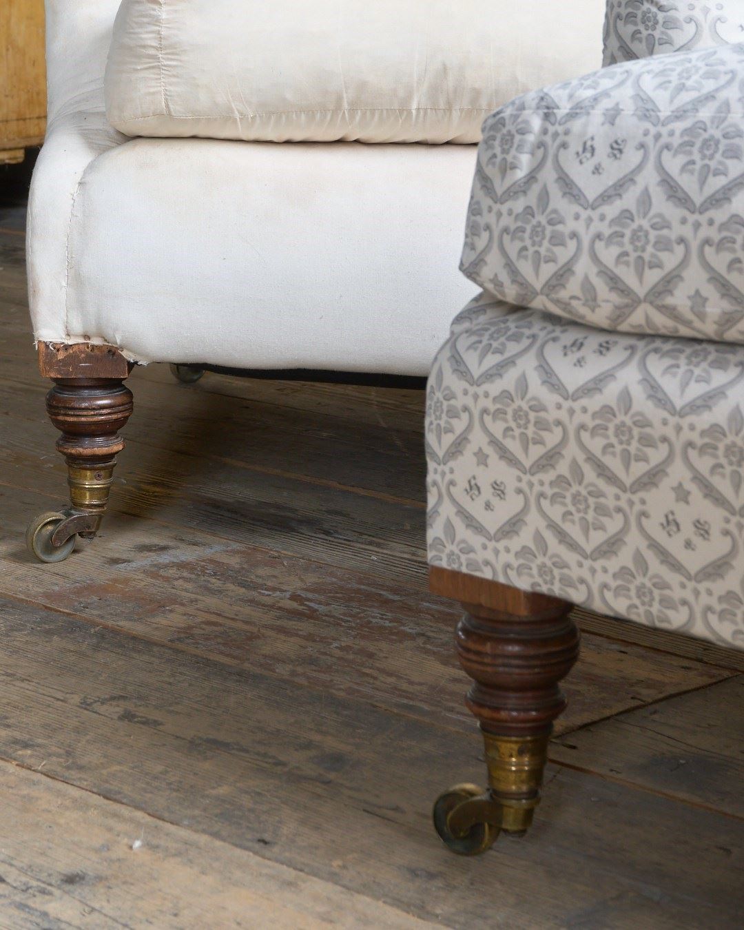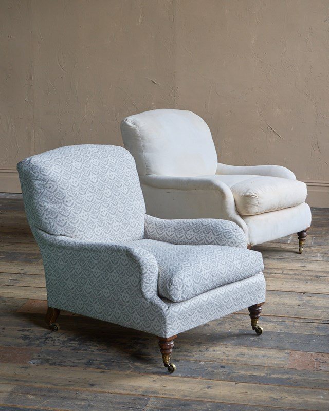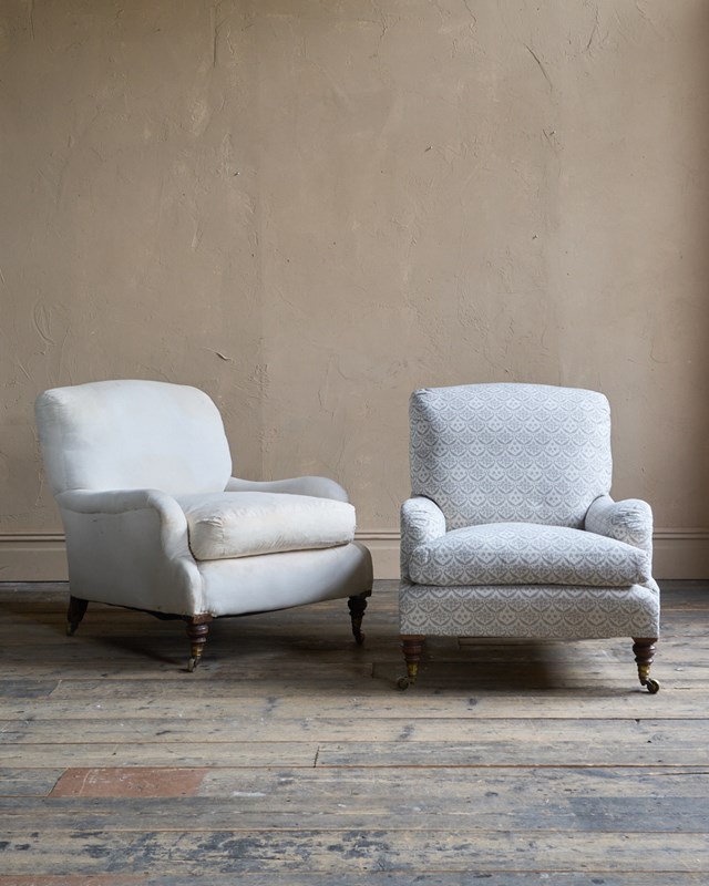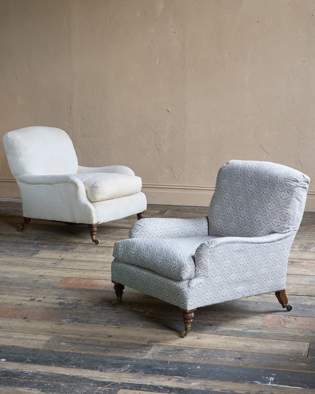 One is fully restored and traditionally upholstered in H&S ticking fabric in pale grey, the price includes completing the second to match.