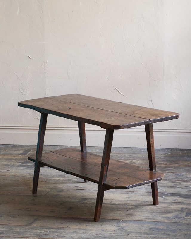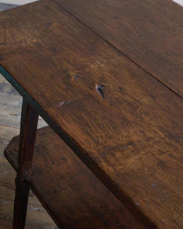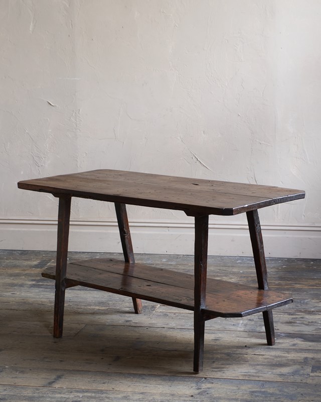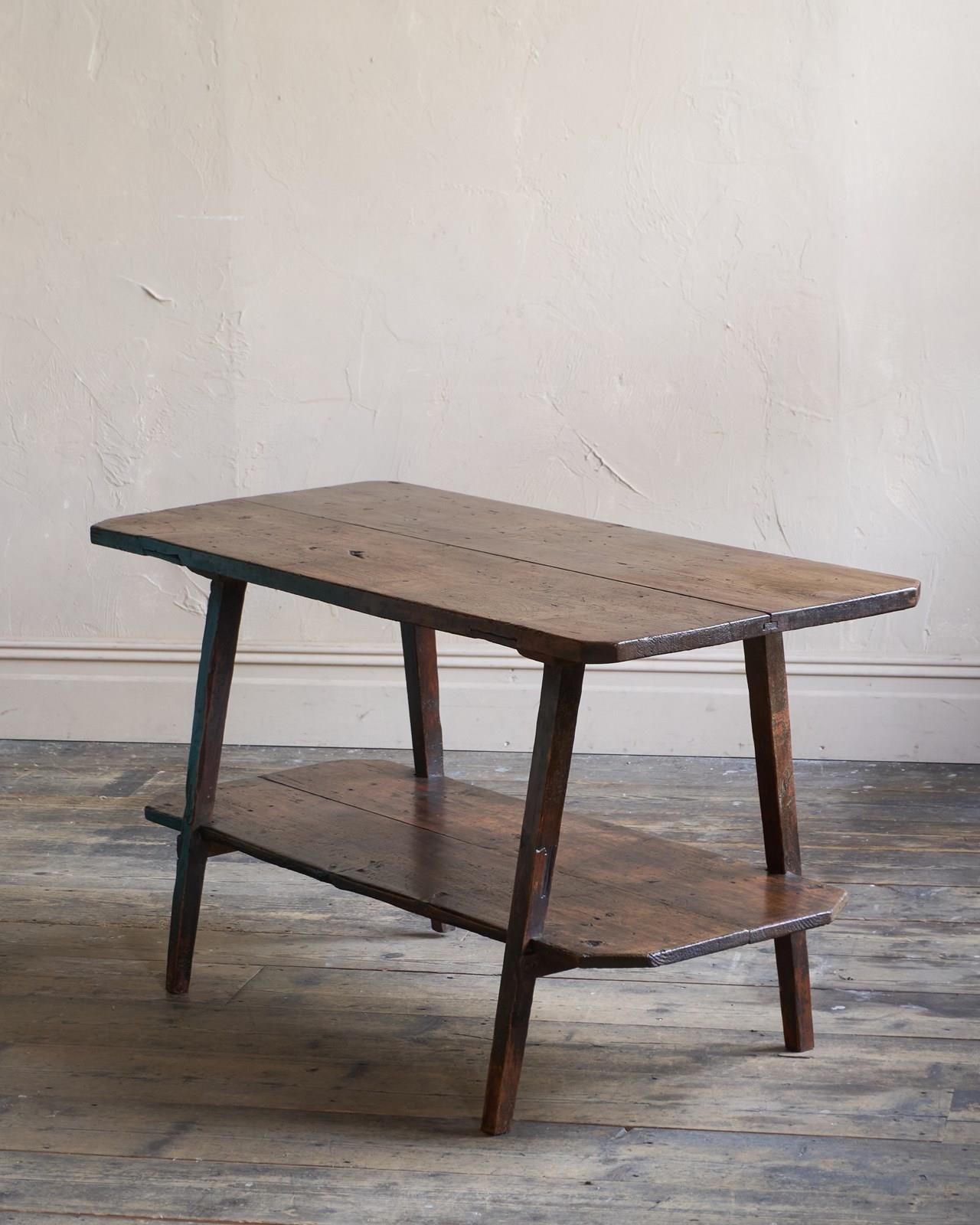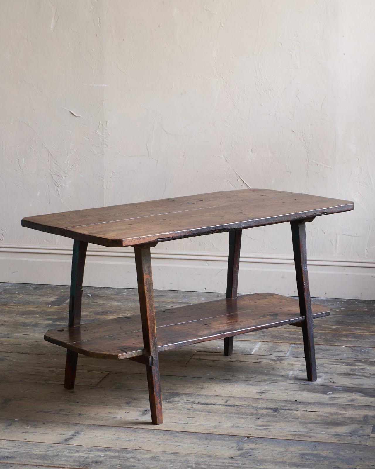 Originating from Northern Europe, c 1890. This vernacular table is all original and constructed with pine and has dry dovetailed and pegged joints. Two planks with rounded edges to the table top and the lower tier.