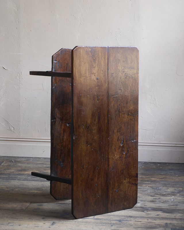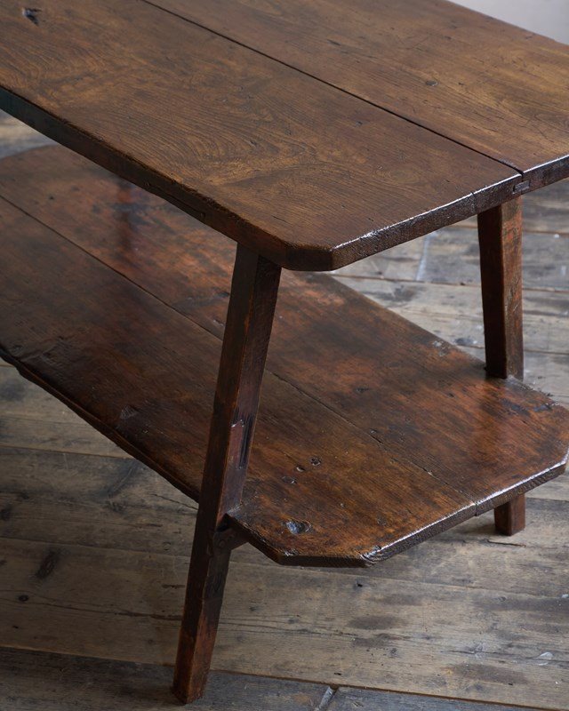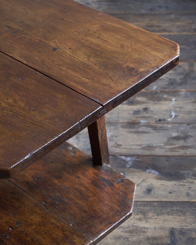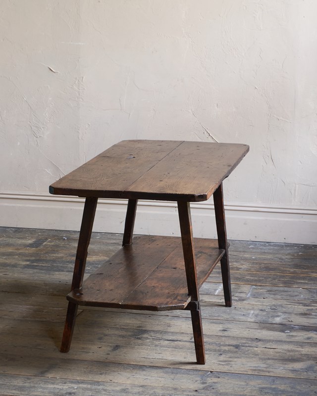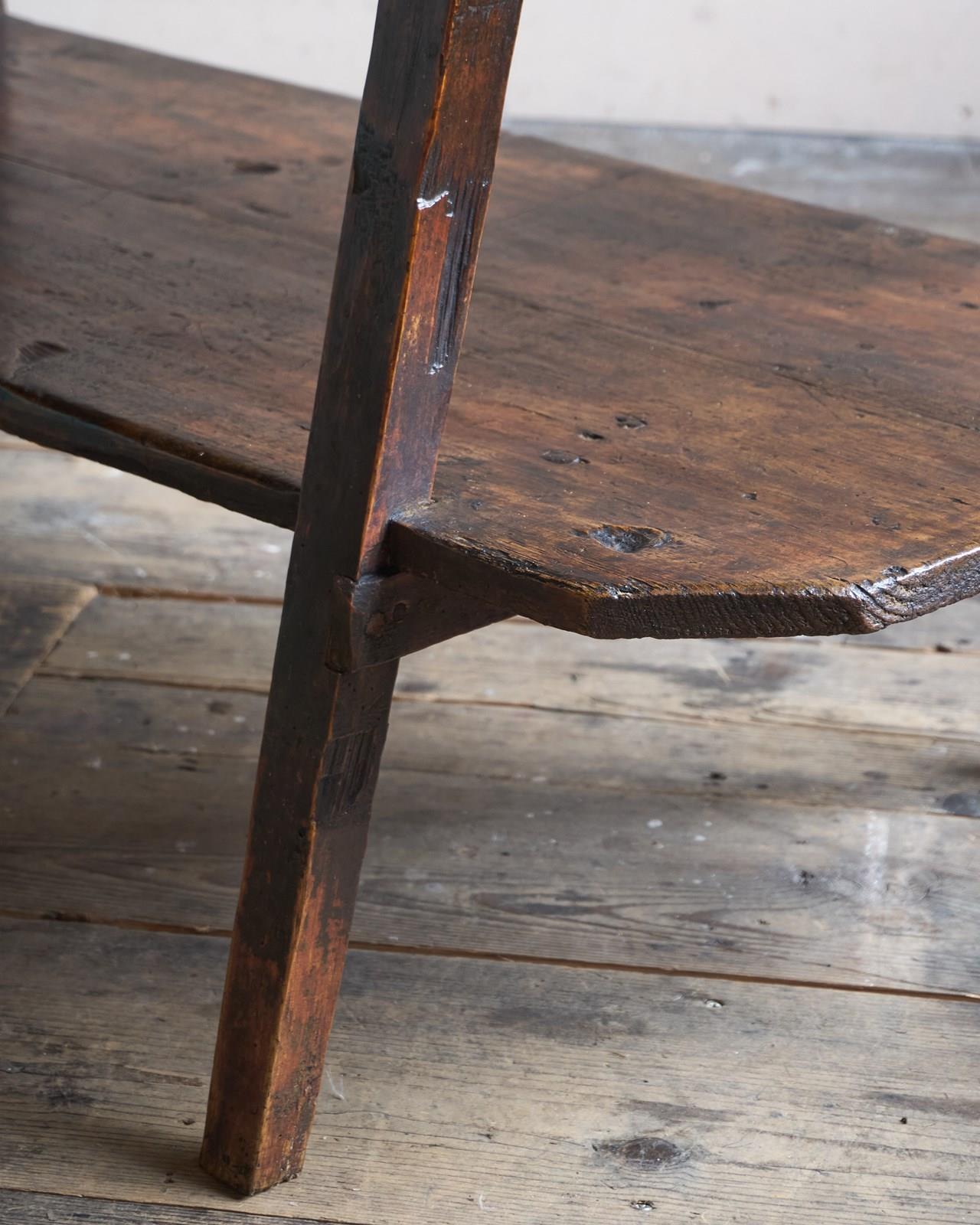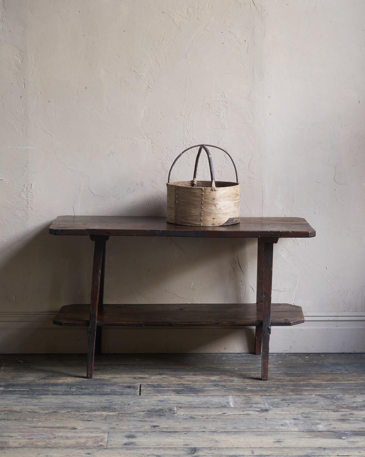 Originating from Northern Europe, c 1890. This vernacular table is all original and constructed with pine and has dry dovetailed and pegged joints. Two planks with rounded edges to the table top and the lower tier.