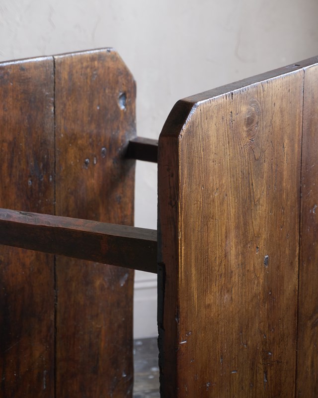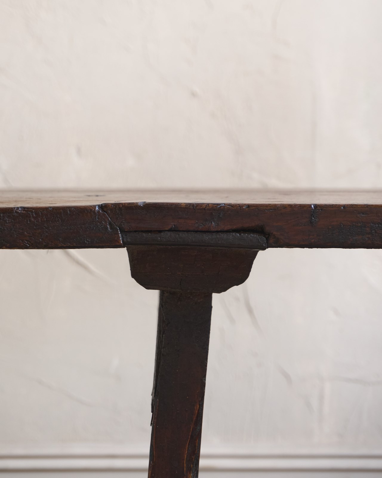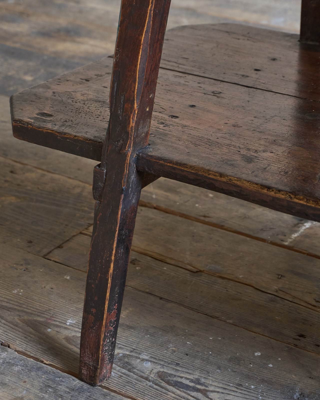 Remains of the purple brown 'falu' paint to the lower shelf and the legs, which has distressing, losses and discoloration throughout. The top is a warm brown colour.