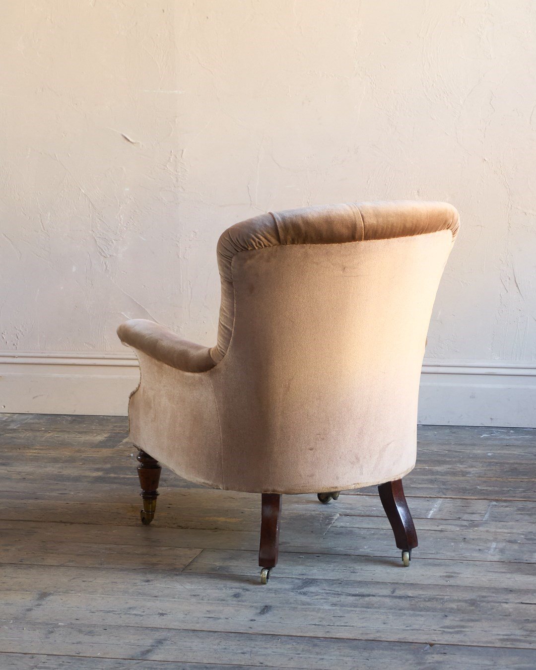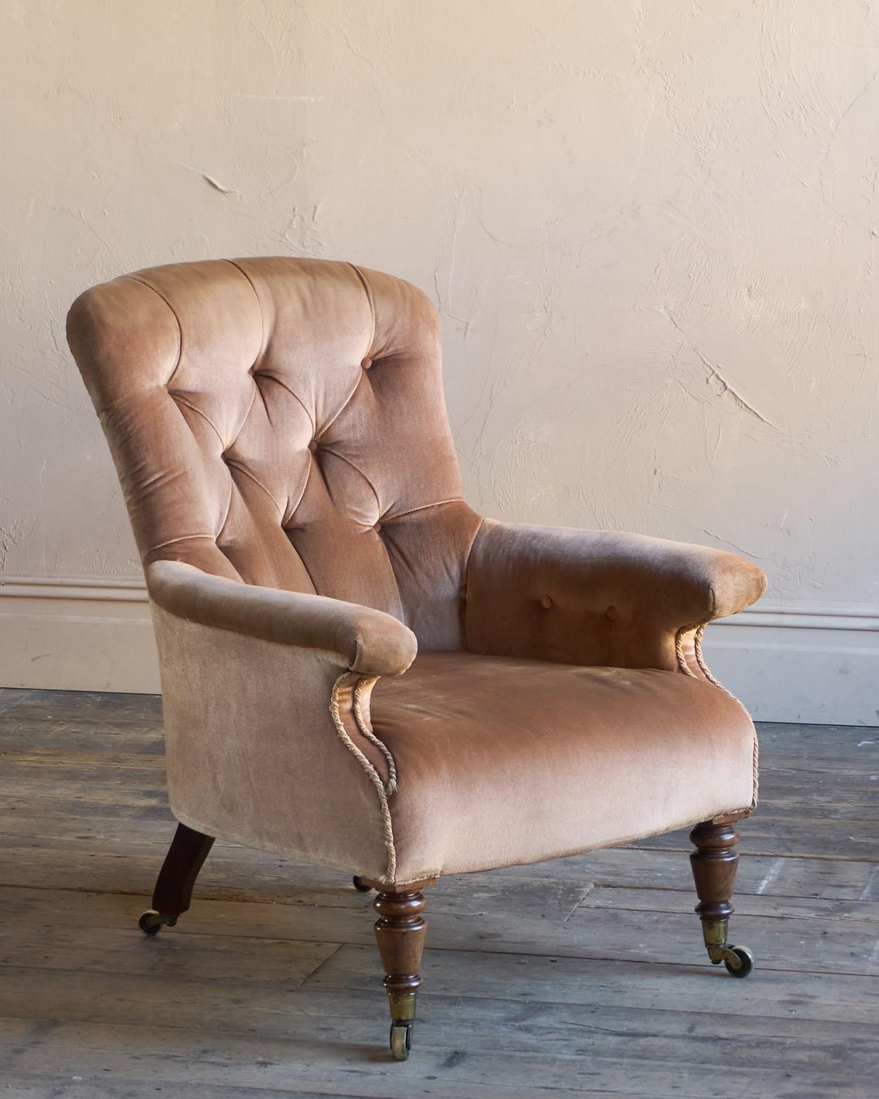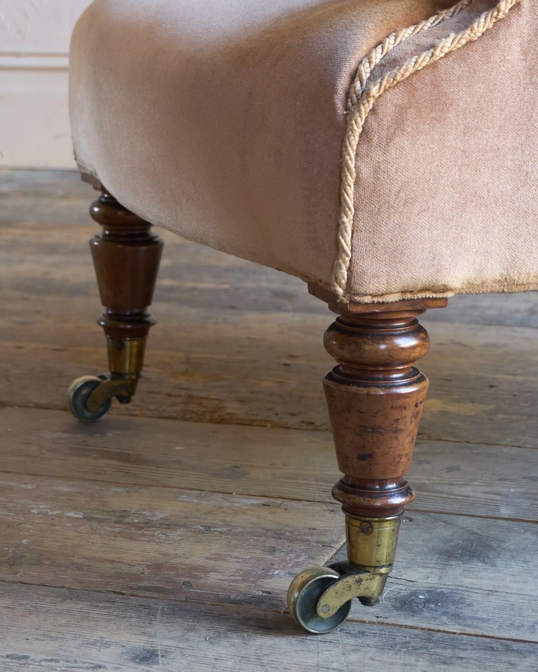 Traditionally upholstered throughout with a sprung seat and horsehair fillings.