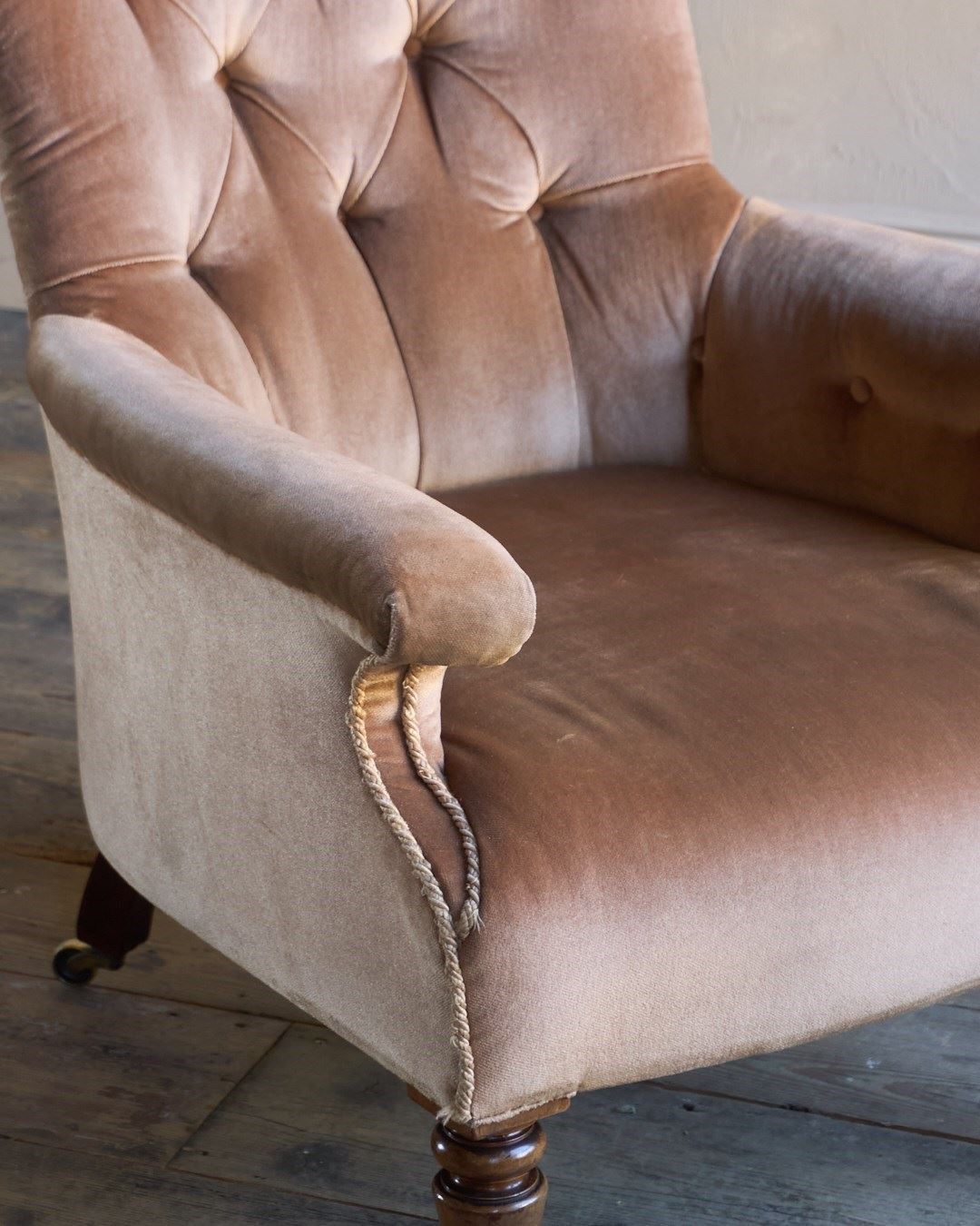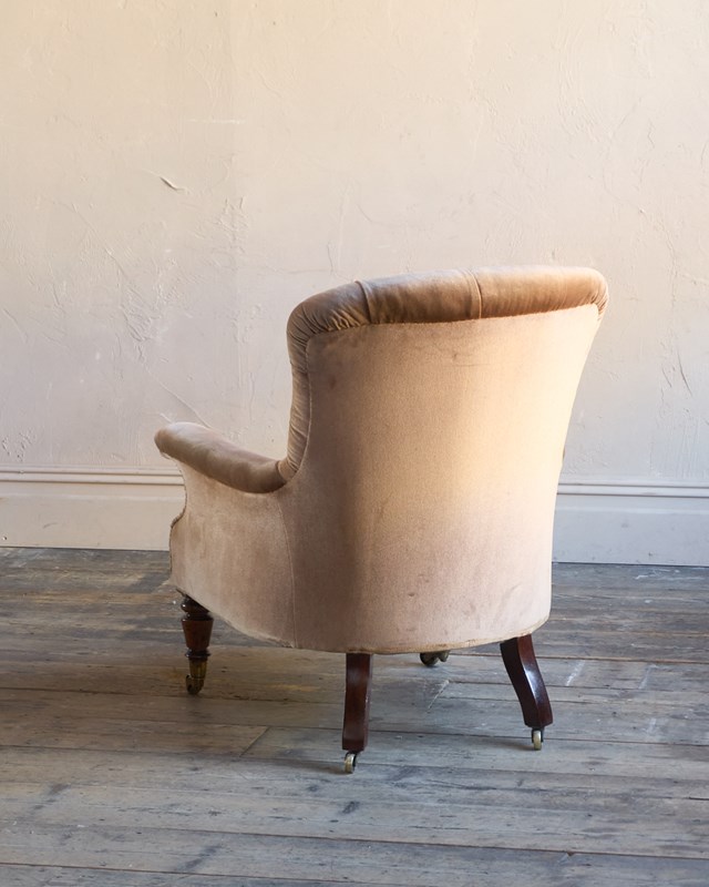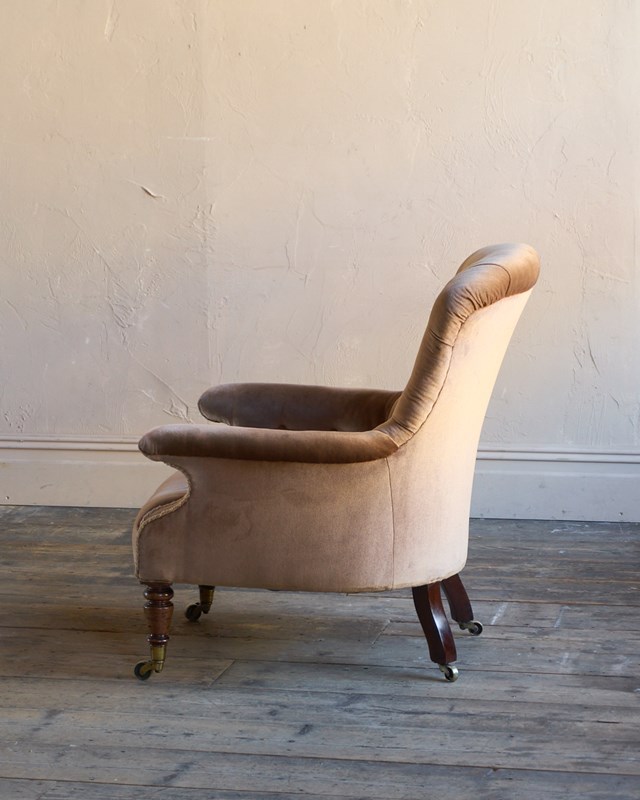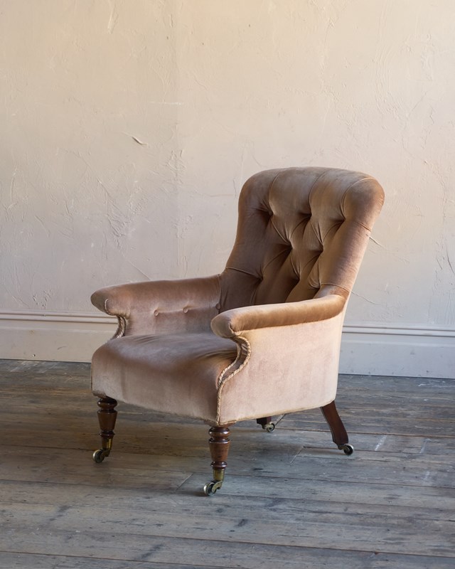Flat arm, buttoned spoon-shaped back.