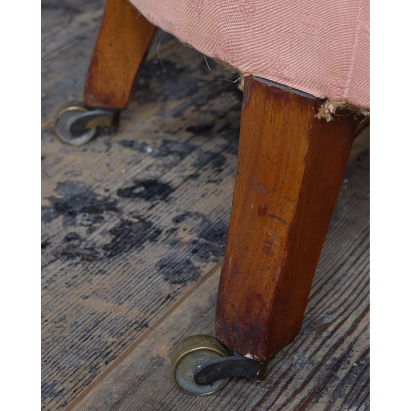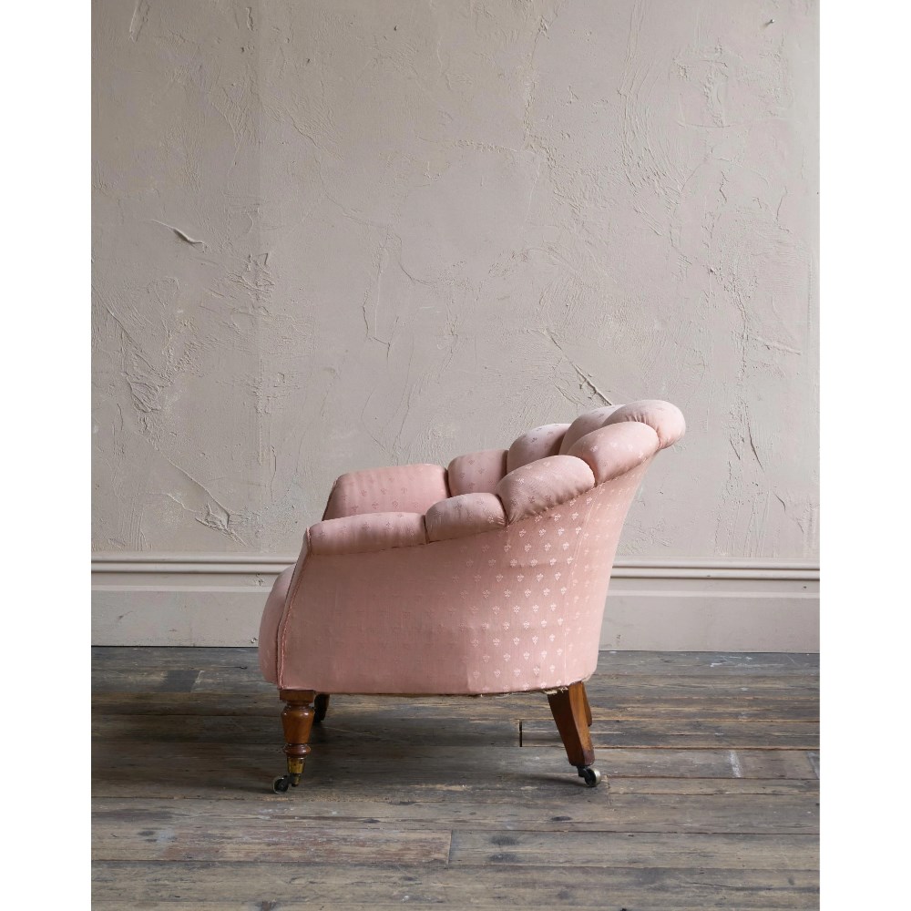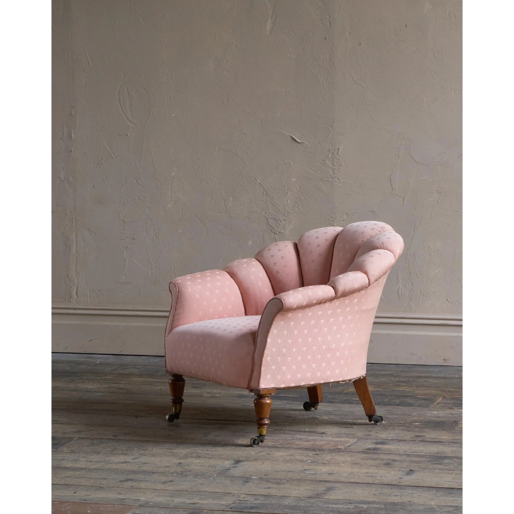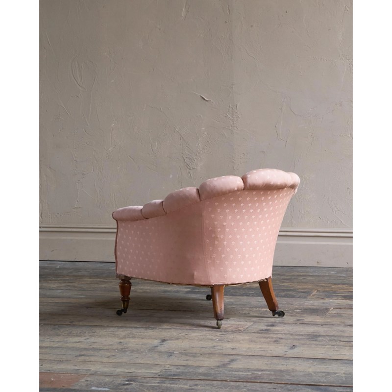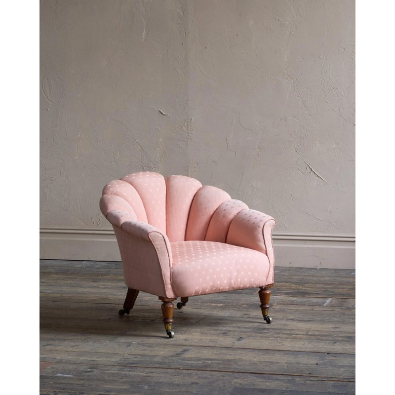 Upholstered in a coral coloured damask fabric with miniature Fleur de lys. Good condition.