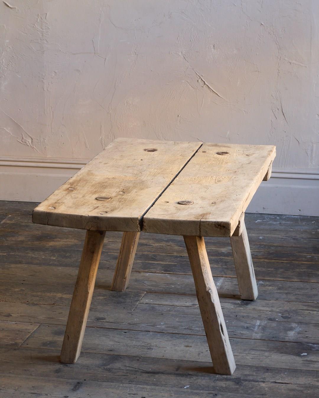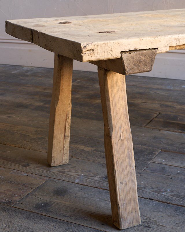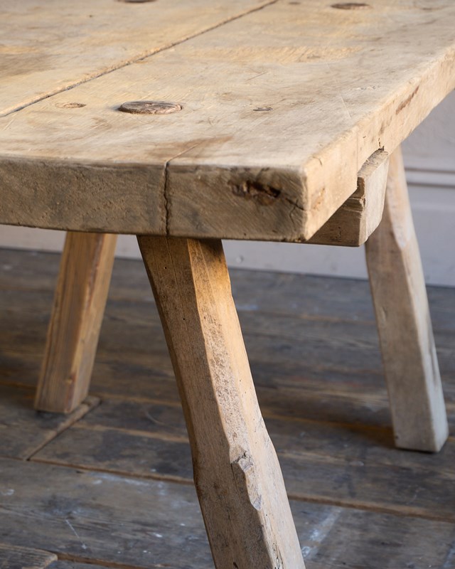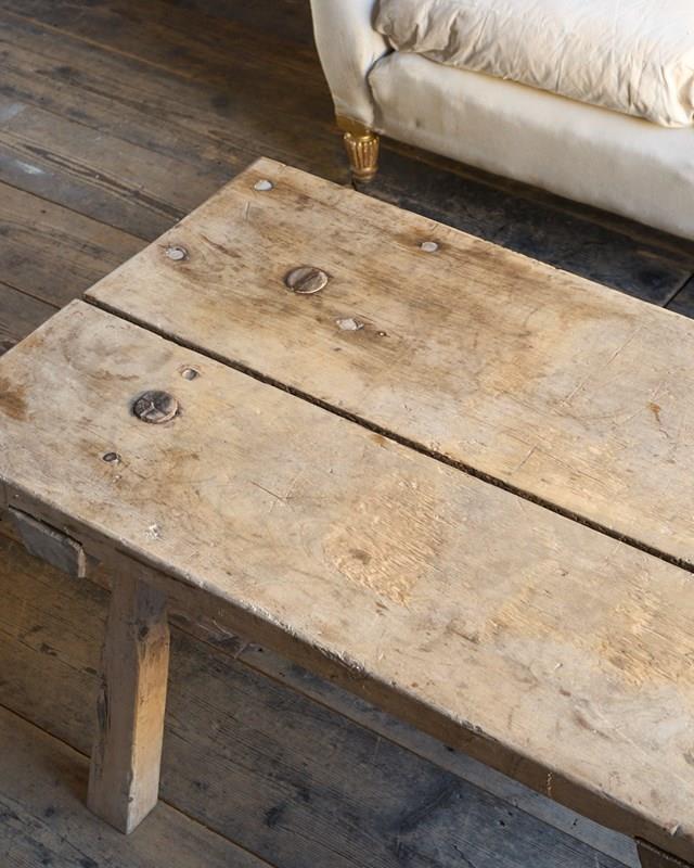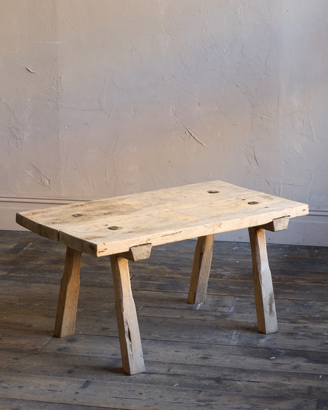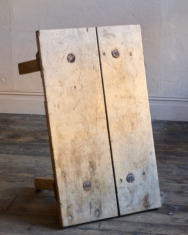 Having a solid sycamore two plank top with various distressing, discoloration, scratches and doweled holes.