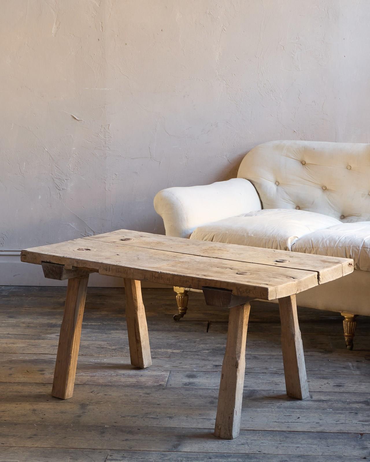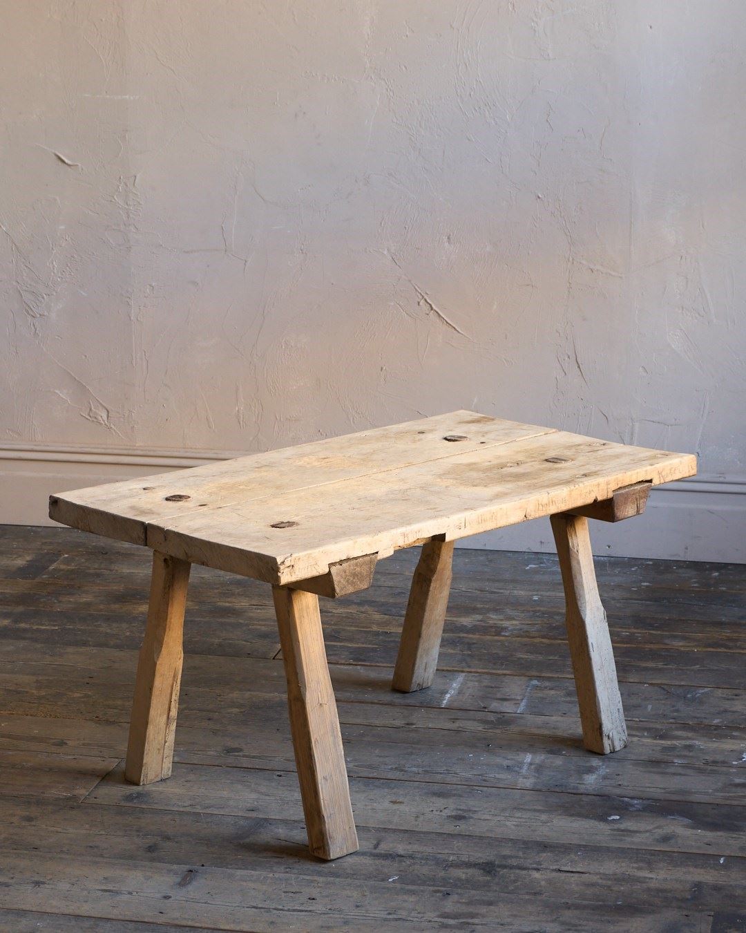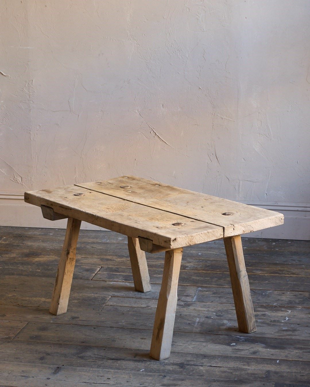 Having a solid sycamore two plank top with various distressing, discoloration, scratches and doweled holes.