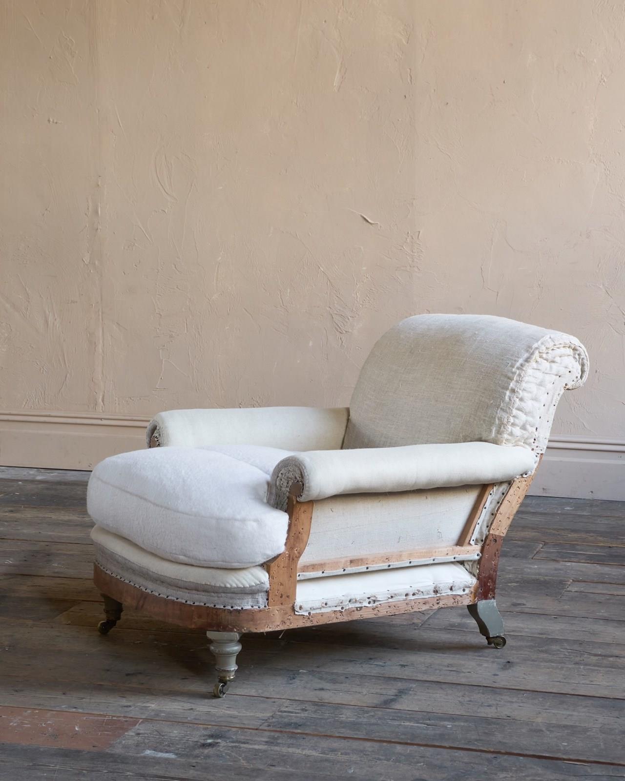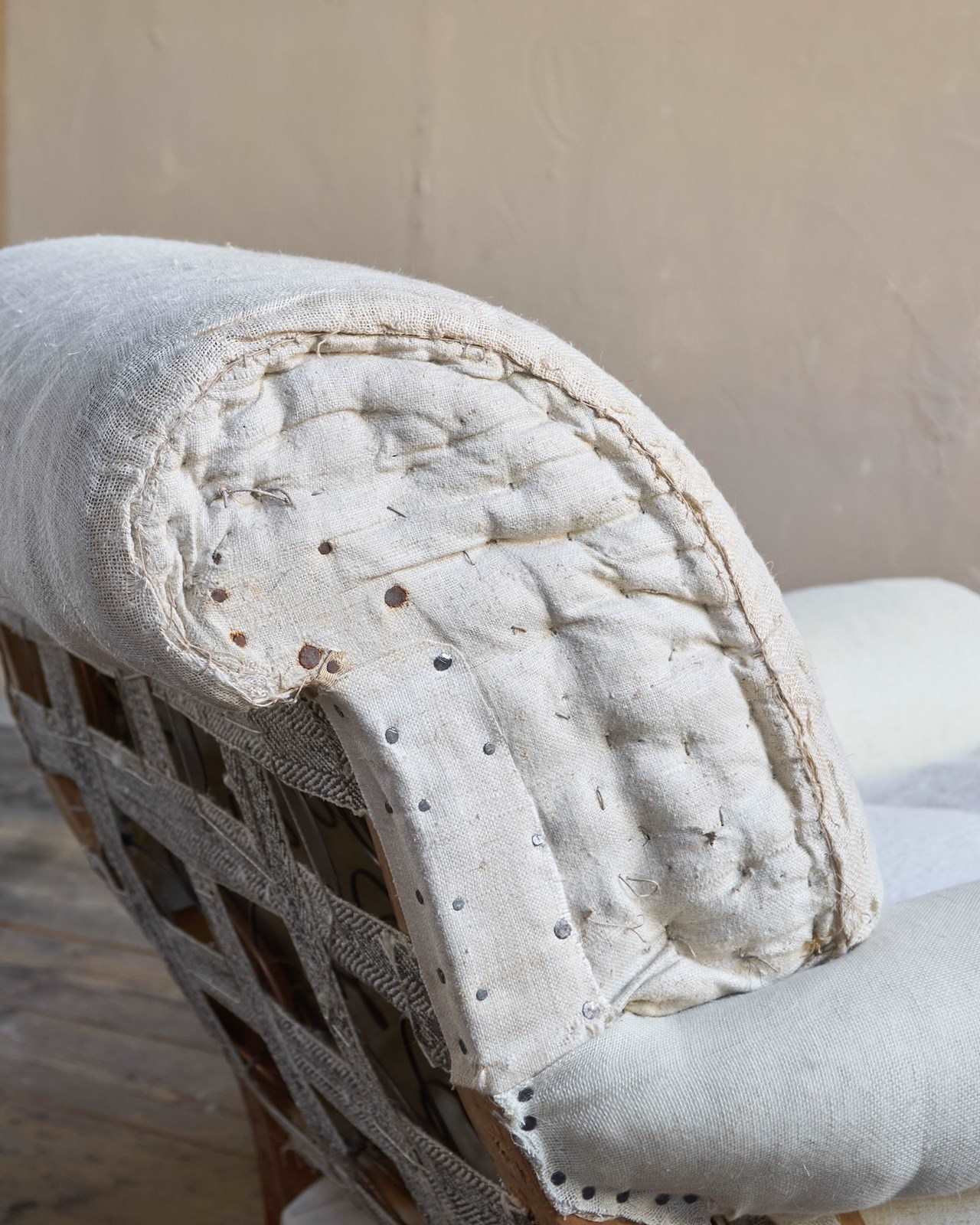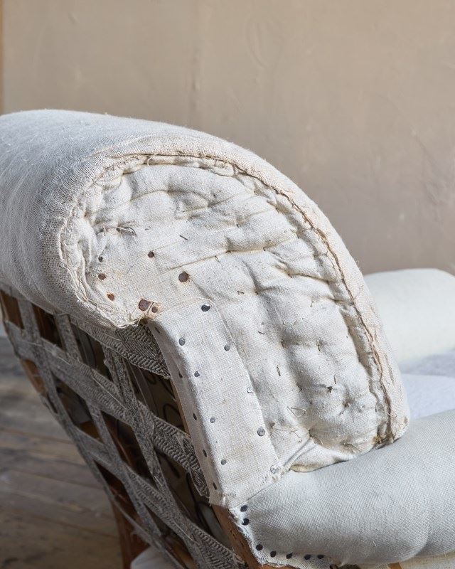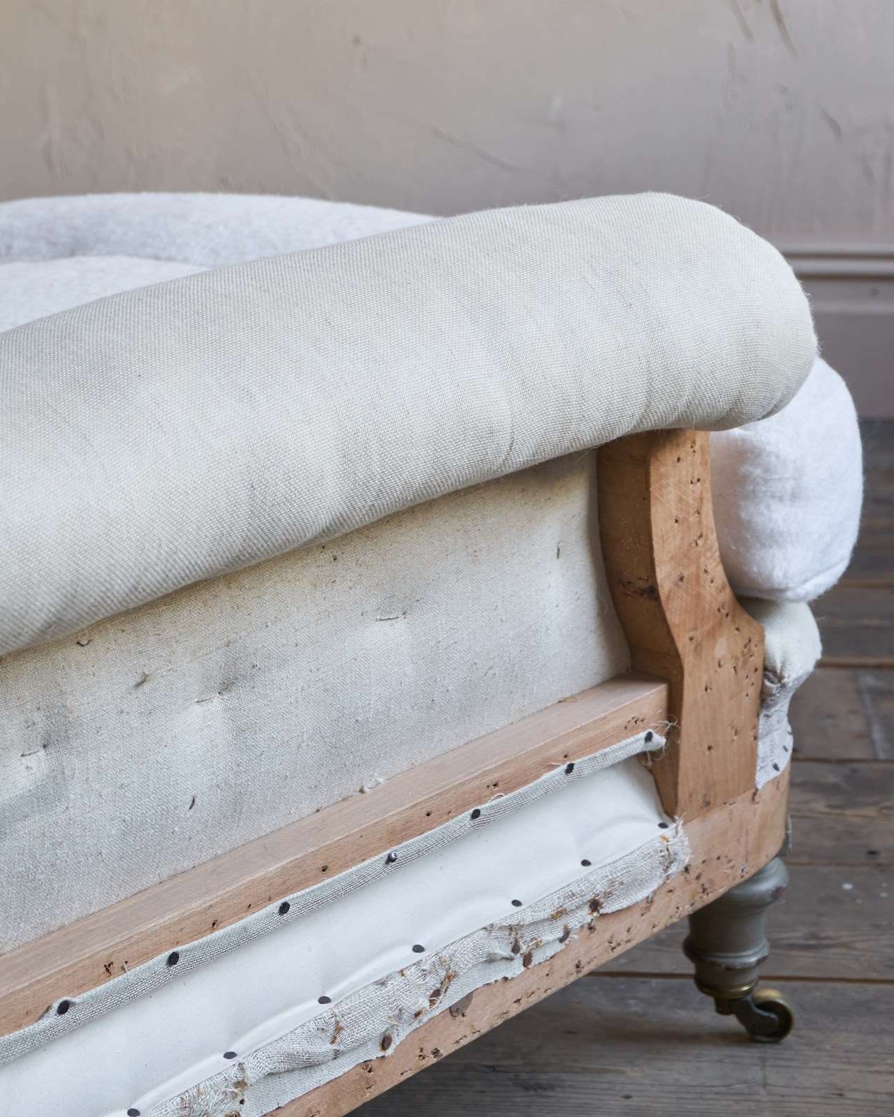 Now sympathetically restored to its undergarments, most of which is original traditional upholstery of an unusually high standard with ivory coloured horse hair, fine linen hessian and what I believe is fustian a high quality fabric with unusually deep and fur like pile.