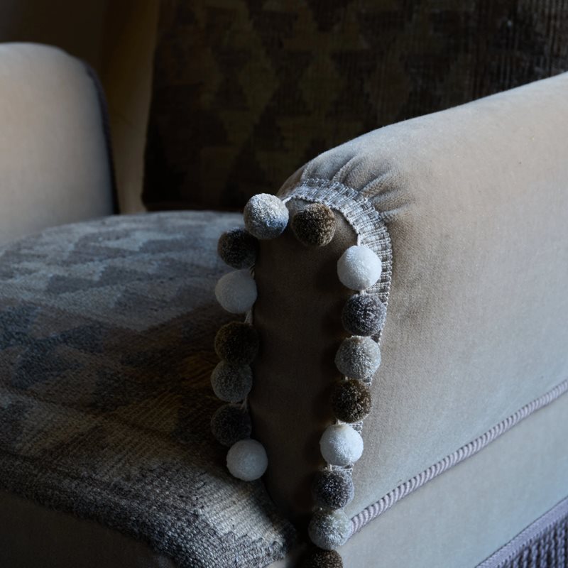 Pom poms, fringe and cord details.