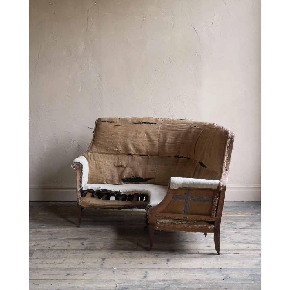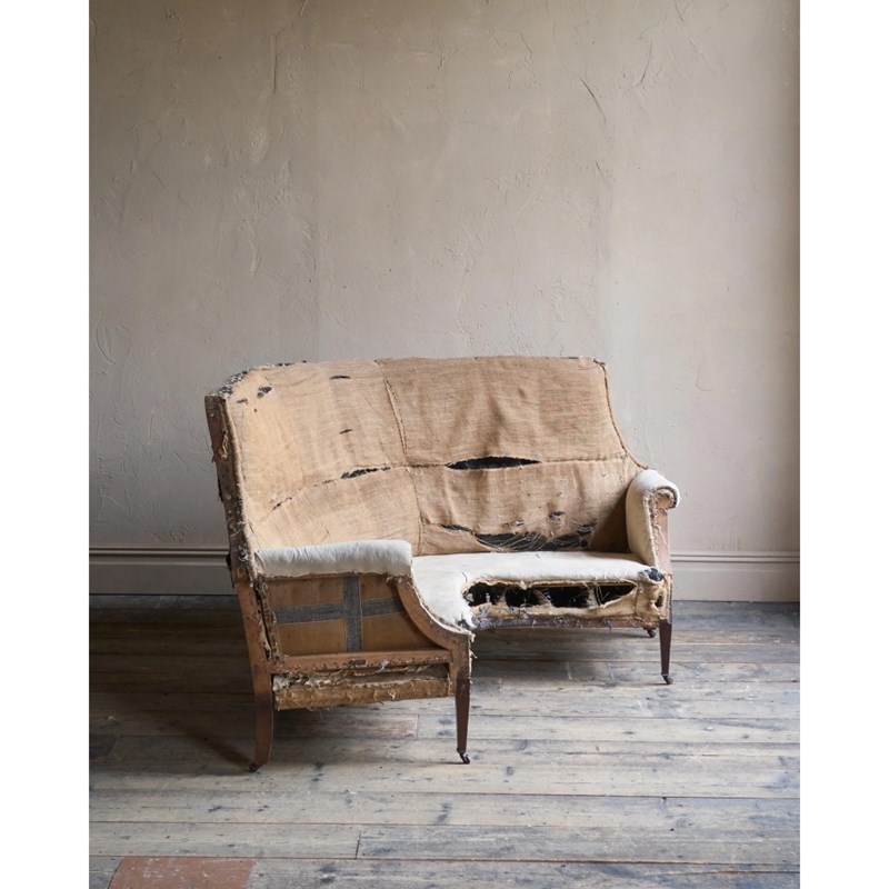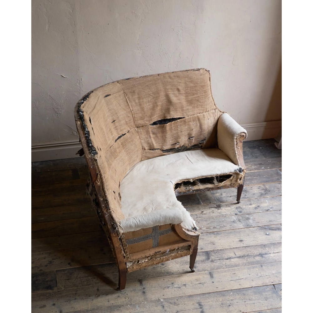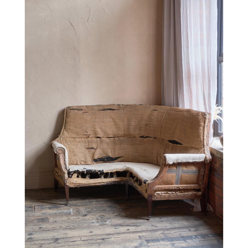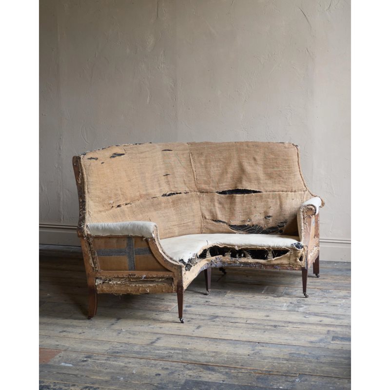 A stripped vintage corner sofa, circa 1910, showing its original upholstery layers, with tapered legs, original castors, a high back and scroll arms.